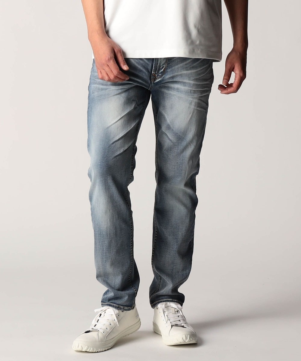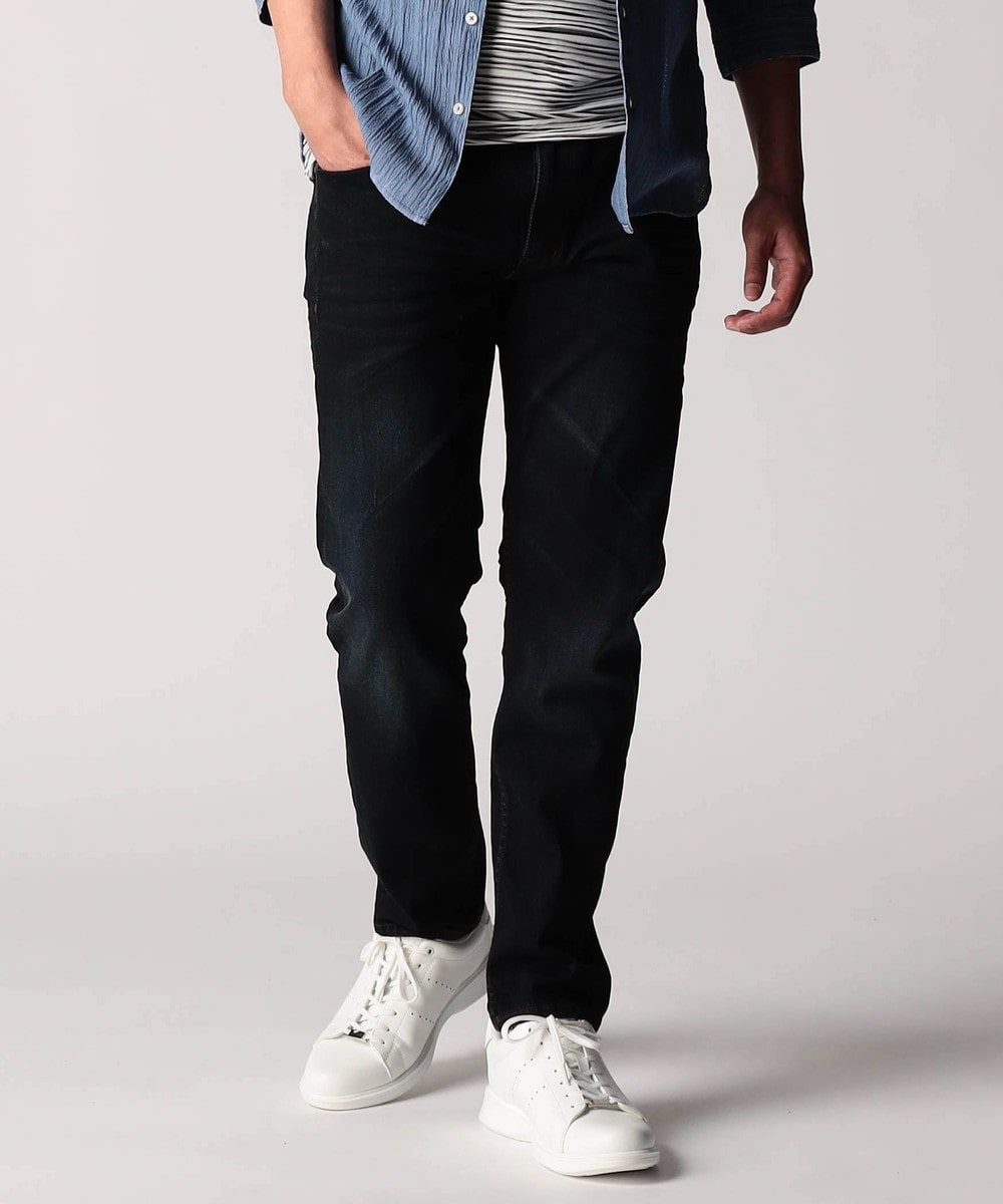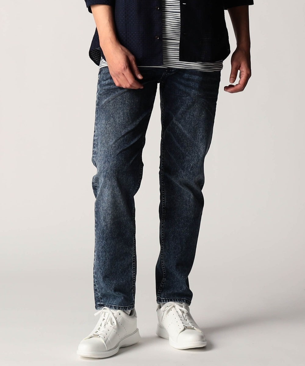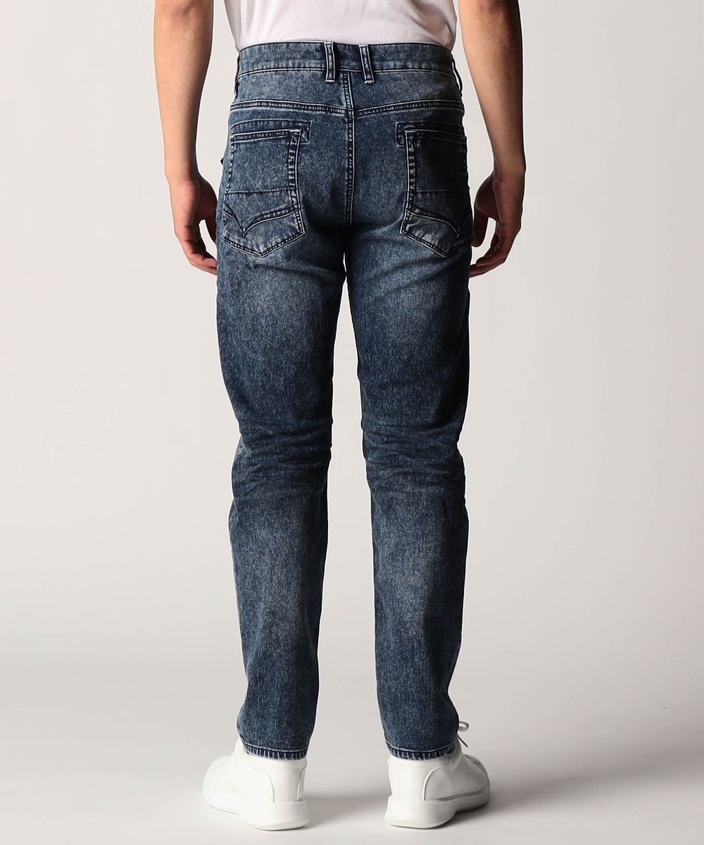 09ホワイト、製品洗いと撥水加工を施して洗い晒し感の雰囲気ある印象に仕上げ、前股・太もも内側・脇・膝裏に3Dシワ加工+薄く吹き付け加工を施しています。60ブルーは今季新色、ケミカルブリーチ加工を施してムラ感のある陰影感を出し、ユーズド+3D+吹き付け加工。64サックスは全体的に手拭きの次亜ブリーチ加工を施し、フェードしたブルーカラーにユーズド+3D+吹き付け加工。67ネイビーはブラスト加工で色差をしっかり出したユーズド加工後、黒のオーバーダイ加工で全体を濃く仕上げ、3Dシワ加工+黒顔料の吹き付け加工を施してシワに陰影感をつけています。
