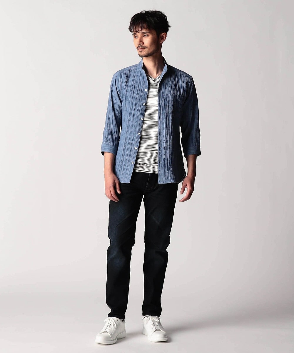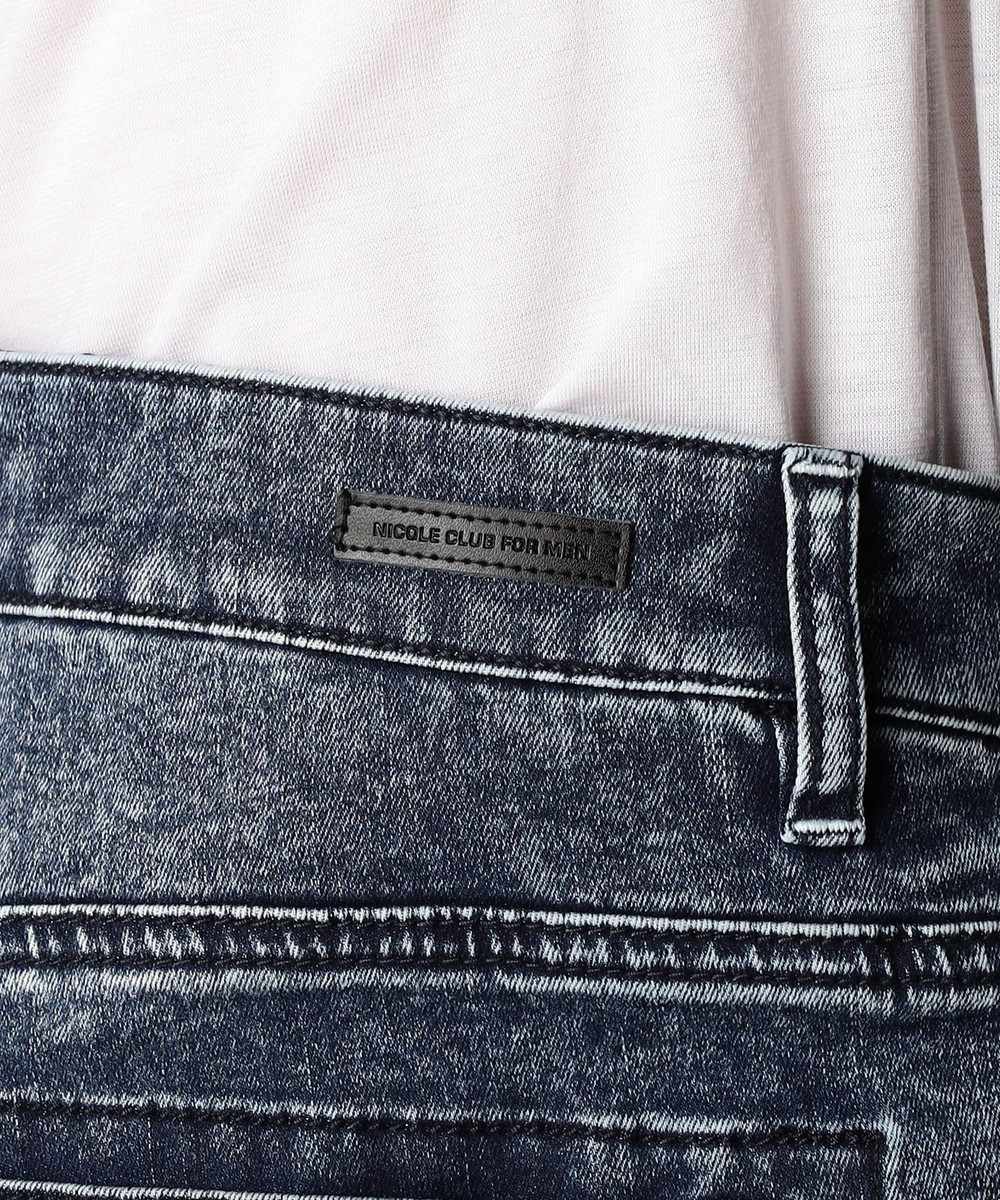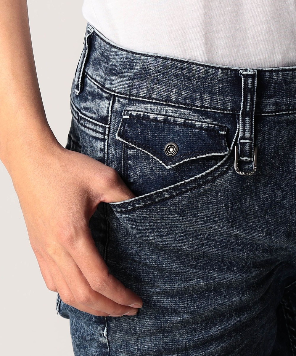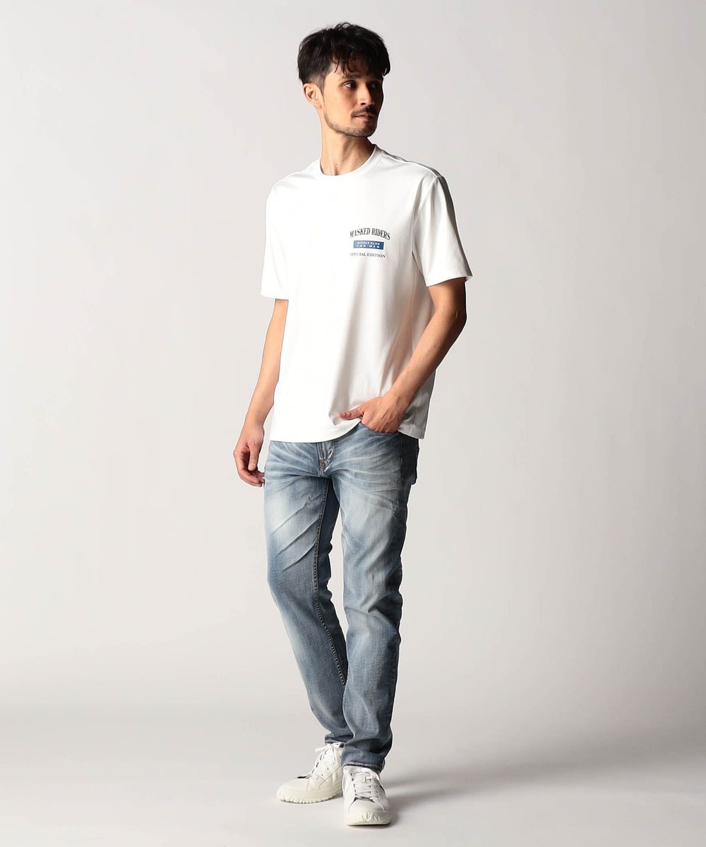 09ホワイト、製品洗いと撥水加工を施して洗い晒し感の雰囲気ある印象に仕上げ、前股・太もも内側・脇・膝裏に3Dシワ加工+薄く吹き付け加工を施しています。60ブルーは今季新色、ケミカルブリーチ加工を施してムラ感のある陰影感を出し、ユーズド+3D+吹き付け加工。64サックスは全体的に手拭きの次亜ブリーチ加工を施し、フェードしたブルーカラーにユーズド+3D+吹き付け加工。67ネイビーはブラスト加工で色差をしっかり出したユーズド加工後、黒のオーバーダイ加工で全体を濃く仕上げ、3Dシワ加工+黒顔料の吹き付け加工を施してシワに陰影感をつけています。