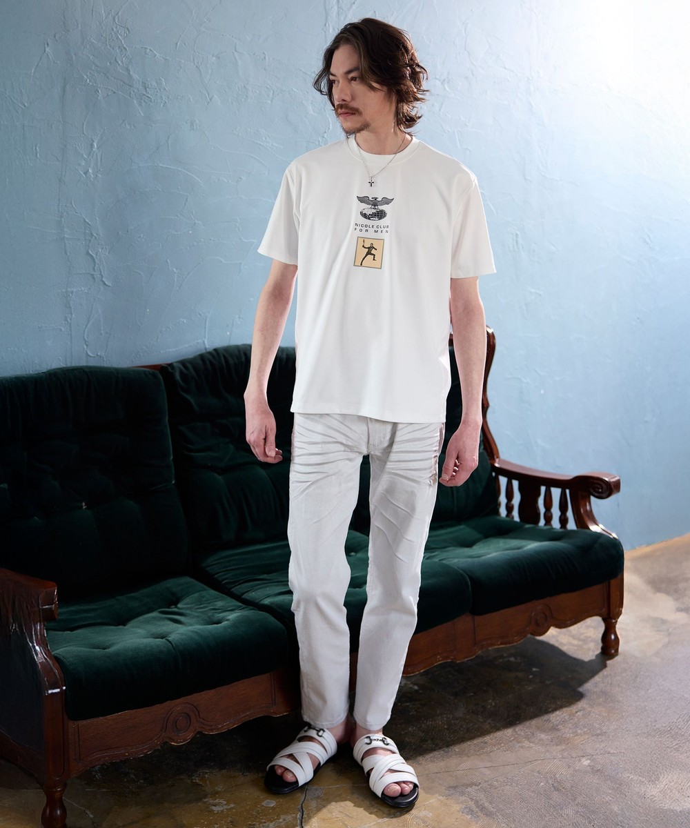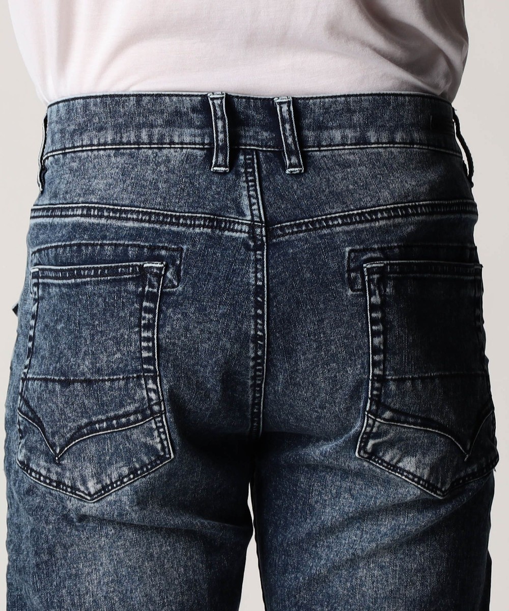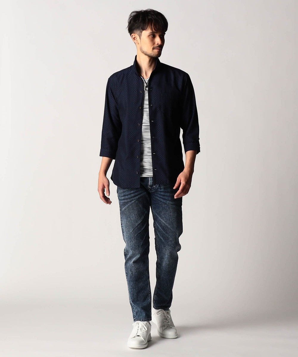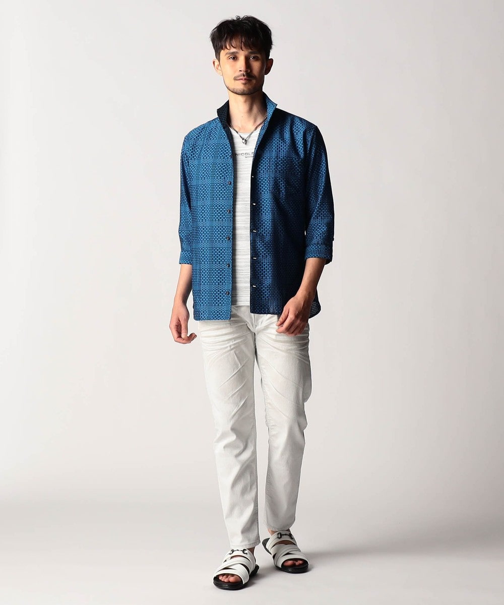 09ホワイト、製品洗いと撥水加工を施して洗い晒し感の雰囲気ある印象に仕上げ、前股・太もも内側・脇・膝裏に3Dシワ加工+薄く吹き付け加工を施しています。60ブルーは今季新色、ケミカルブリーチ加工を施してムラ感のある陰影感を出し、ユーズド+3D+吹き付け加工。64サックスは全体的に手拭きの次亜ブリーチ加工を施し、フェードしたブルーカラーにユーズド+3D+吹き付け加工。67ネイビーはブラスト加工で色差をしっかり出したユーズド加工後、黒のオーバーダイ加工で全体を濃く仕上げ、3Dシワ加工+黒顔料の吹き付け加工を施してシワに陰影感をつけています。