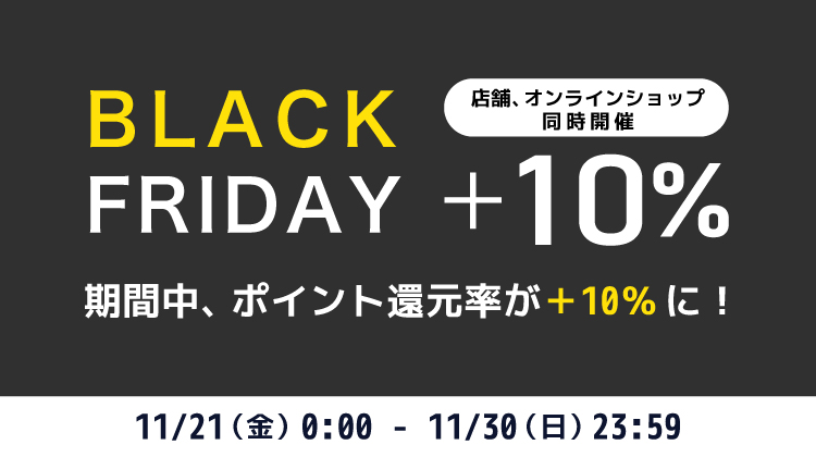 11/21(金)~11/30(日)の期間中、店舗・公式オンラインショップでのお買い物で、通常のポイントにプラス10%を上乗せしてプレゼント!