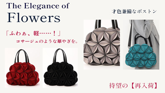 「待望の再入荷|人気の『華やぎハンドバッグ』特集。コサージュのような立体花が、いつもの装いをドラマティックに彩る