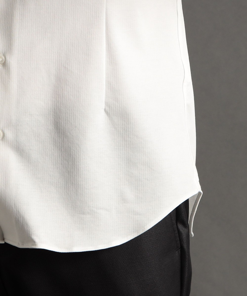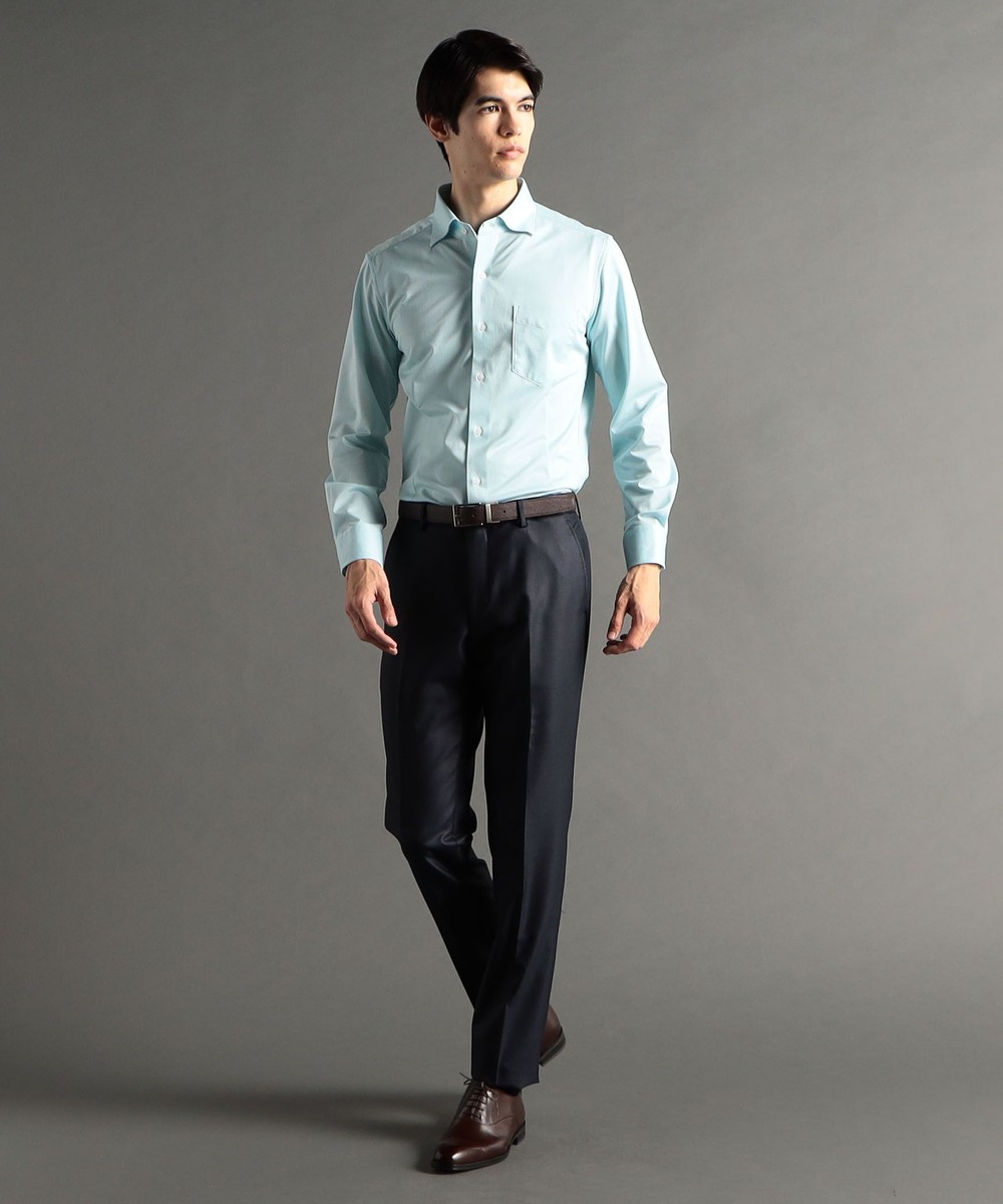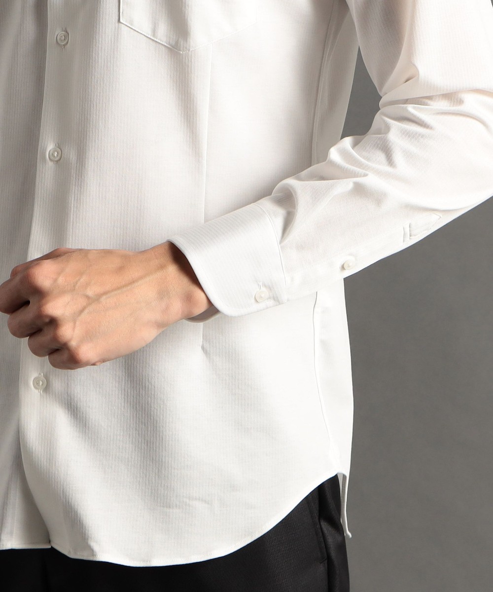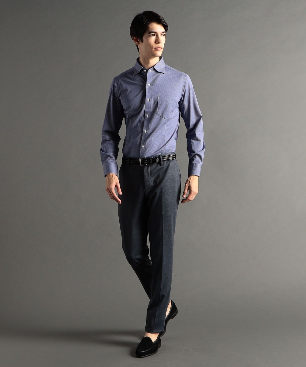 衿の跳ねを防ぐスナップダウンセミワイドカラー。ボディは適度なゆとりのあるレギュラーモデル。