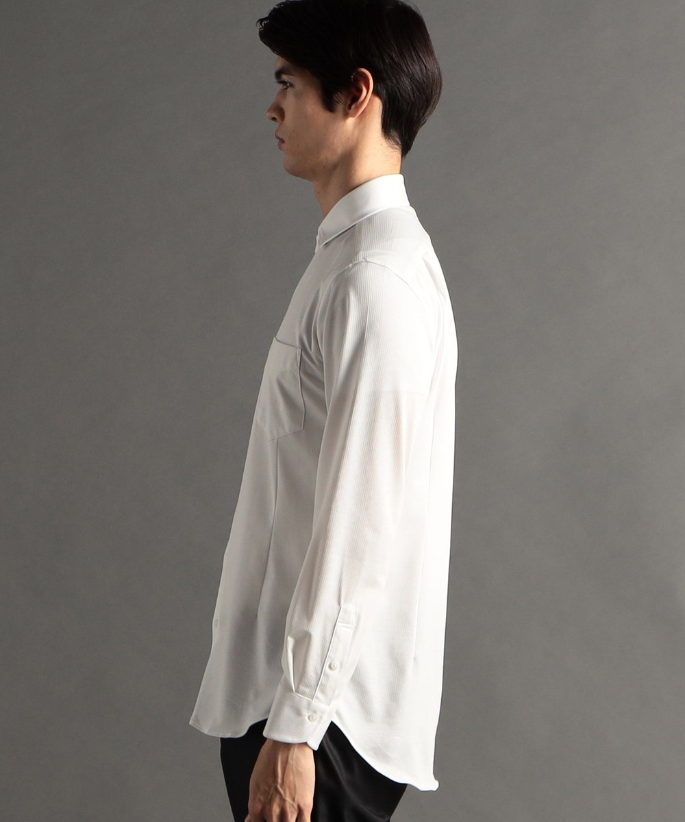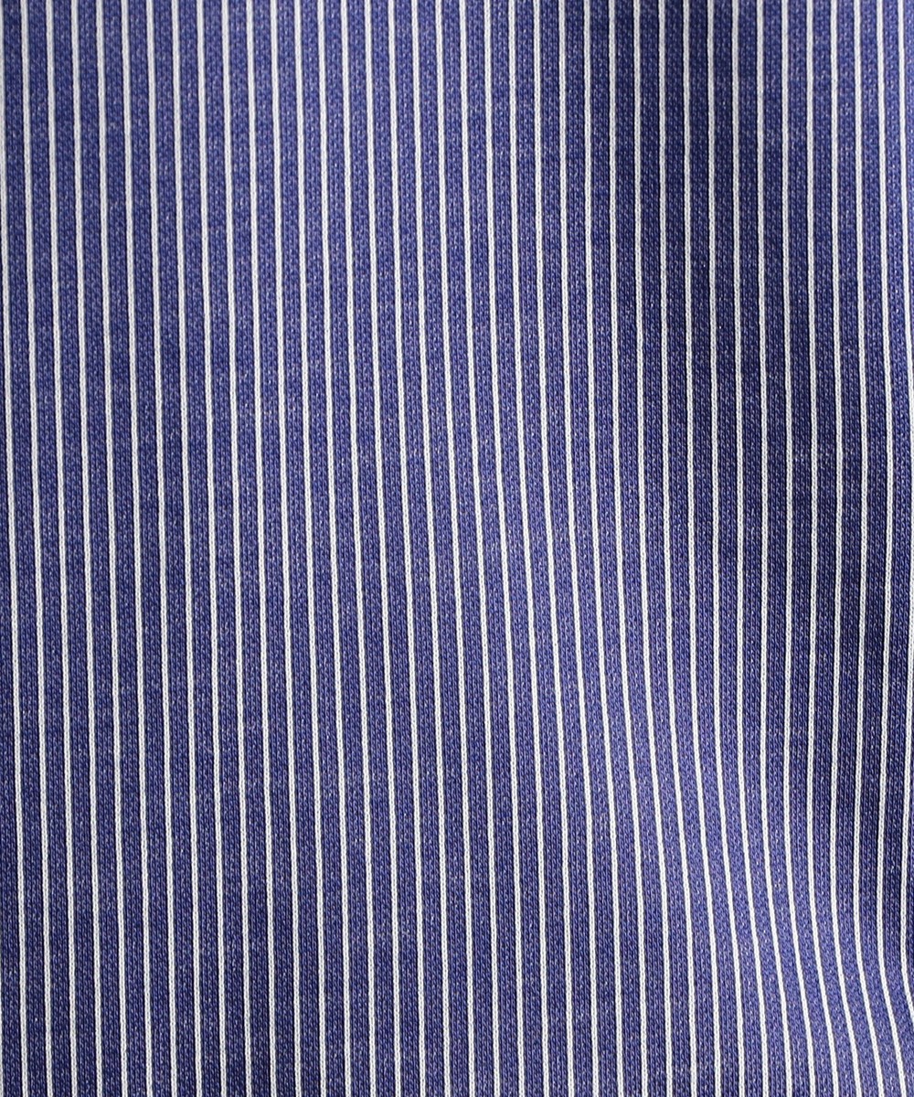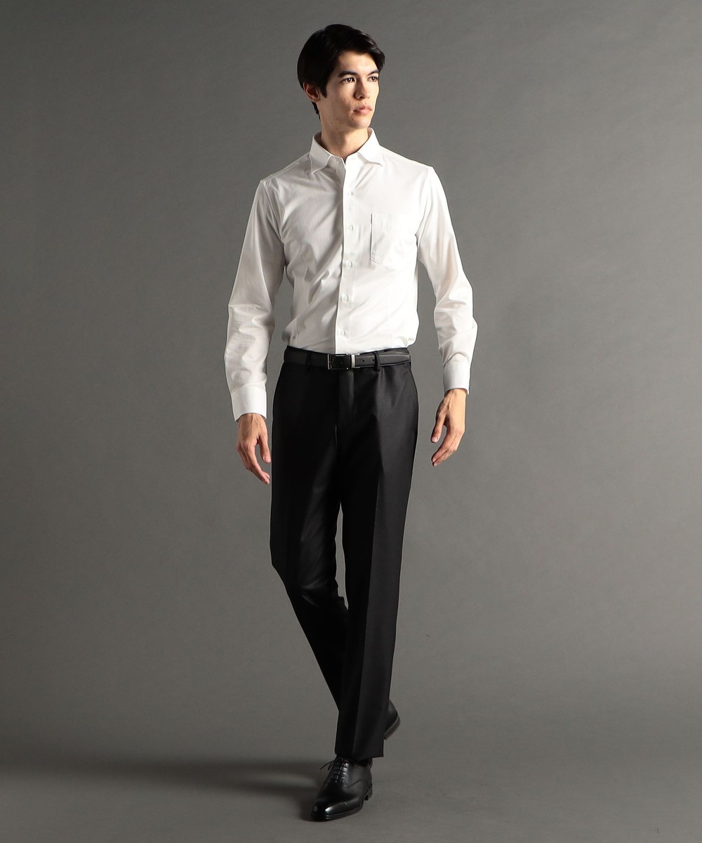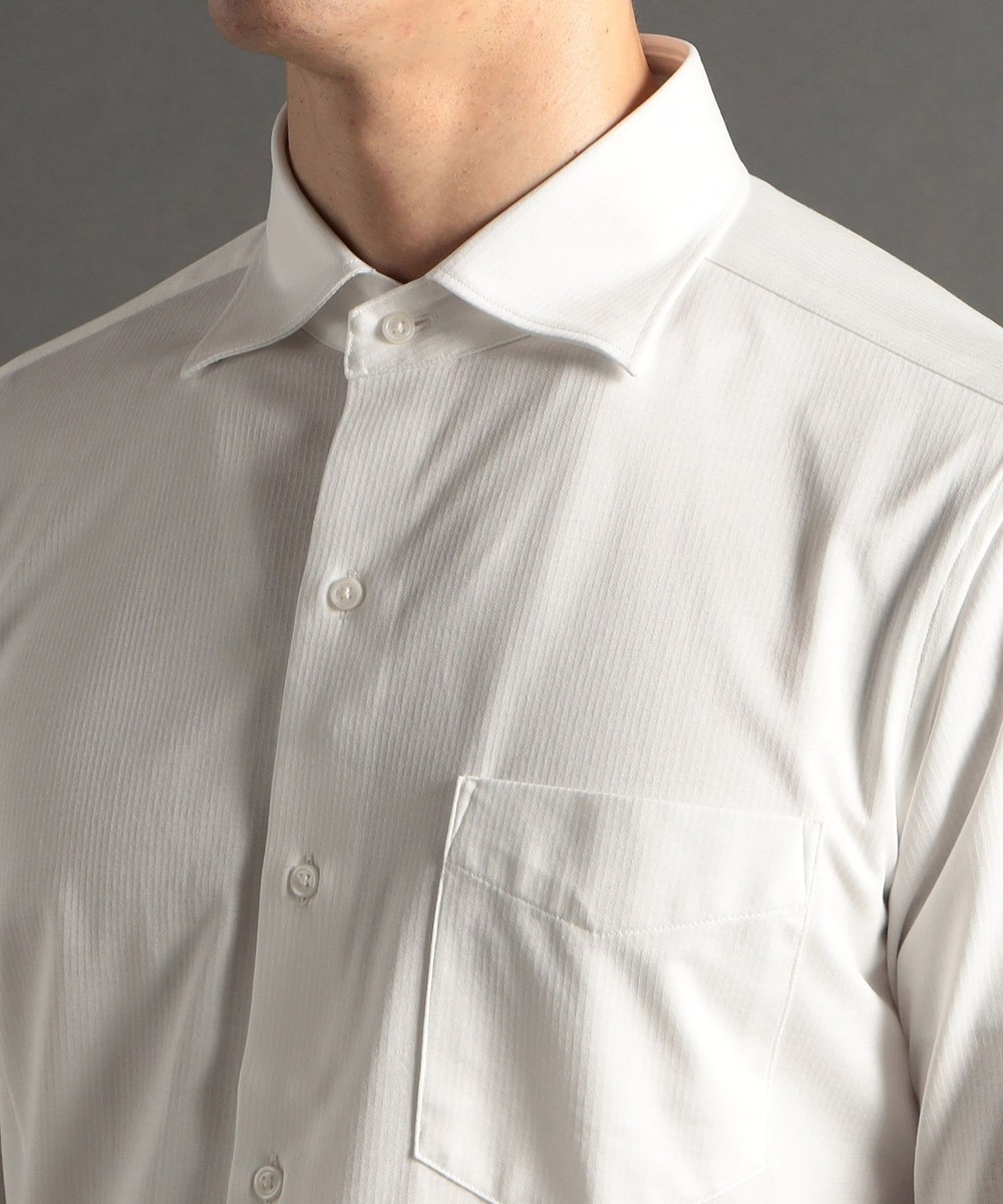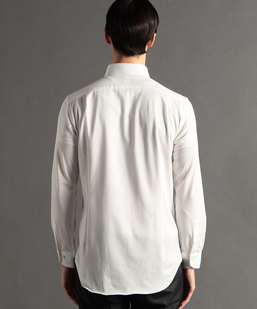 衿の跳ねを防ぐスナップダウンセミワイドカラー。ボディは適度なゆとりのあるレギュラーモデル。