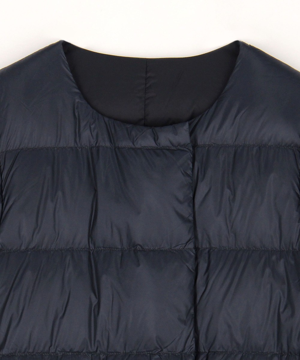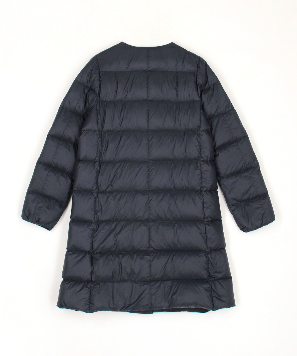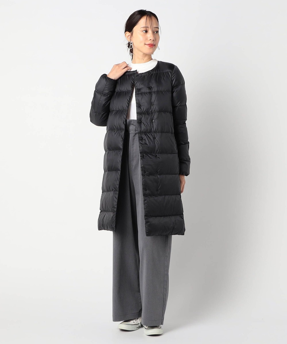 膝辺りまですっぽり隠れるノーカラーロング丈ダウンコートです。
