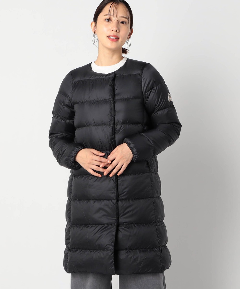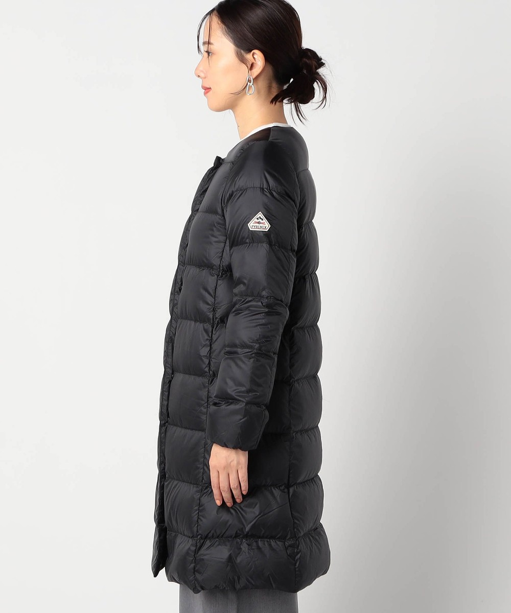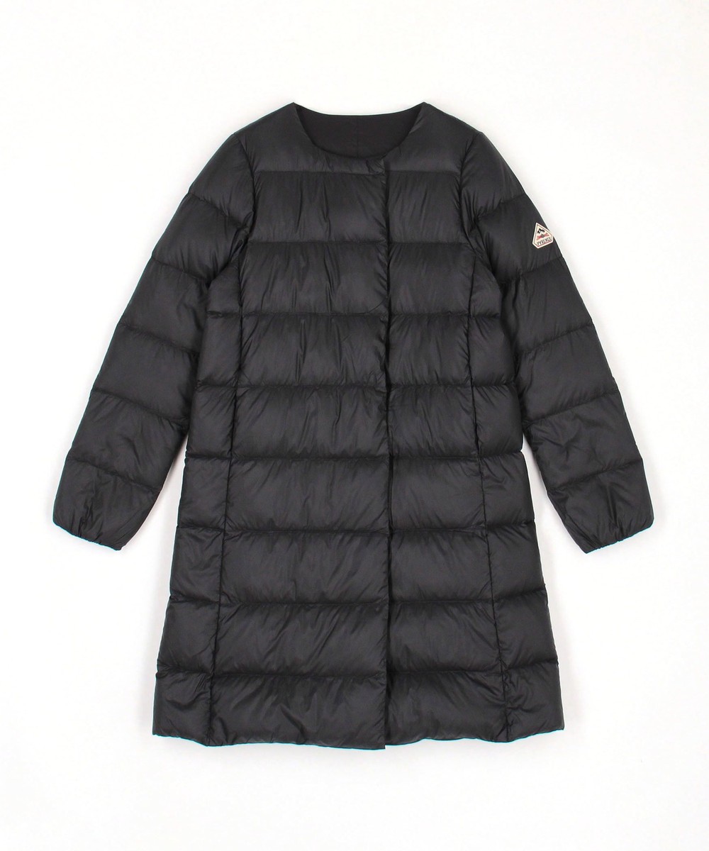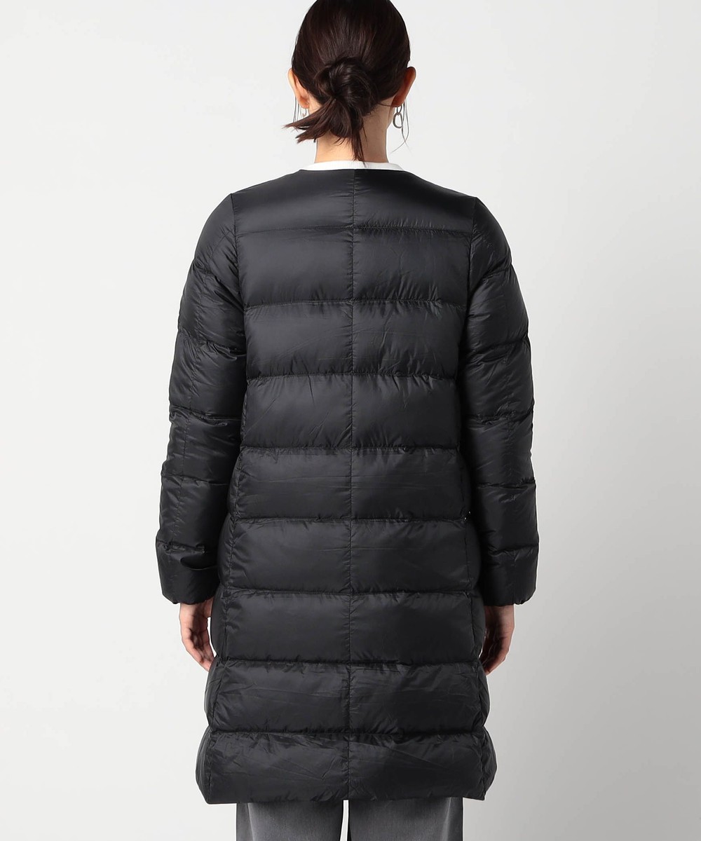 膝辺りまですっぽり隠れるノーカラーロング丈ダウンコートです。