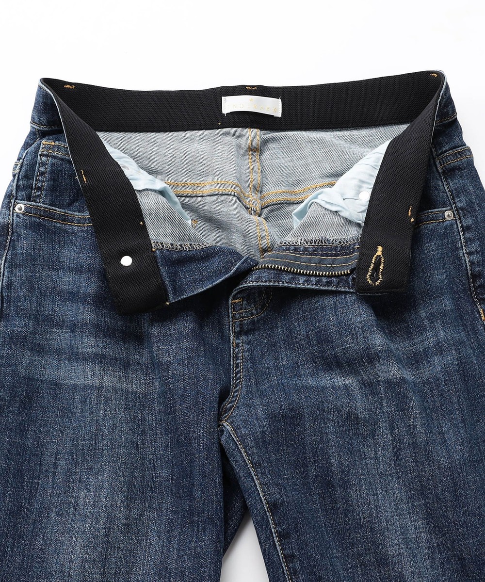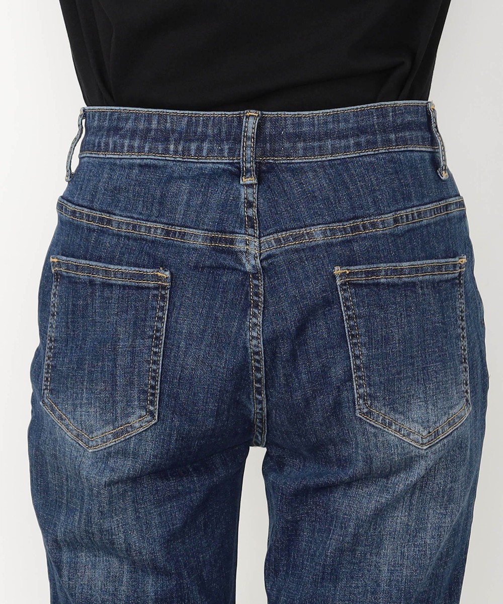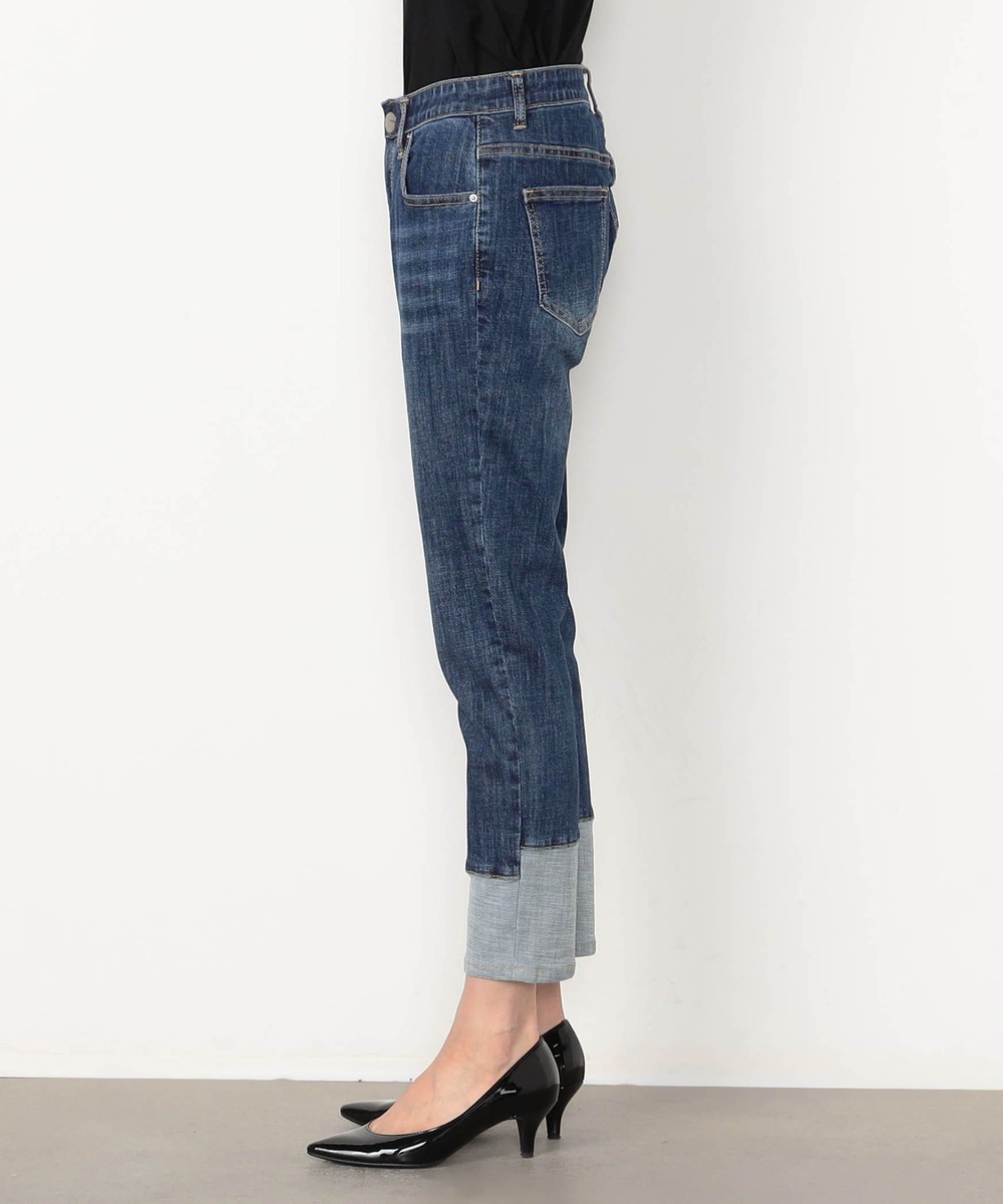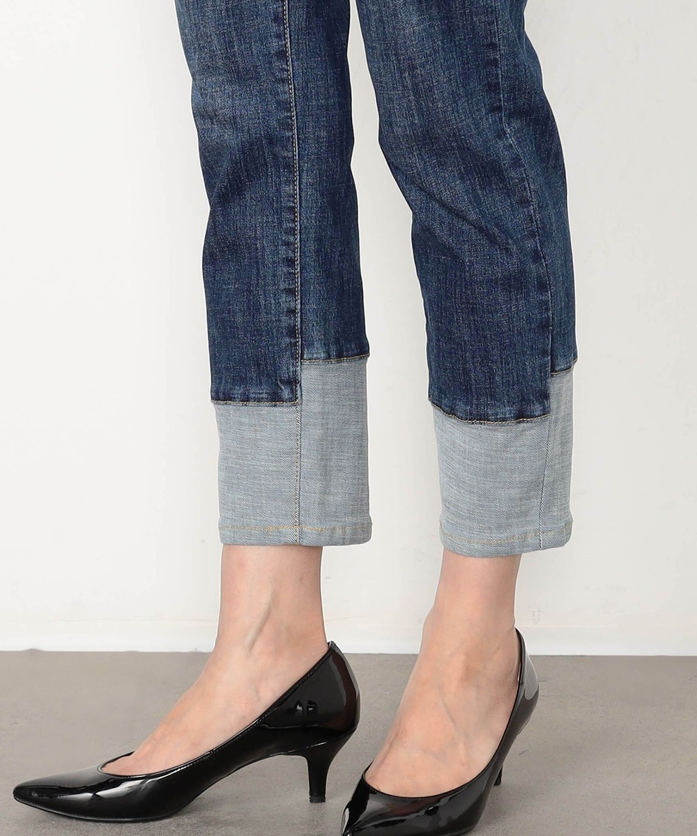裾折り返し風デザインのストレッチデニム。ウエストベルト裏を幅広の平ゴム仕様にすることで腹回りのごろつきなく動きにぴったりとフィットしストレスフリーな履き心地です。
