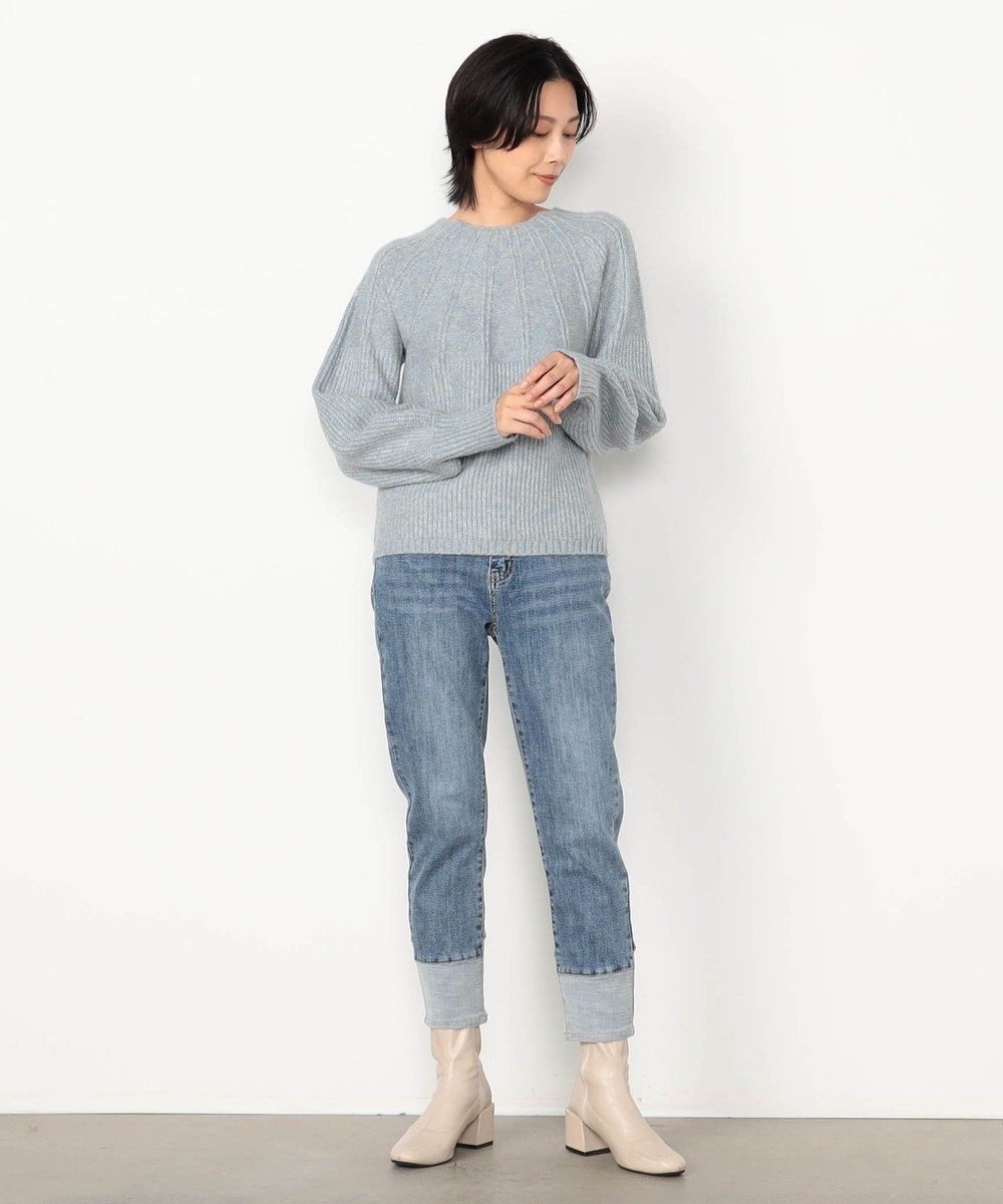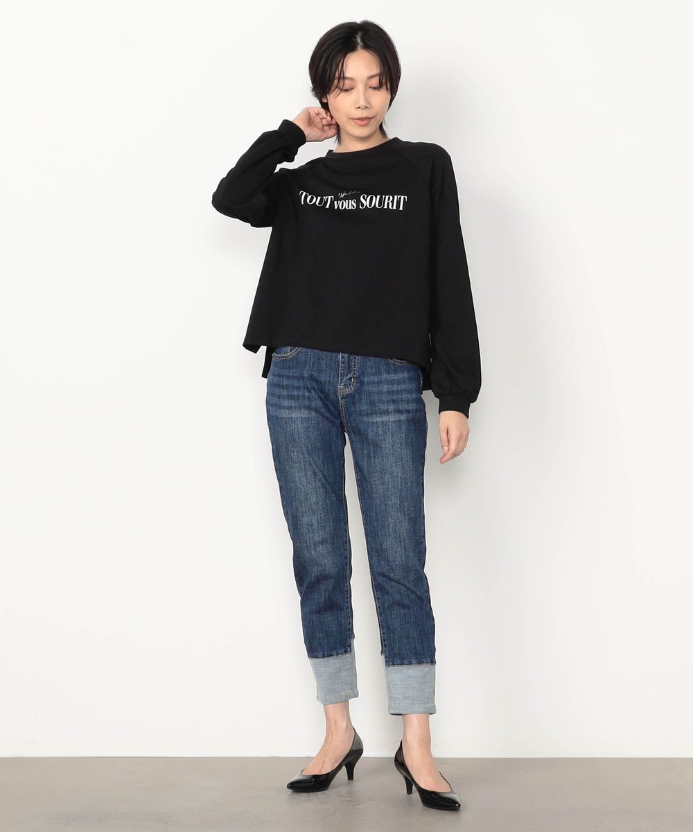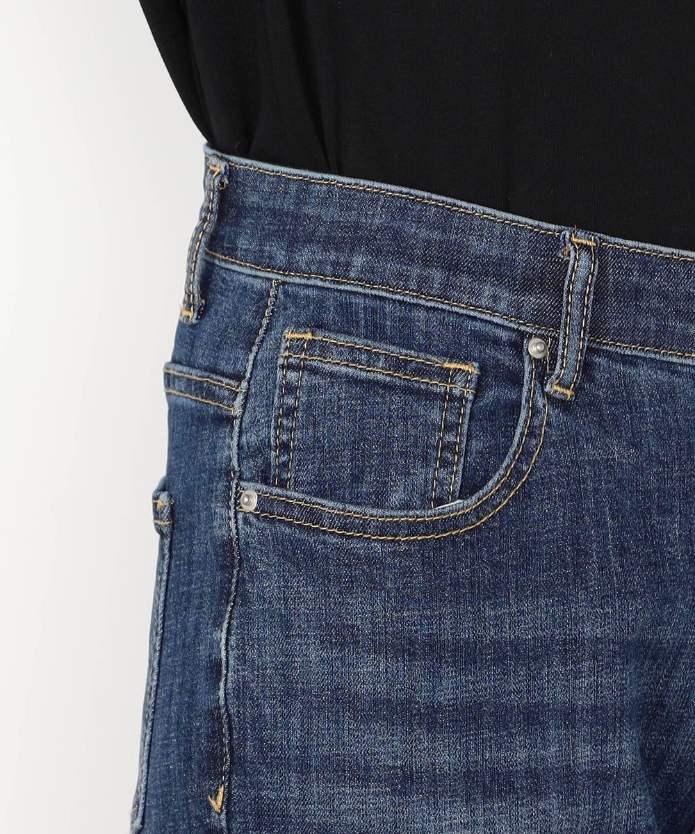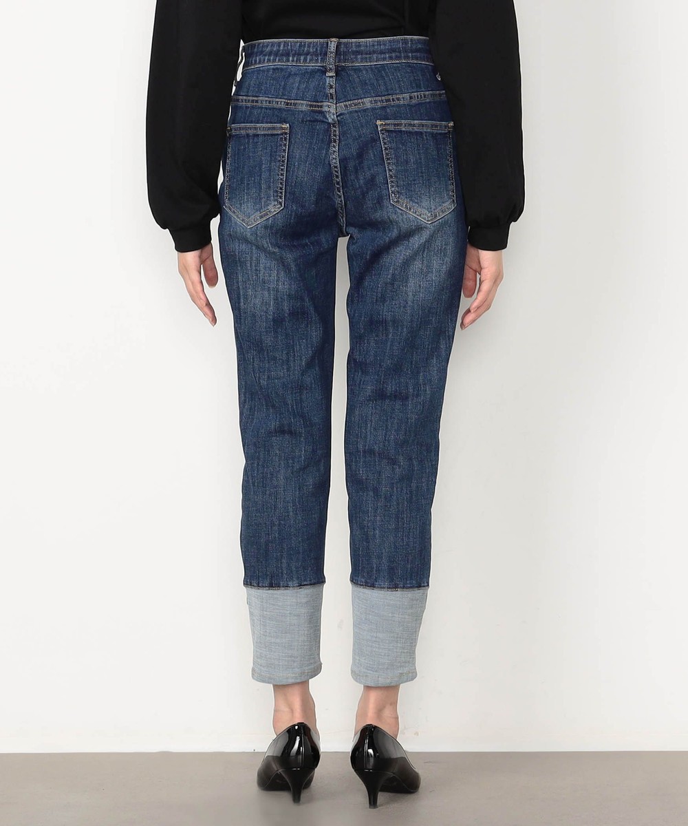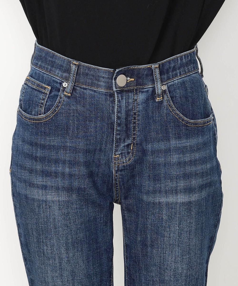 裾折り返し風デザインのストレッチデニム。ウエストベルト裏を幅広の平ゴム仕様にすることで腹回りのごろつきなく動きにぴったりとフィットしストレスフリーな履き心地です。