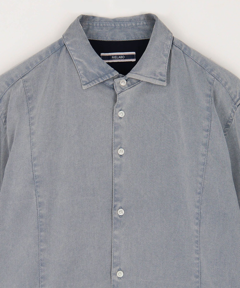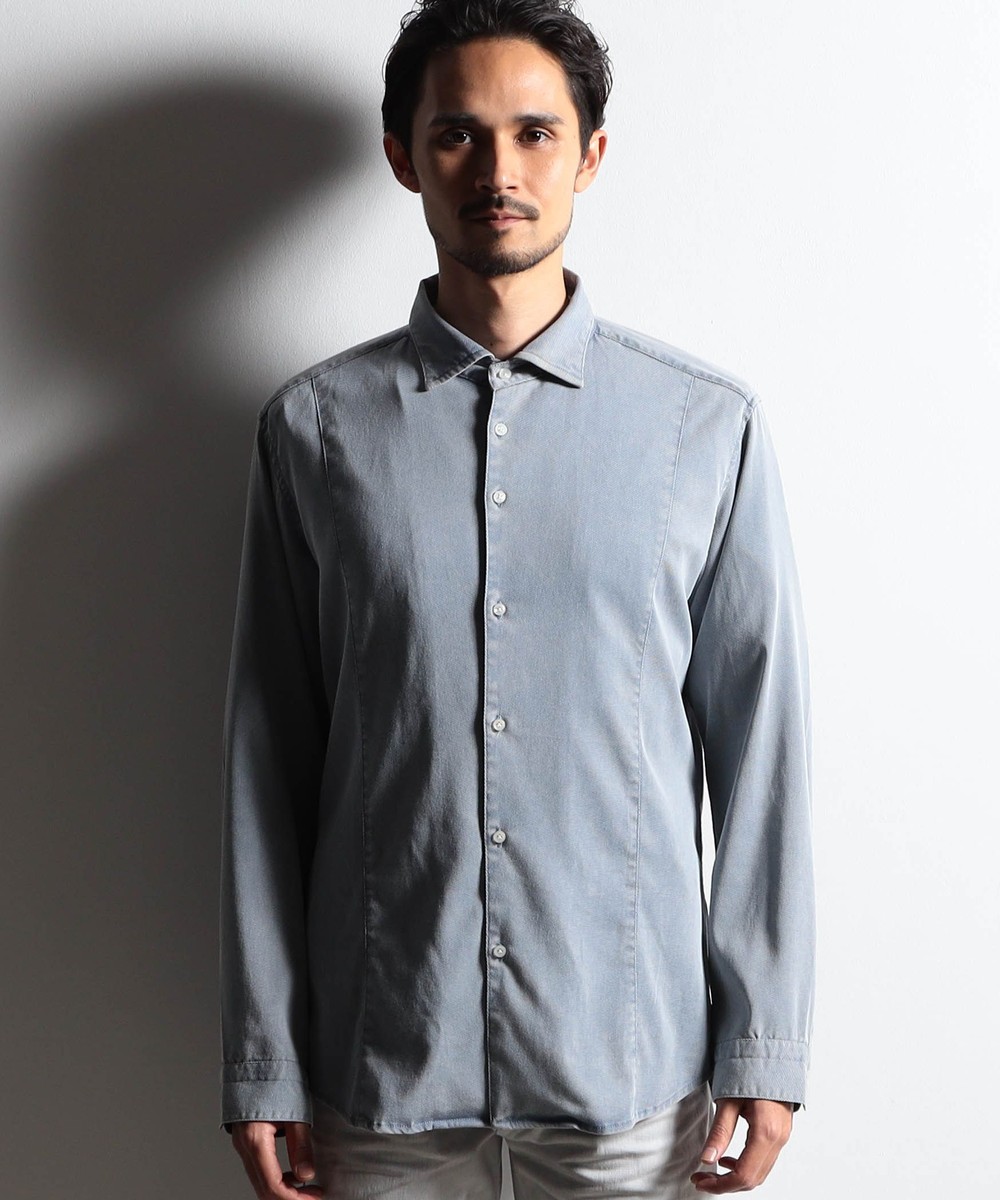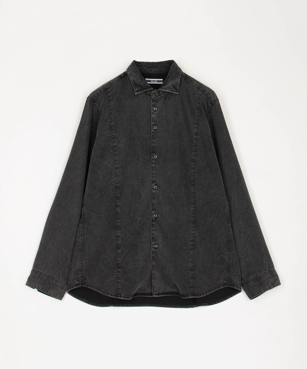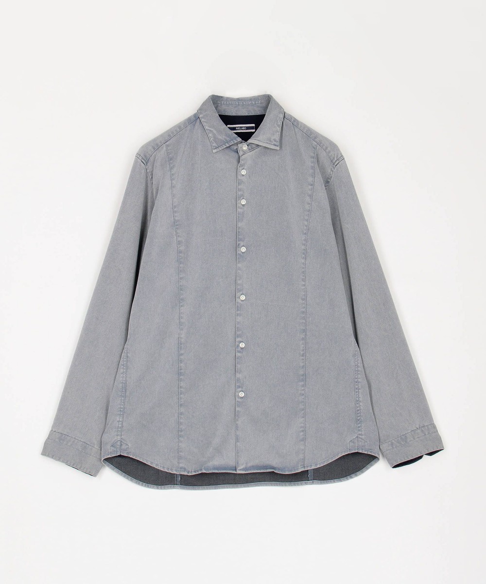 衿の前端にワイヤ-を仕込んだショートホリゾンタルカラ-シャツ。台衿から身頃のつながりを調整、釦を開けた時のVゾーンの見え方を配慮しました。身頃に入れた切り替えデザインでラインをスッキリ見せながら、加工の当たり感をポイントにしています。カフス裏など同色系のストレッチ裏地を使用してちょっとしたアクセントにしています。脇の縫い代には抗菌防臭テープを入れて機能性をプラスしています。