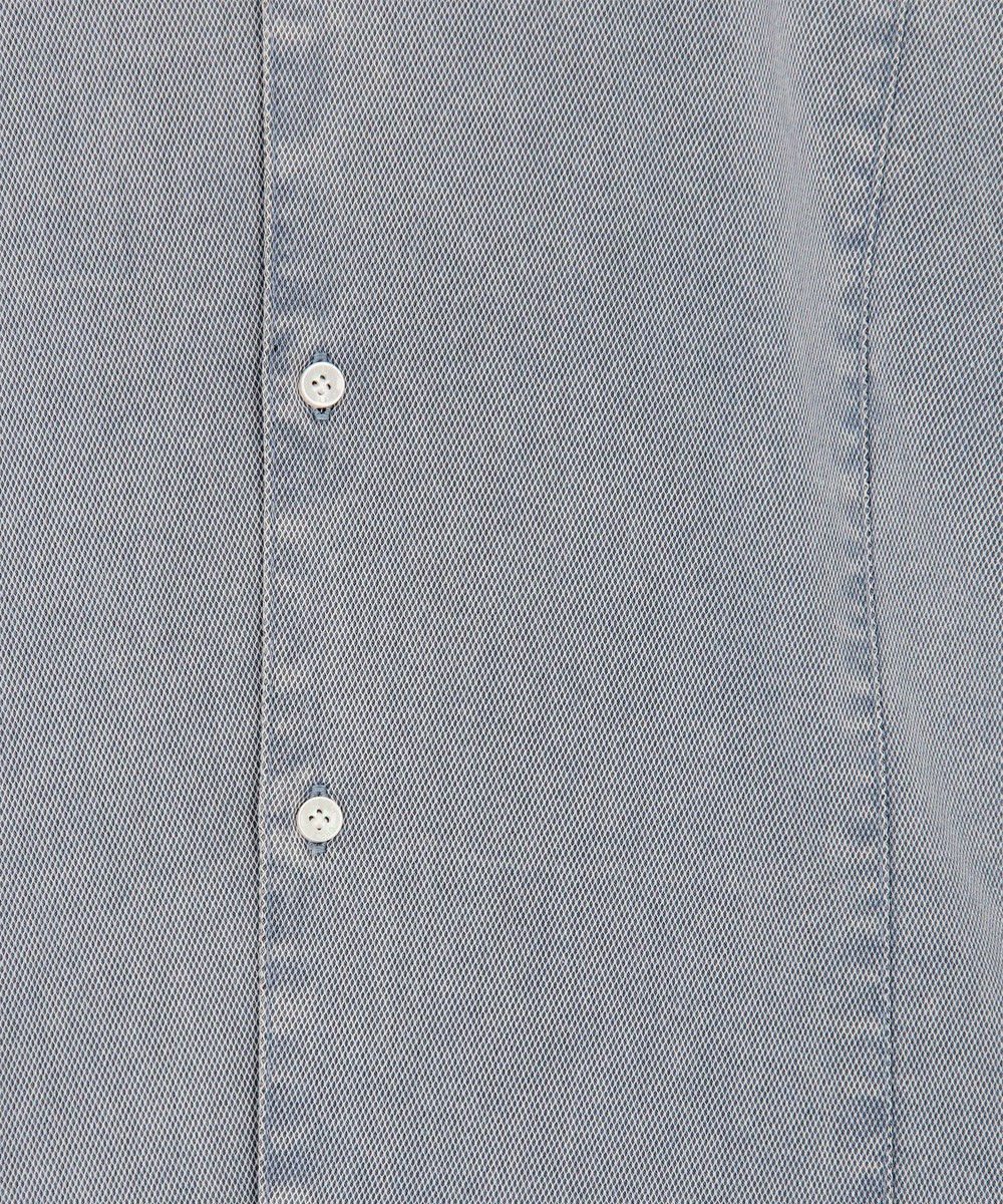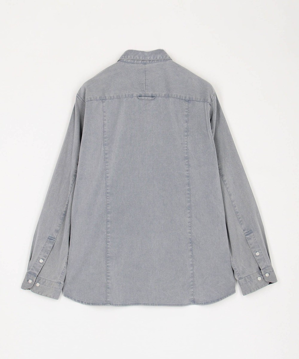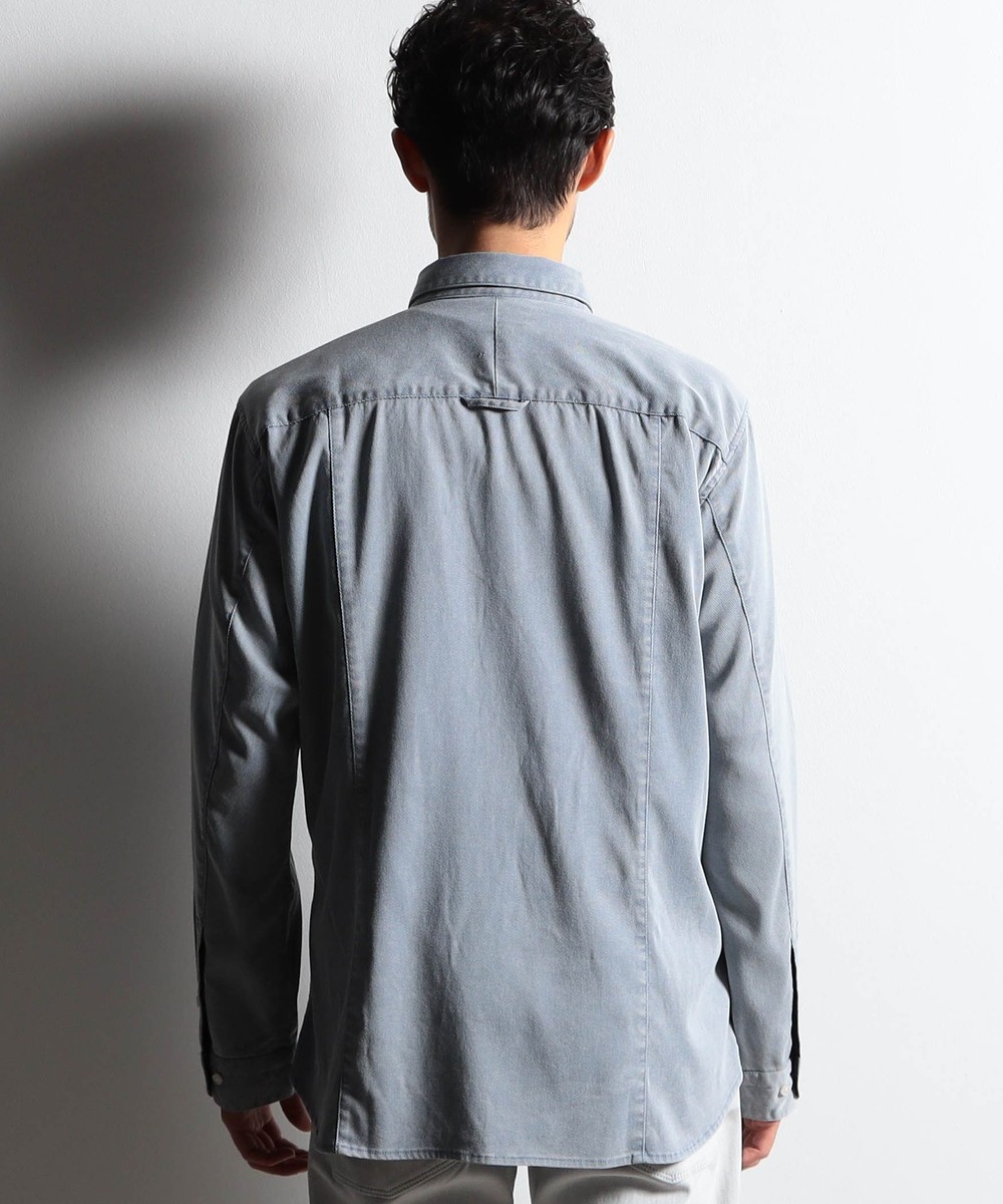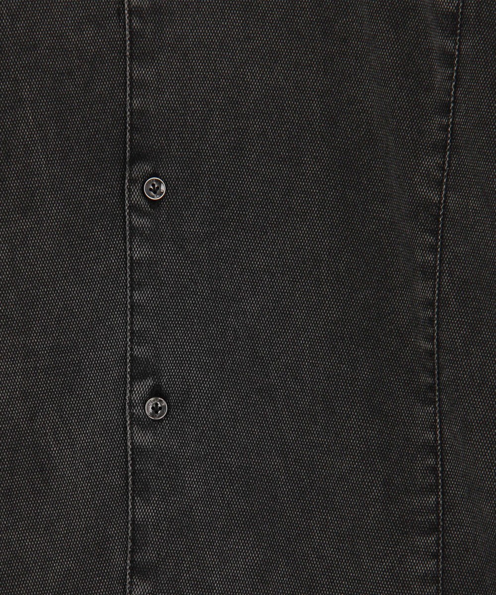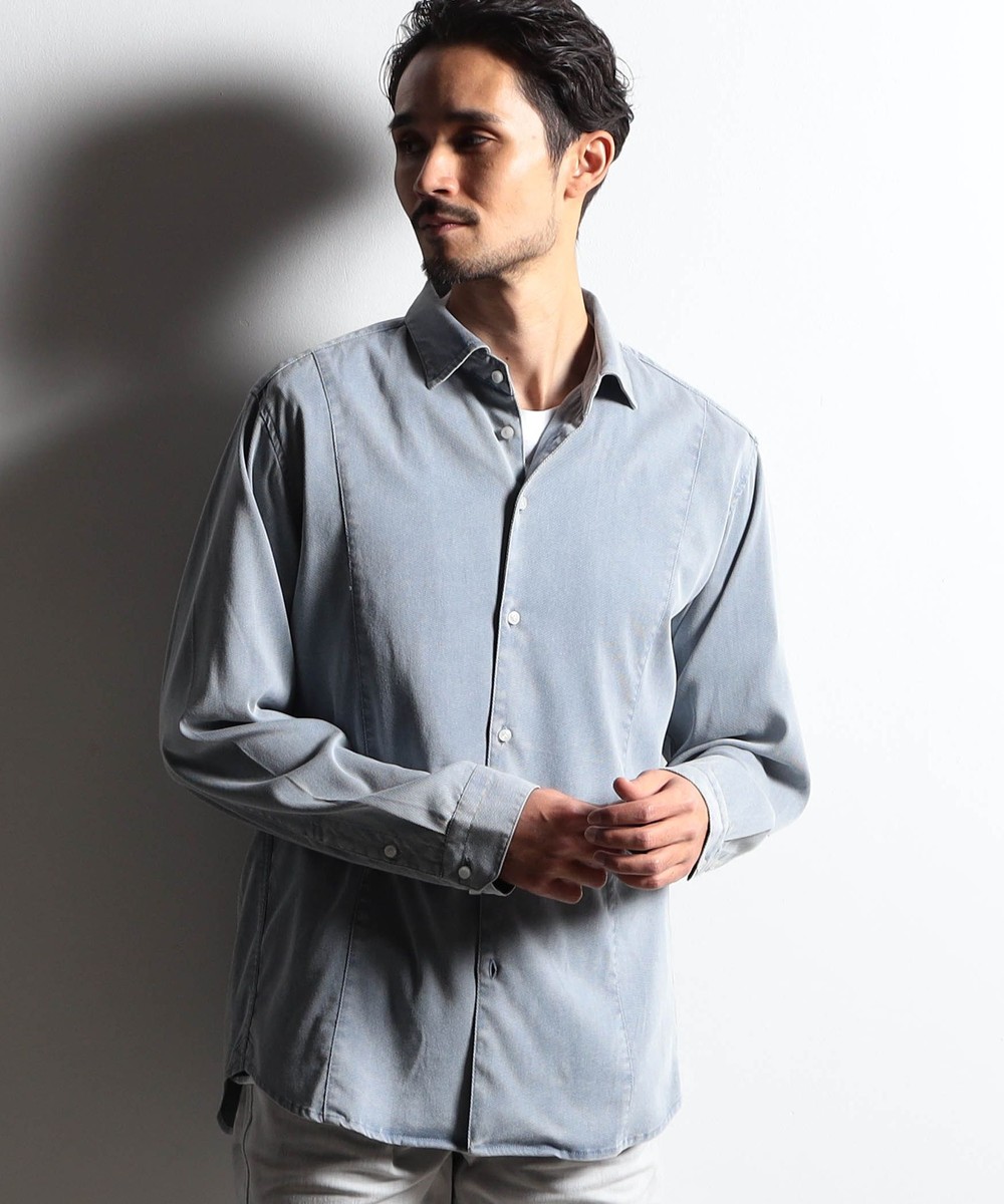 衿の前端にワイヤ-を仕込んだショートホリゾンタルカラ-シャツ。台衿から身頃のつながりを調整、釦を開けた時のVゾーンの見え方を配慮しました。身頃に入れた切り替えデザインでラインをスッキリ見せながら、加工の当たり感をポイントにしています。カフス裏など同色系のストレッチ裏地を使用してちょっとしたアクセントにしています。脇の縫い代には抗菌防臭テープを入れて機能性をプラスしています。