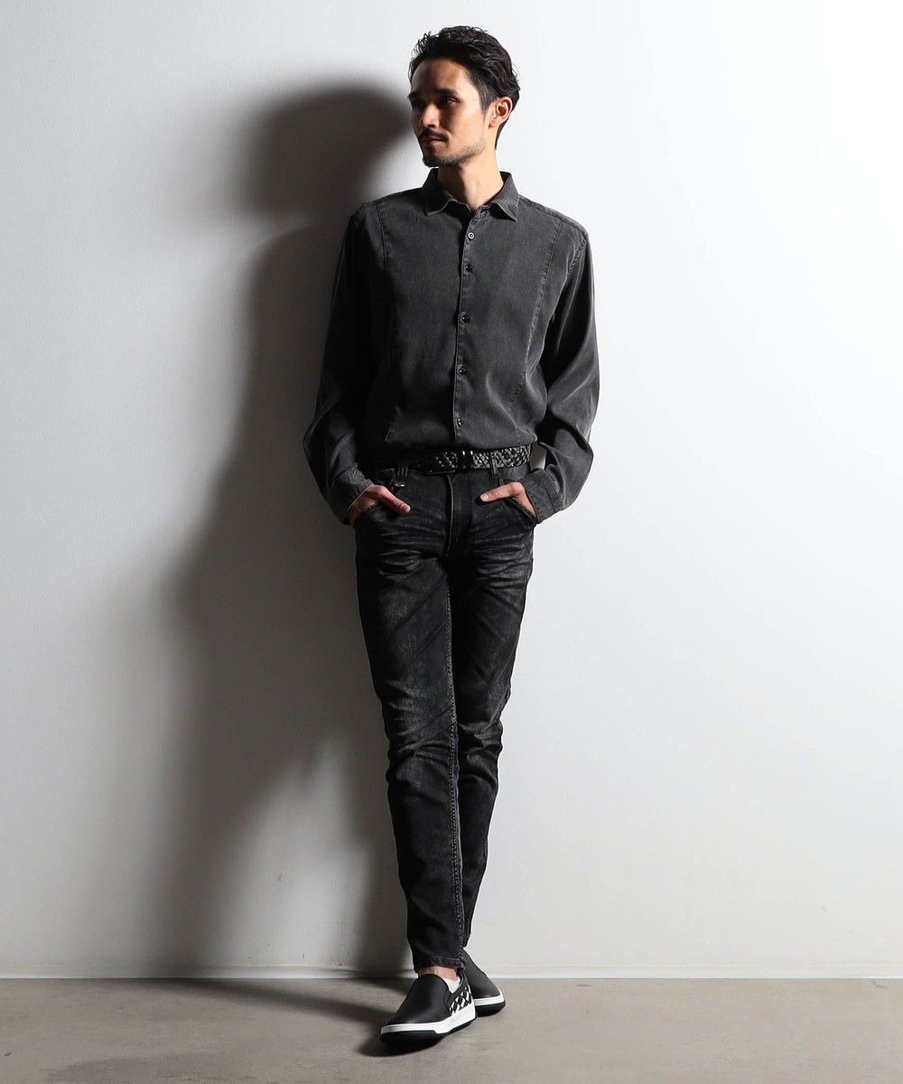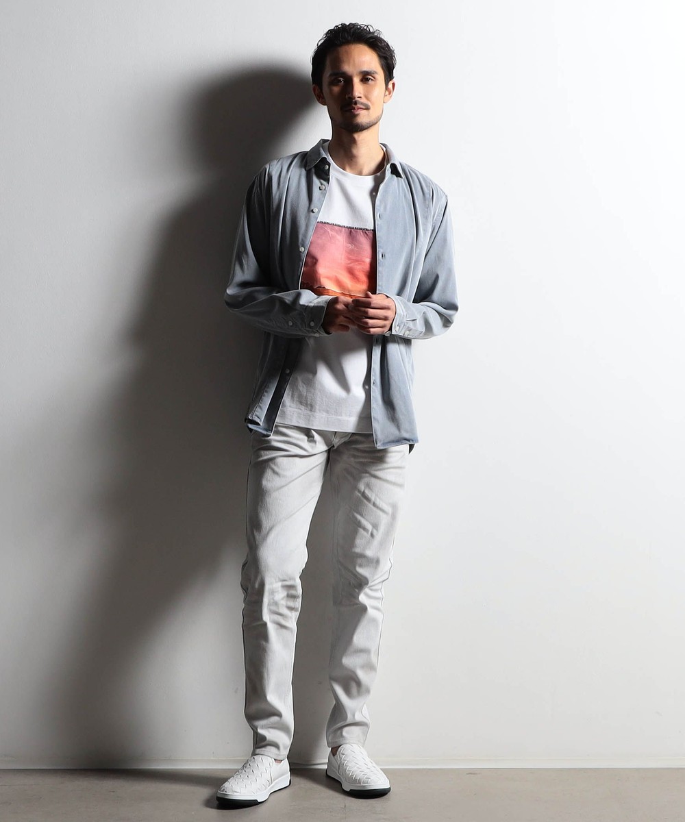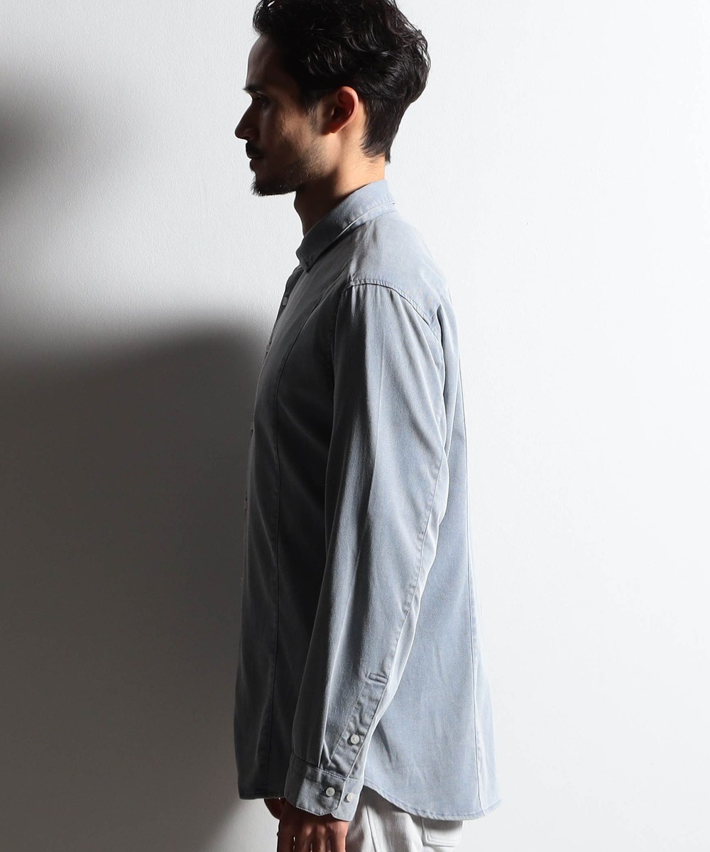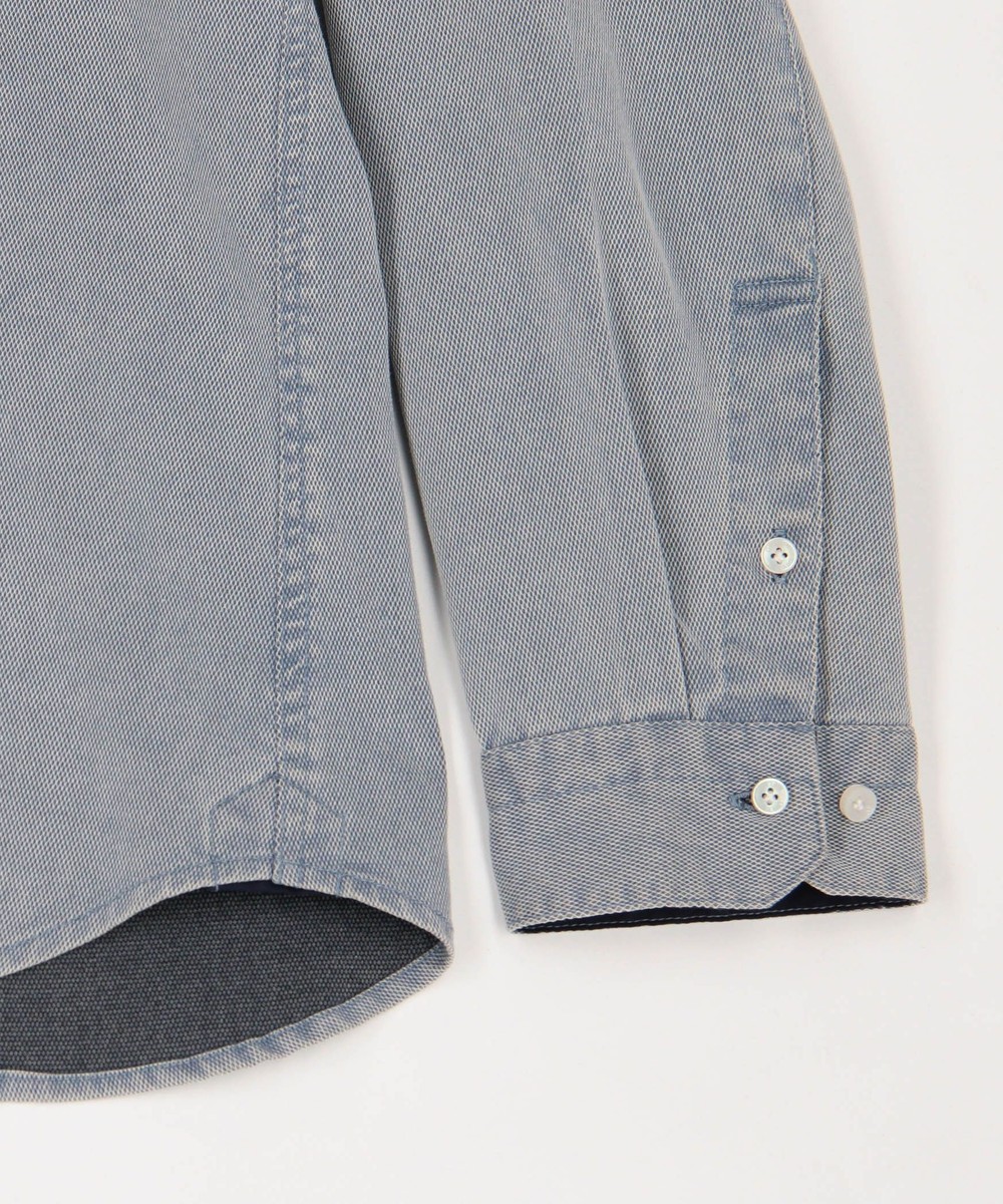 衿の前端にワイヤ-を仕込んだショートホリゾンタルカラ-シャツ。台衿から身頃のつながりを調整、釦を開けた時のVゾーンの見え方を配慮しました。身頃に入れた切り替えデザインでラインをスッキリ見せながら、加工の当たり感をポイントにしています。カフス裏など同色系のストレッチ裏地を使用してちょっとしたアクセントにしています。脇の縫い代には抗菌防臭テープを入れて機能性をプラスしています。