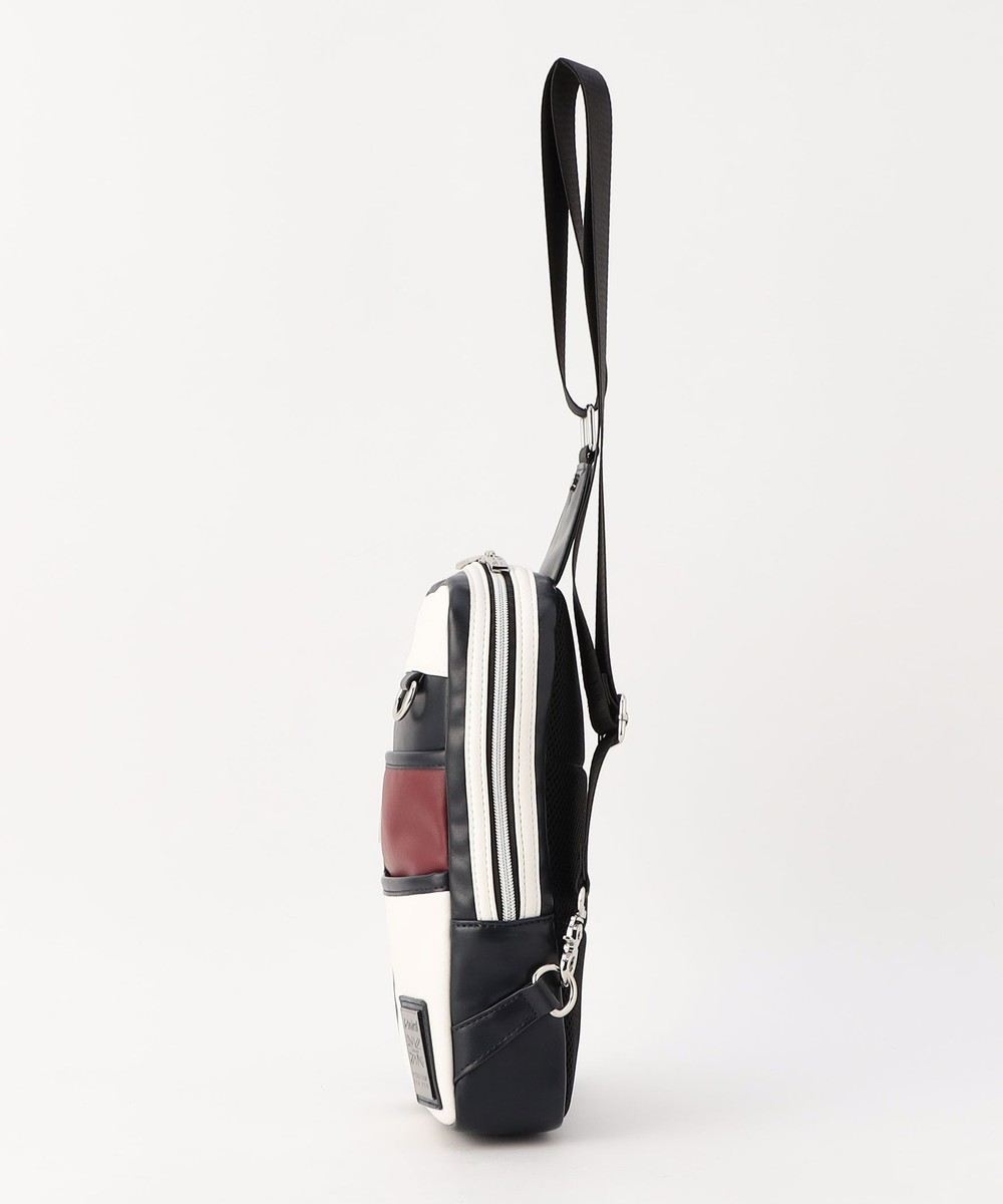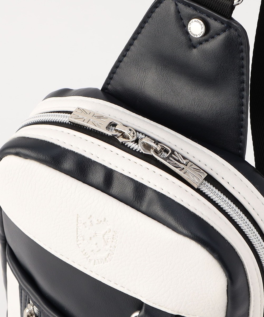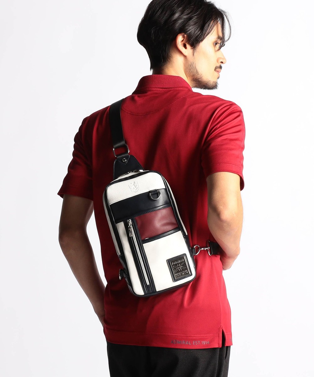 フェイクレザーに型押ししたランパントモチーフとマットなカモフラジャカードがスタイリッシュな印象のアドミラル別注ボディバッグ。機能性とデザイン性を兼ね備えたバランスの良い切替えアウトポケットがディテールポイント。メインポケットはファスナー口を大きめに設定し使い勝手も申し分ない仕上がりです。フロントに配したコラボロゴ刻印のメタルプレートも上質な雰囲気を醸し出しています。
