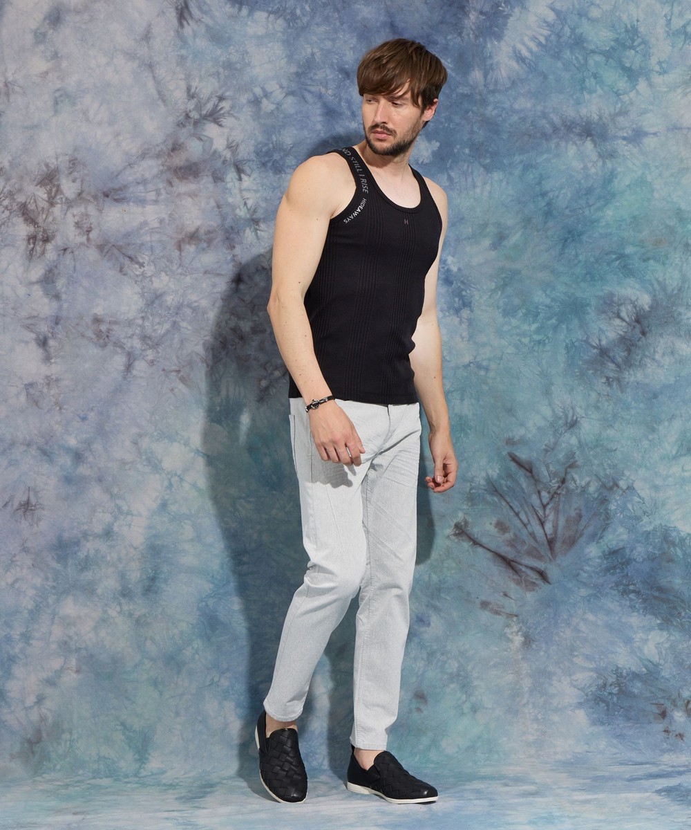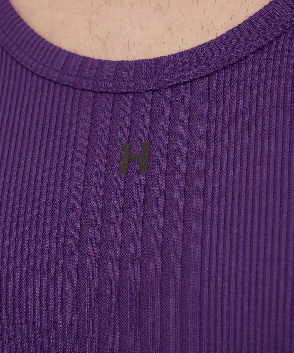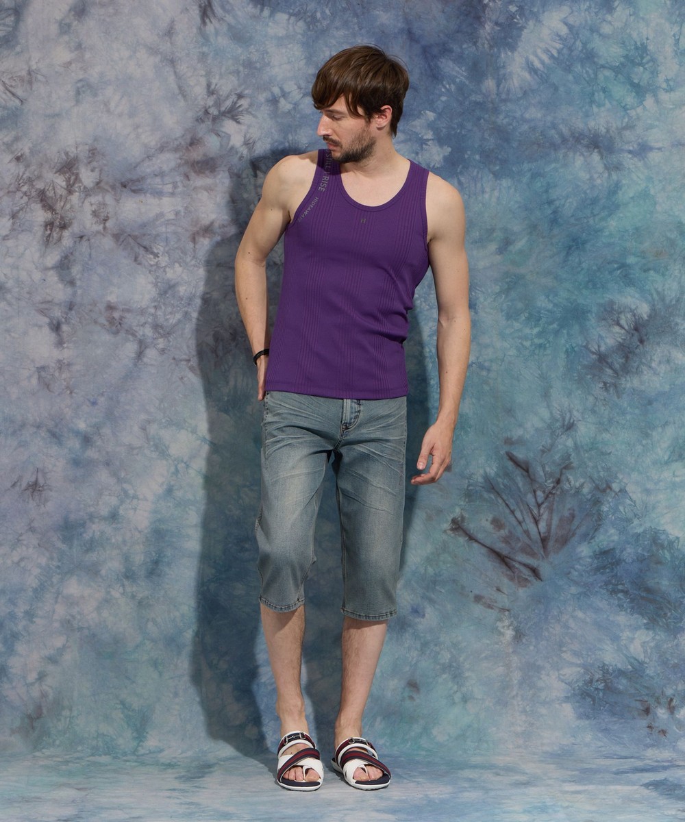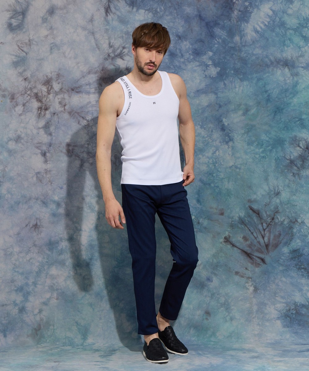 右アームホールと胸のロゴプリントがデザインポイントです。