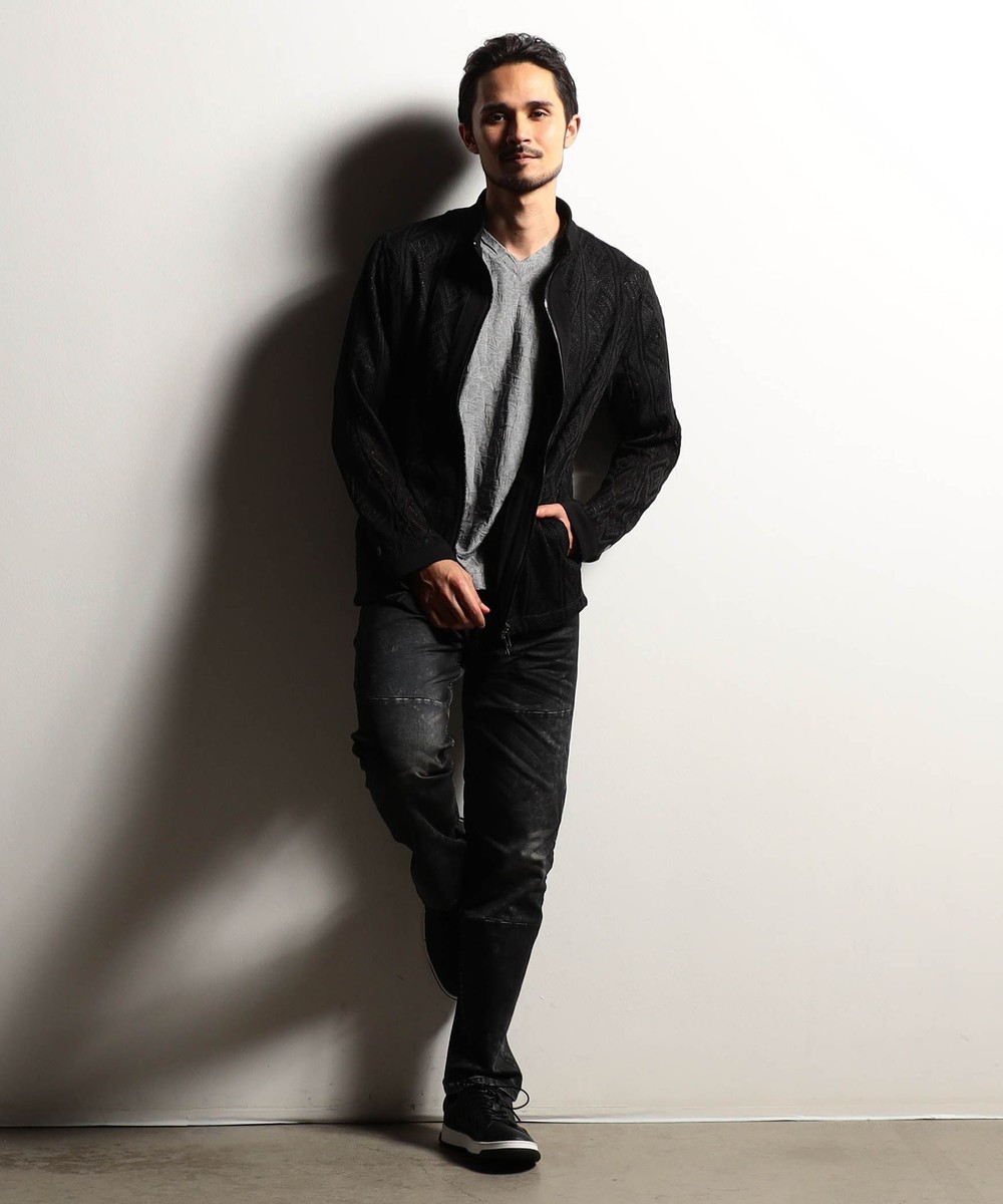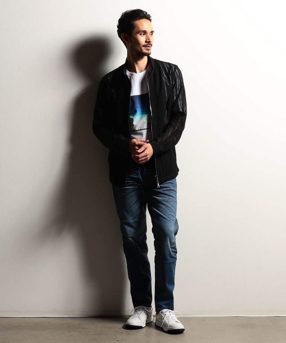 メッシュ素材でテンションがあるので、ウエストシェイプを入れたシャープな細身のシルエットです。