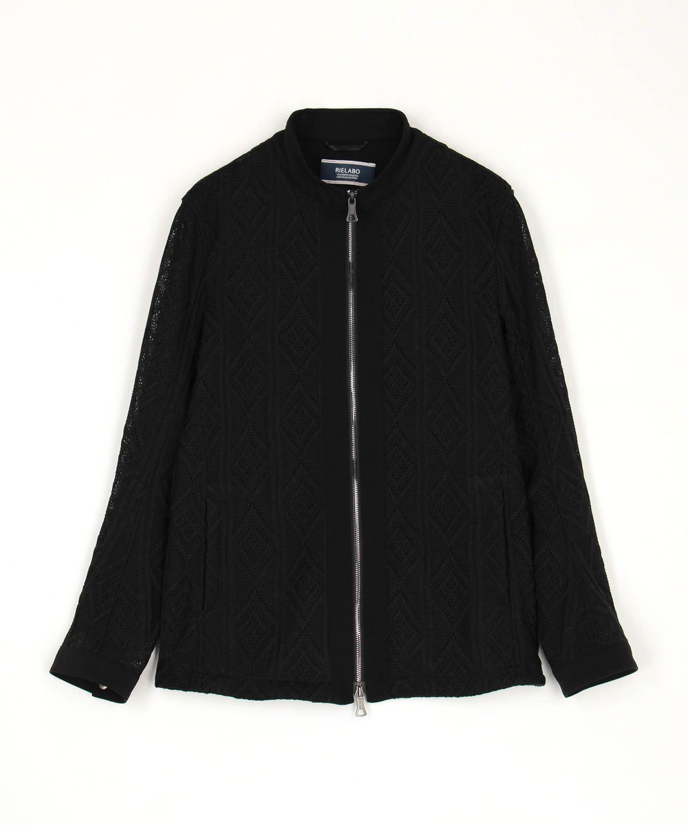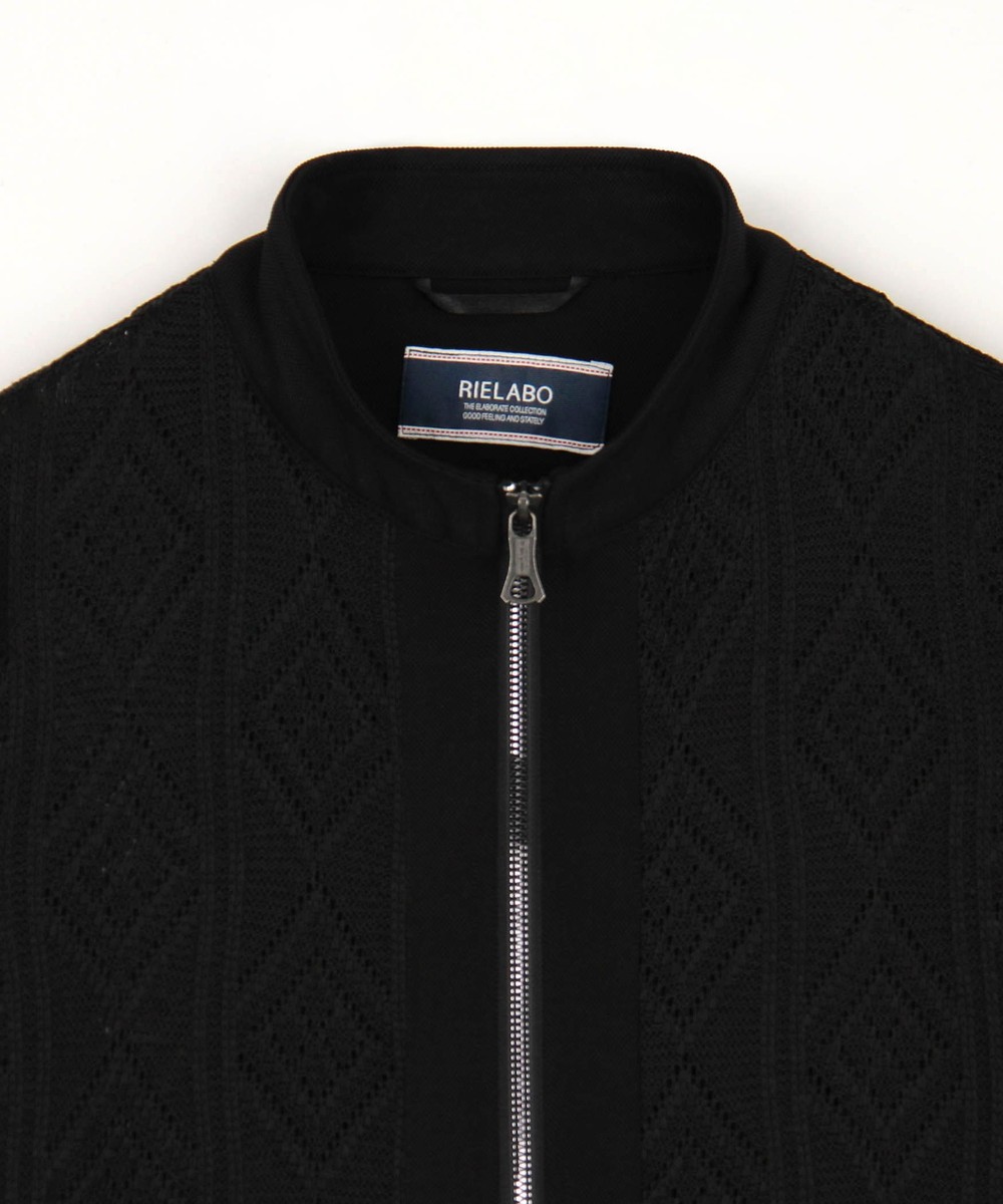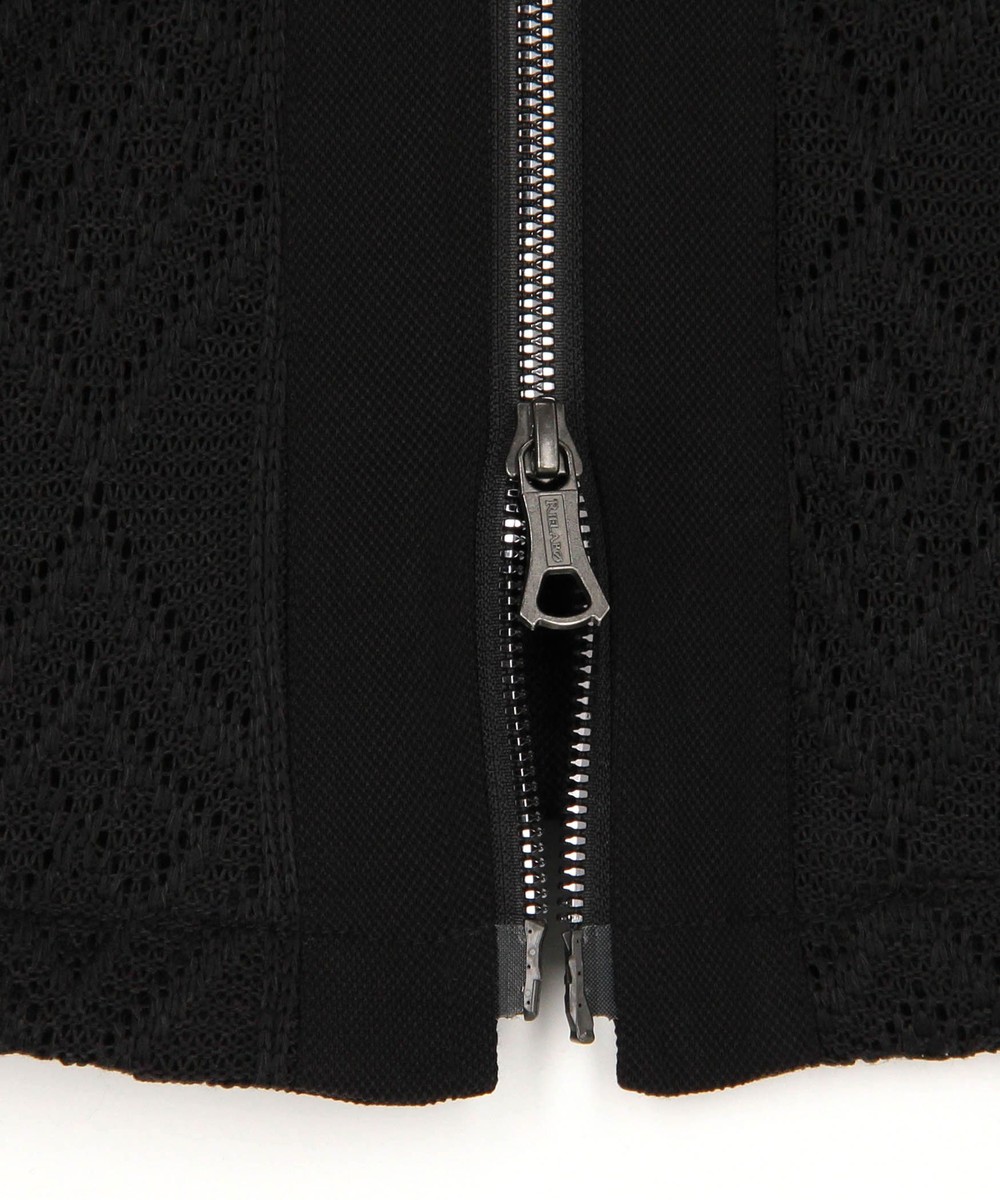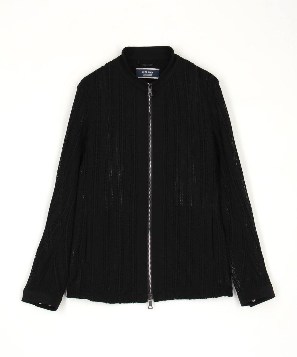 ショートスタンドカラーのシングルライダースブルゾン。脇はスラッシュポケット仕様の軽いシャツブルゾン感覚に作りました。身頃はメッシュ素材、芯地を使用する部分にはシャリッとしたタッチの綺麗な鹿の子素材を使用。衿端にはワイヤーを入れ、脇の縫い代には抗菌防臭テープを仕込み、リエラボ別注の付属で差別化を図ります。
