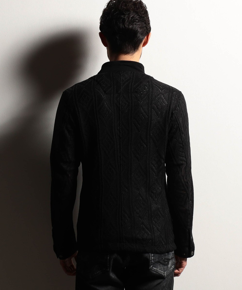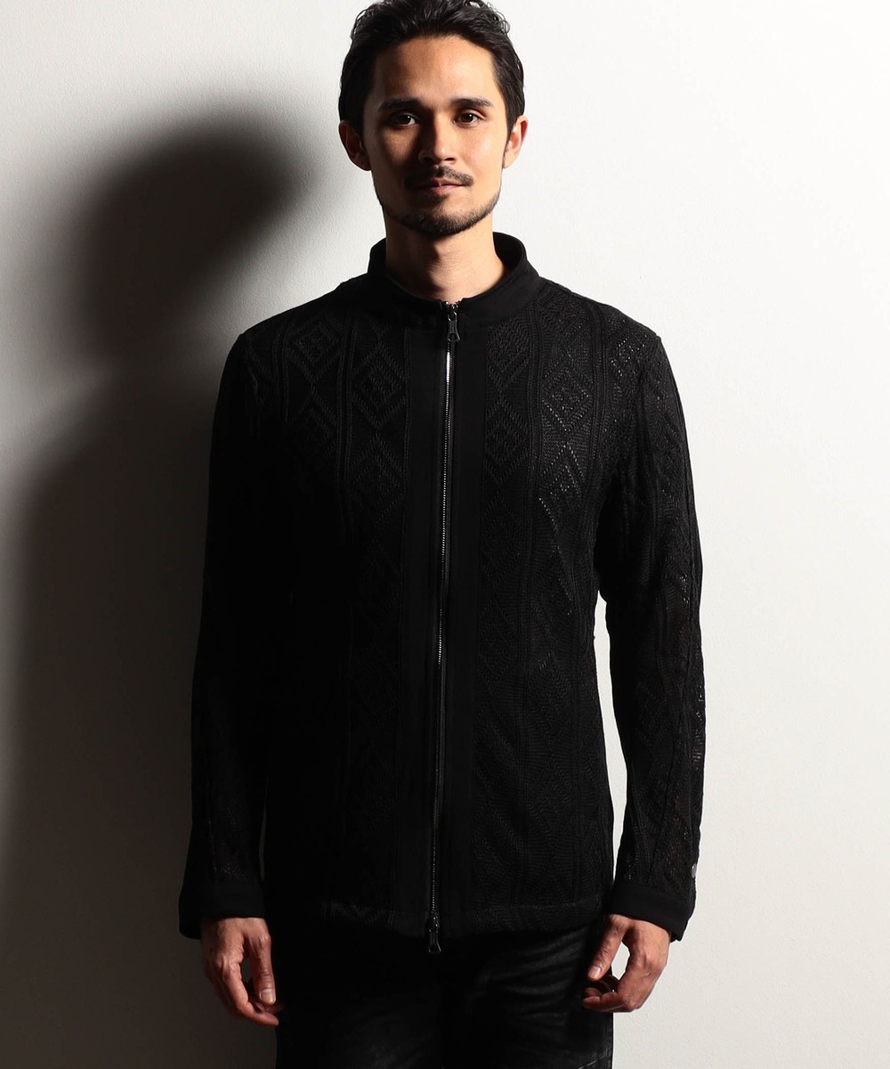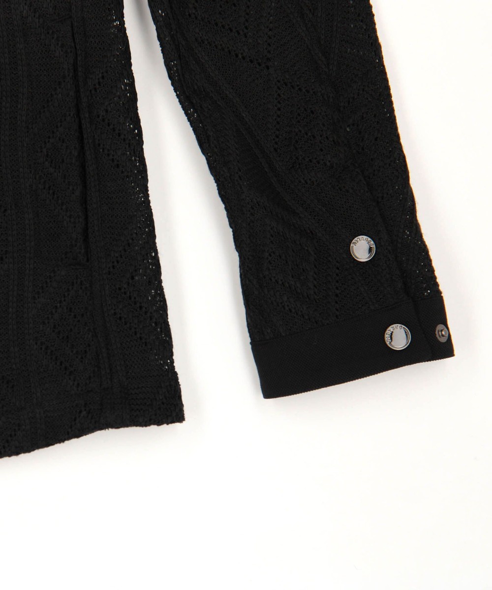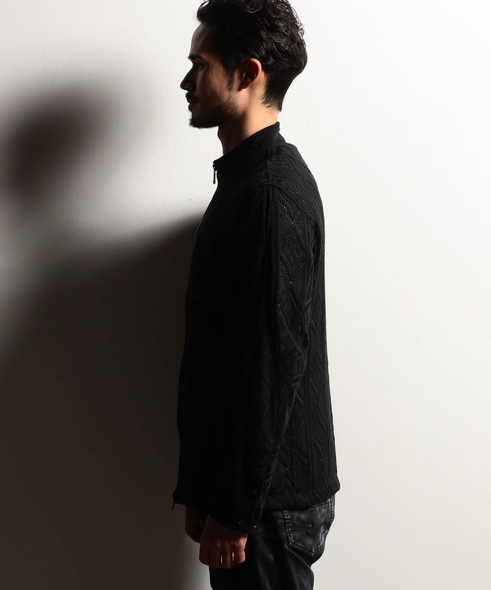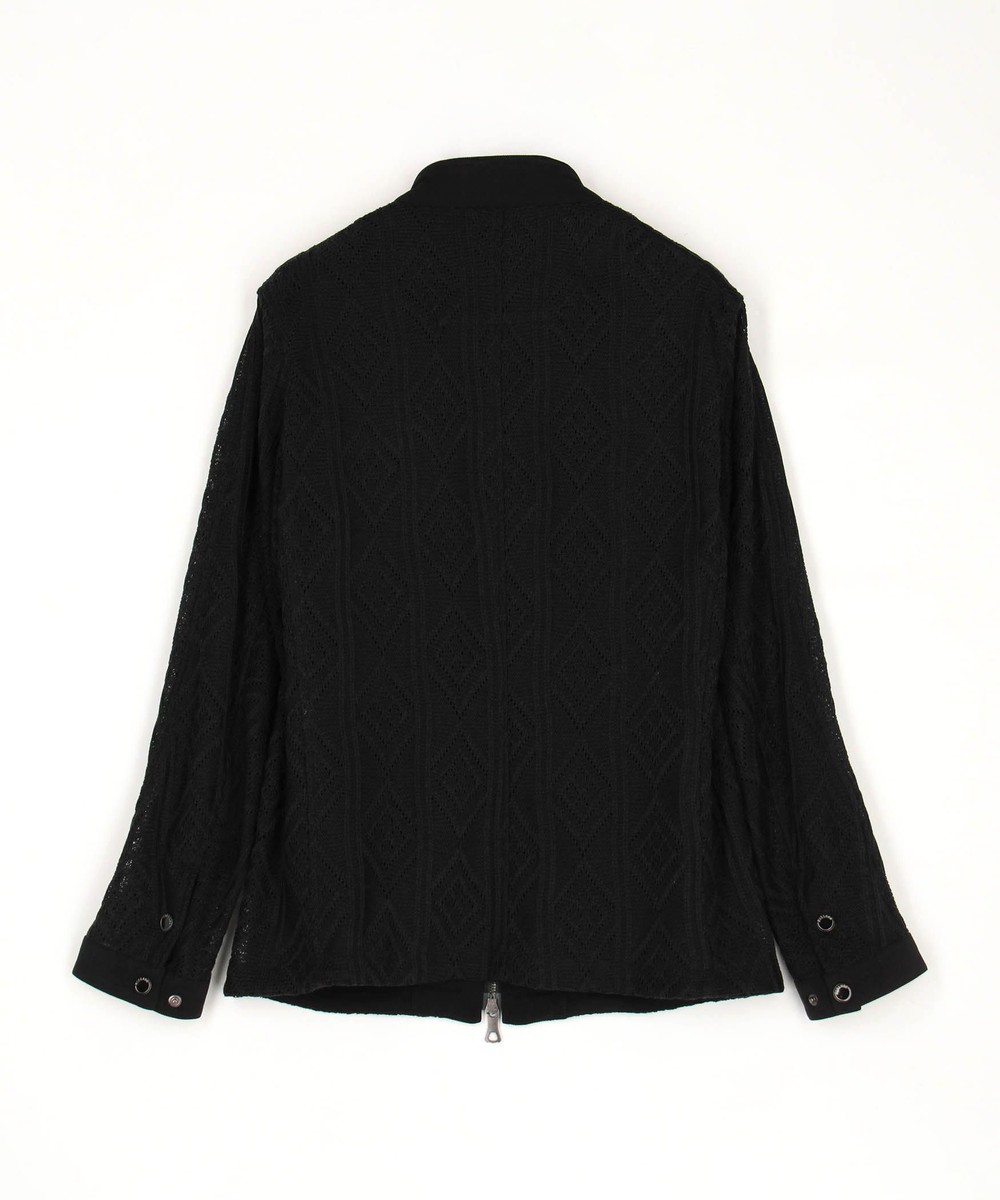 ショートスタンドカラーのシングルライダースブルゾン。脇はスラッシュポケット仕様の軽いシャツブルゾン感覚に作りました。身頃はメッシュ素材、芯地を使用する部分にはシャリッとしたタッチの綺麗な鹿の子素材を使用。衿端にはワイヤーを入れ、脇の縫い代には抗菌防臭テープを仕込み、リエラボ別注の付属で差別化を図ります。