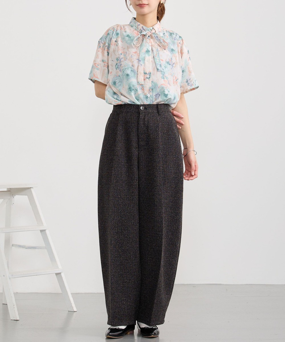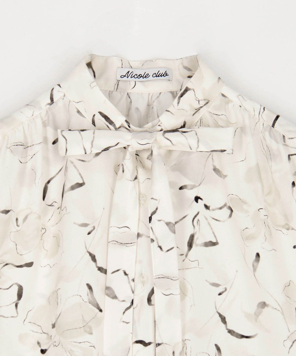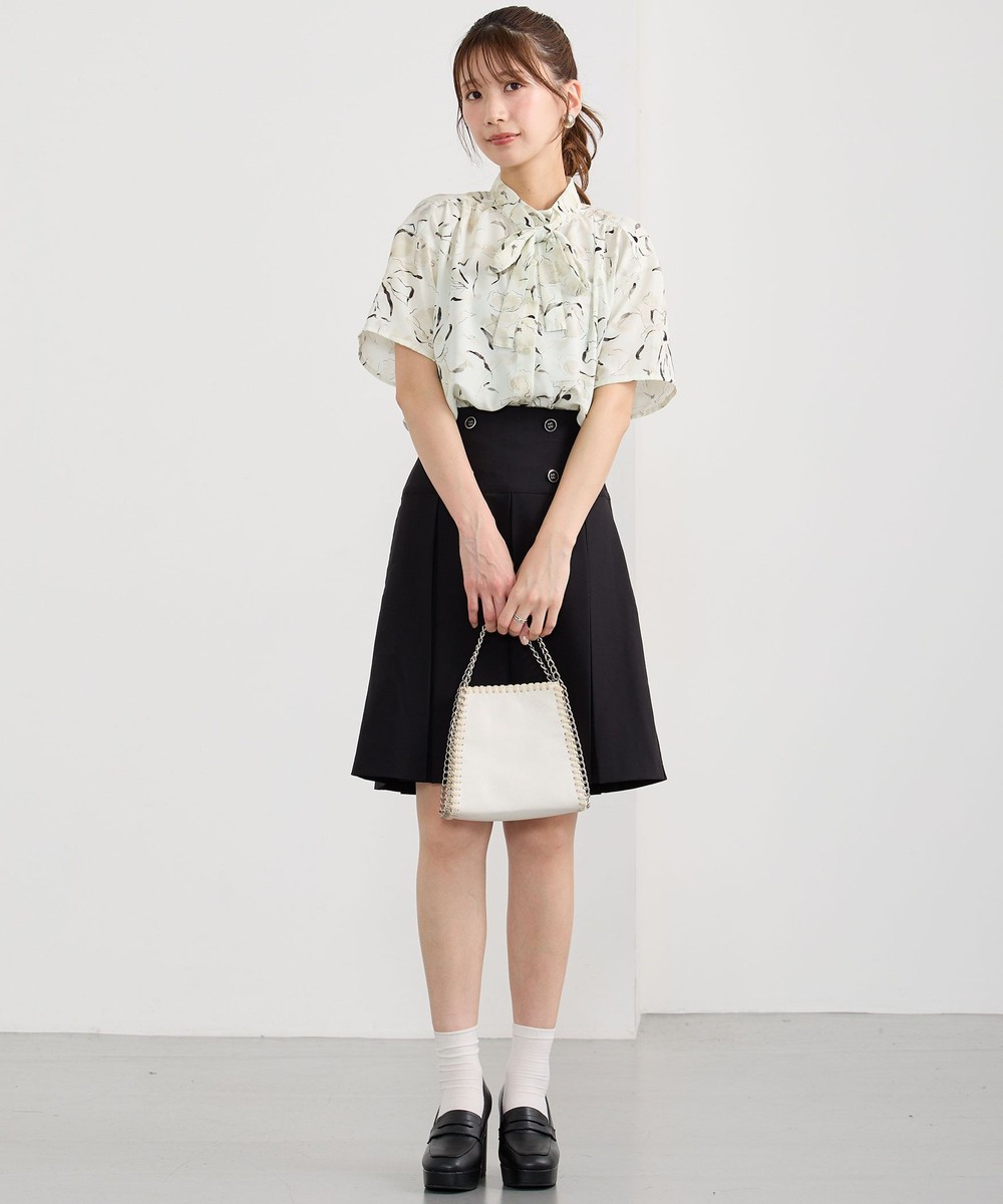 太めのリボンタイがガーリーさを出しつつも、スタンドカラーでより大人な印象に。