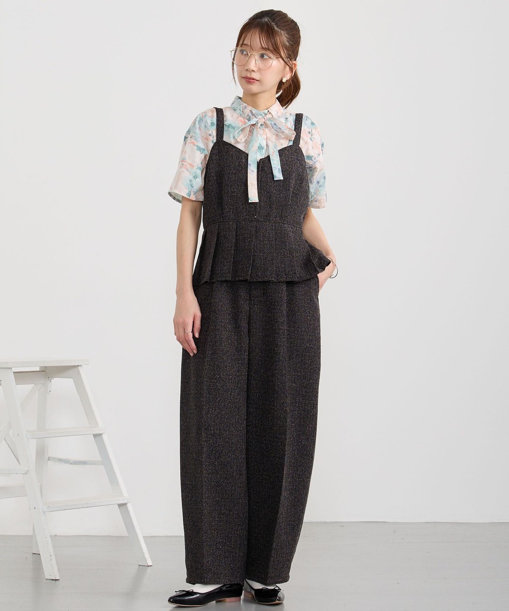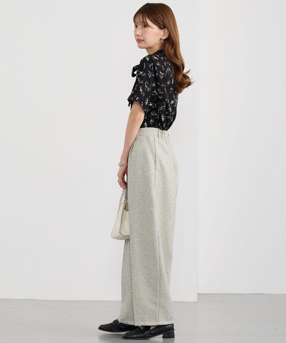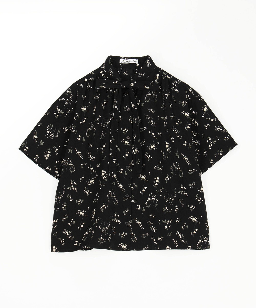 太めのリボンタイがガーリーさを出しつつも、スタンドカラーでより大人な印象に。