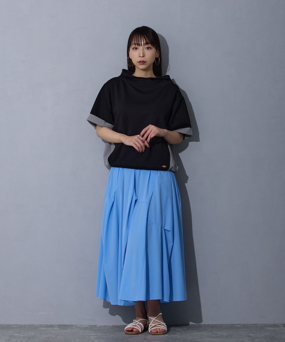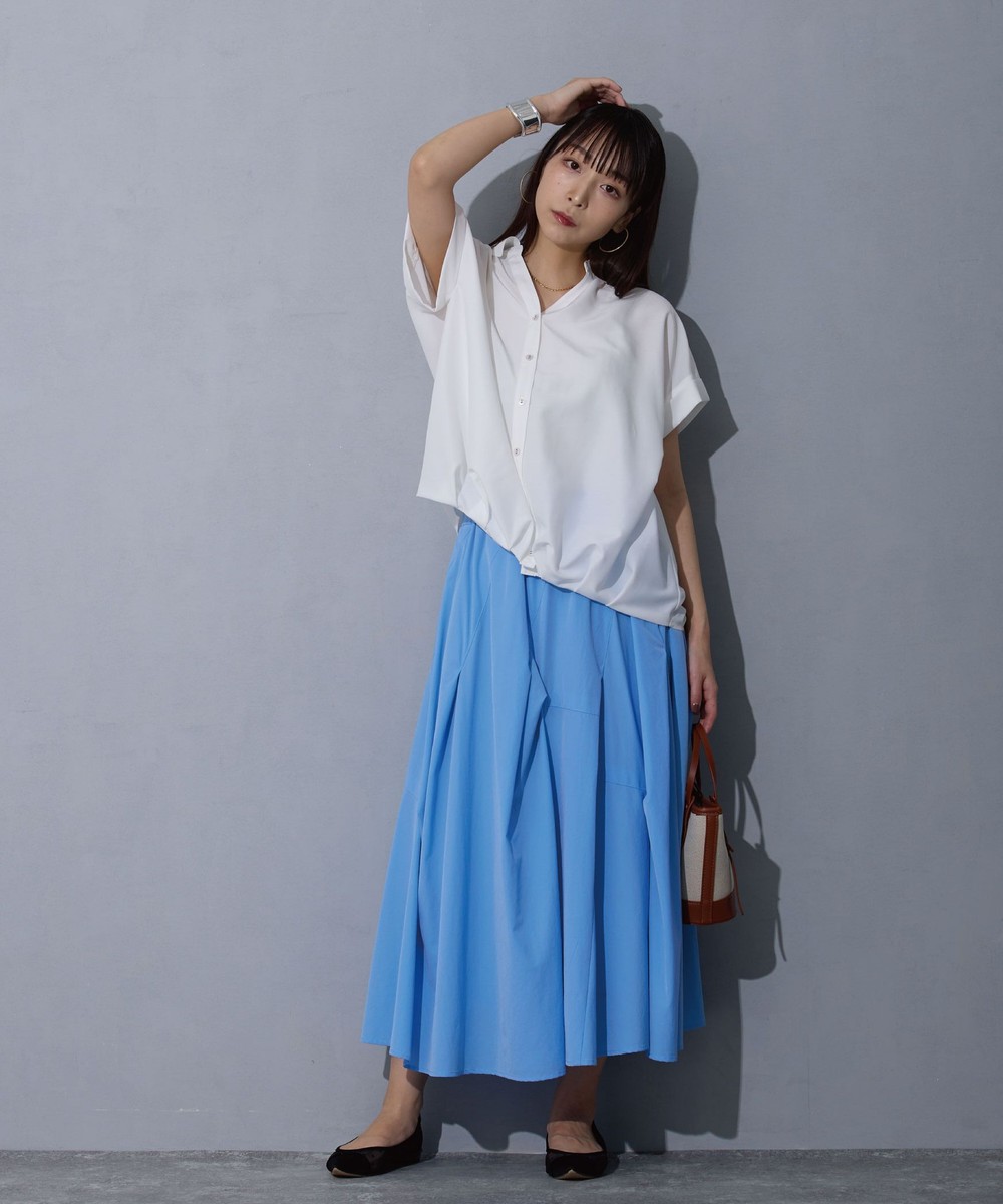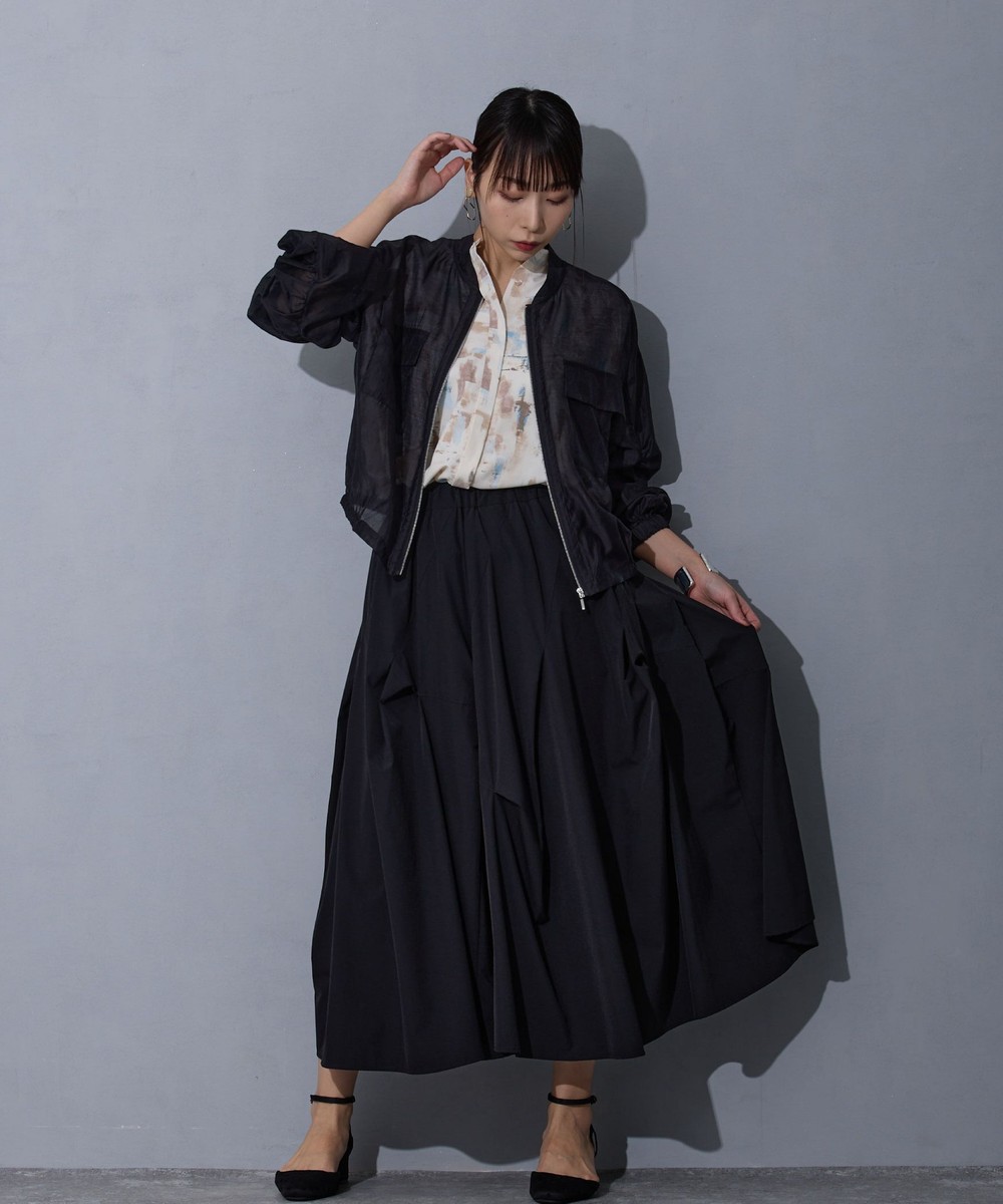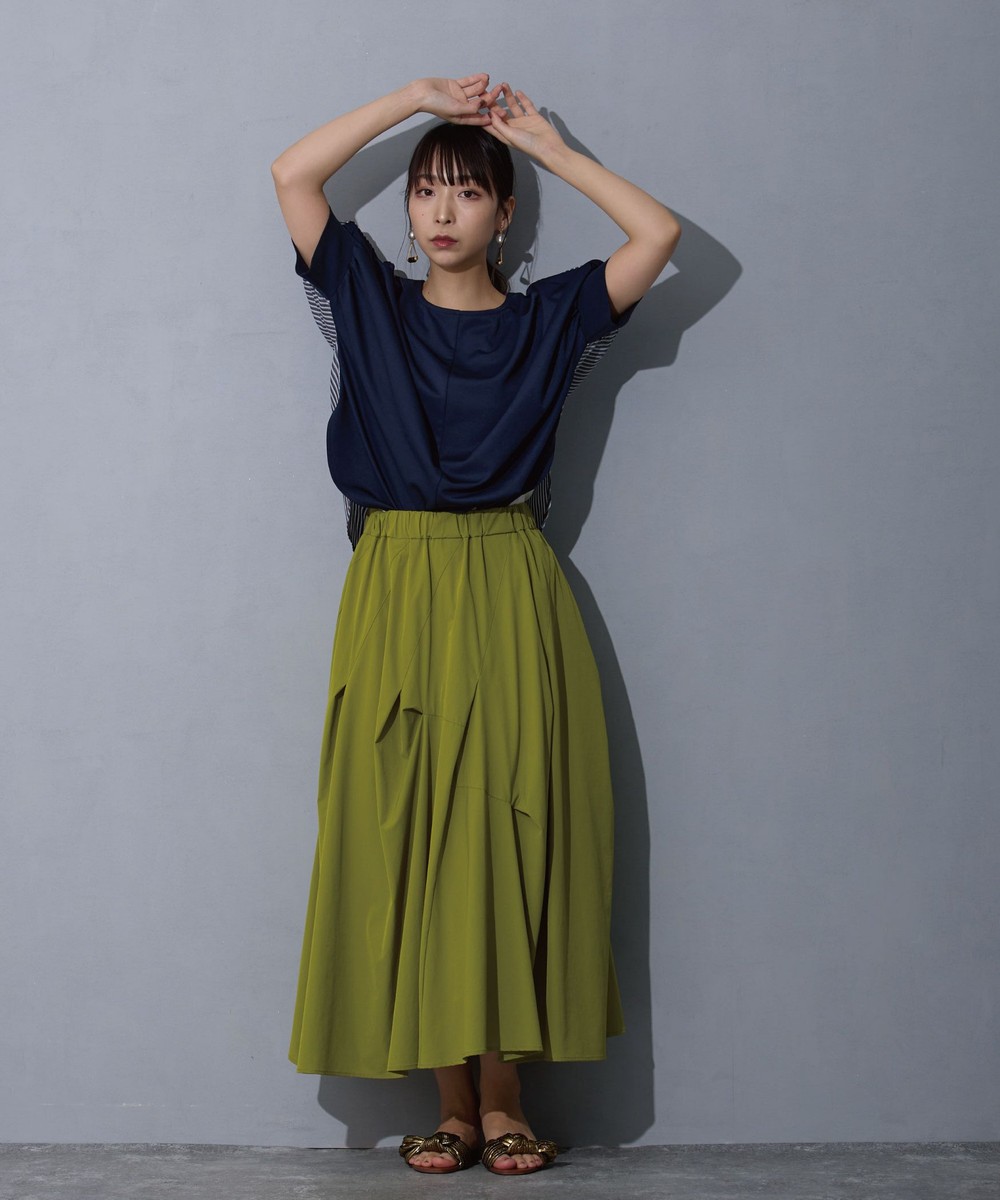 アシンメトリーに入ったデザイン個性的なスカートはコーディネートのアクセントとして。