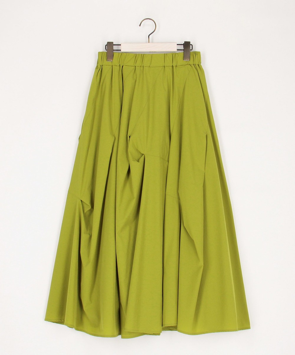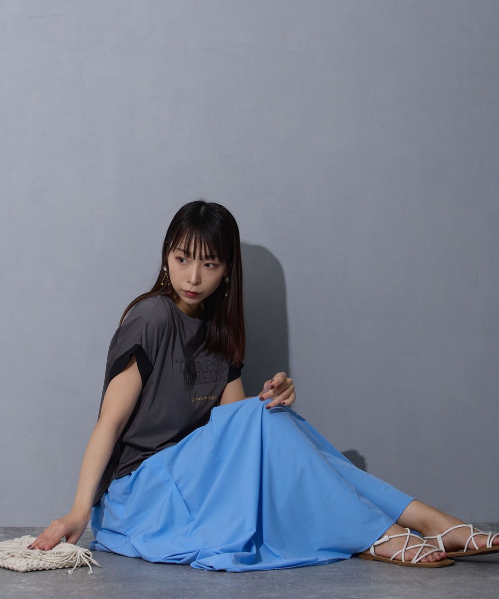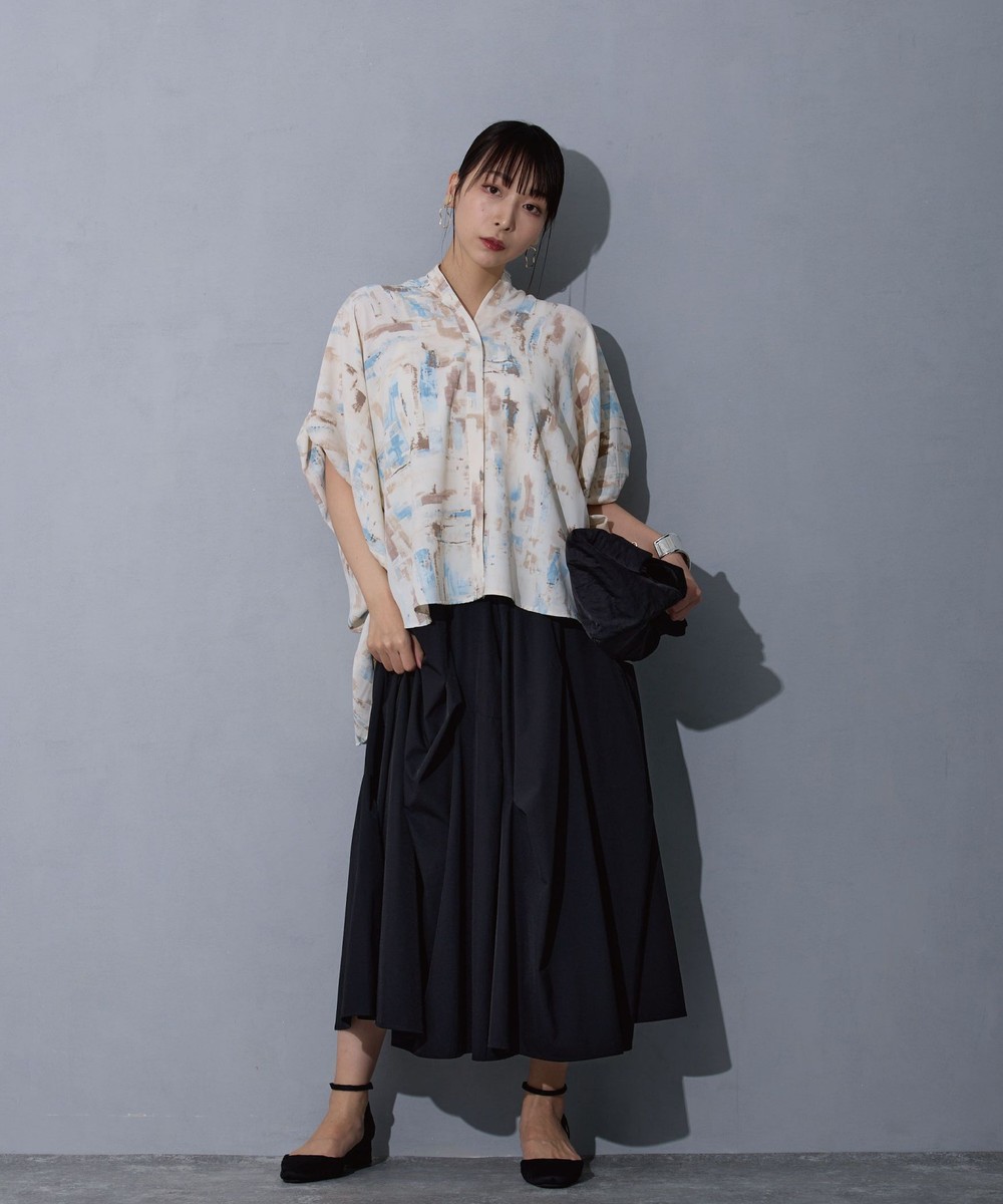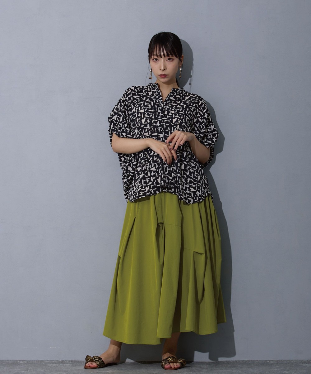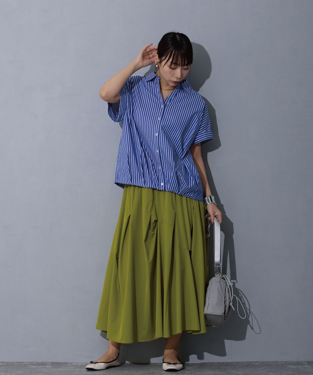 アシンメトリーに入ったデザイン個性的なスカートはコーディネートのアクセントとして。