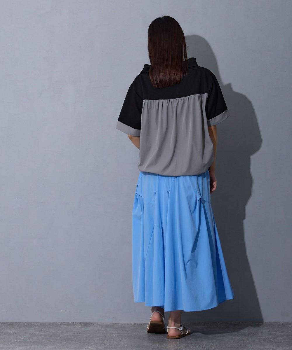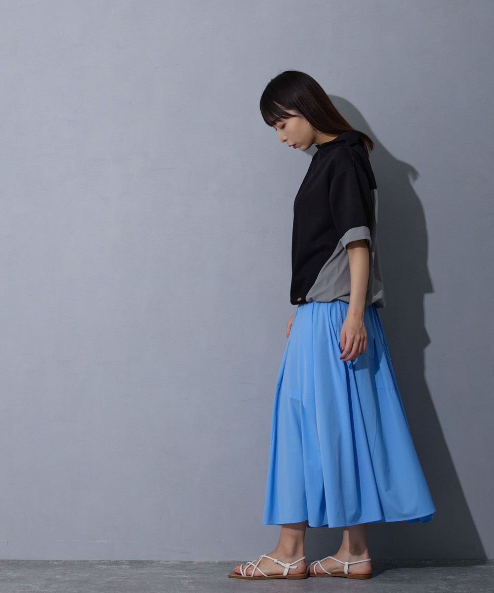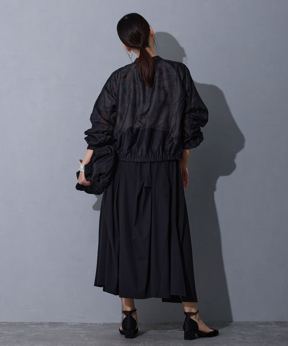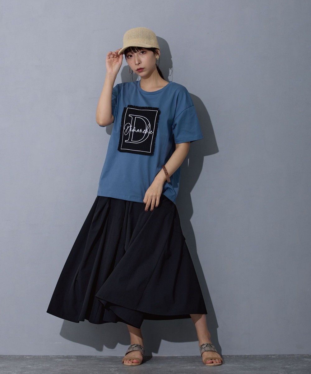 アシンメトリーに入ったデザイン個性的なスカートはコーディネートのアクセントとして。