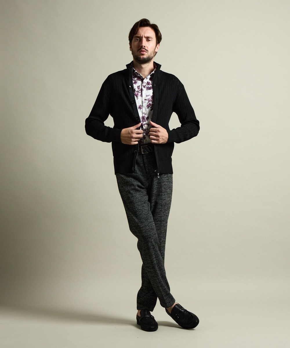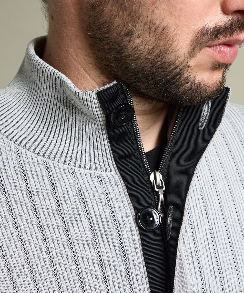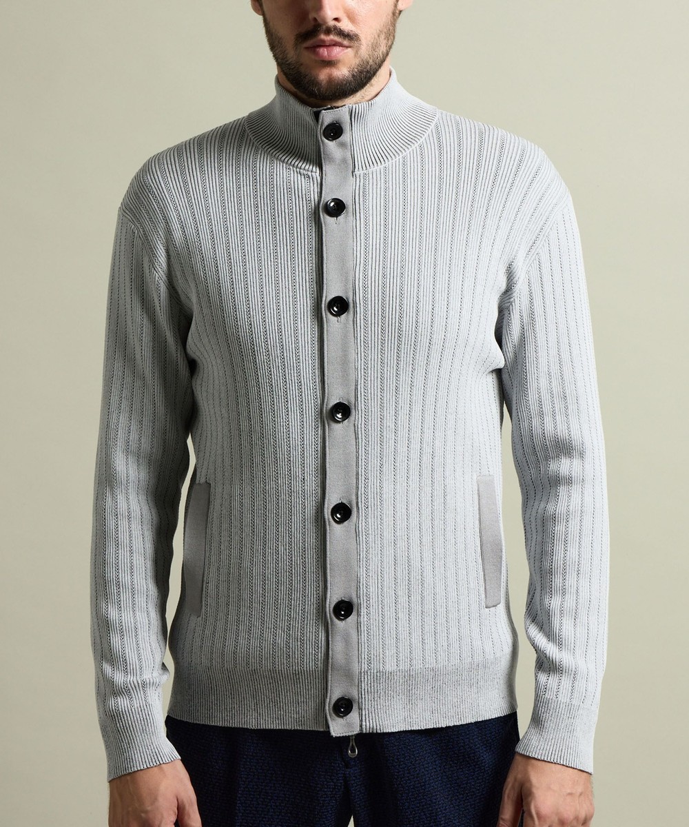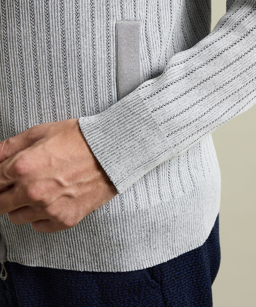 ハイゲ-ジ14GGで編み立てたプレ-ティングリブジャカードのスタンドフルジップアップブルゾンになります。