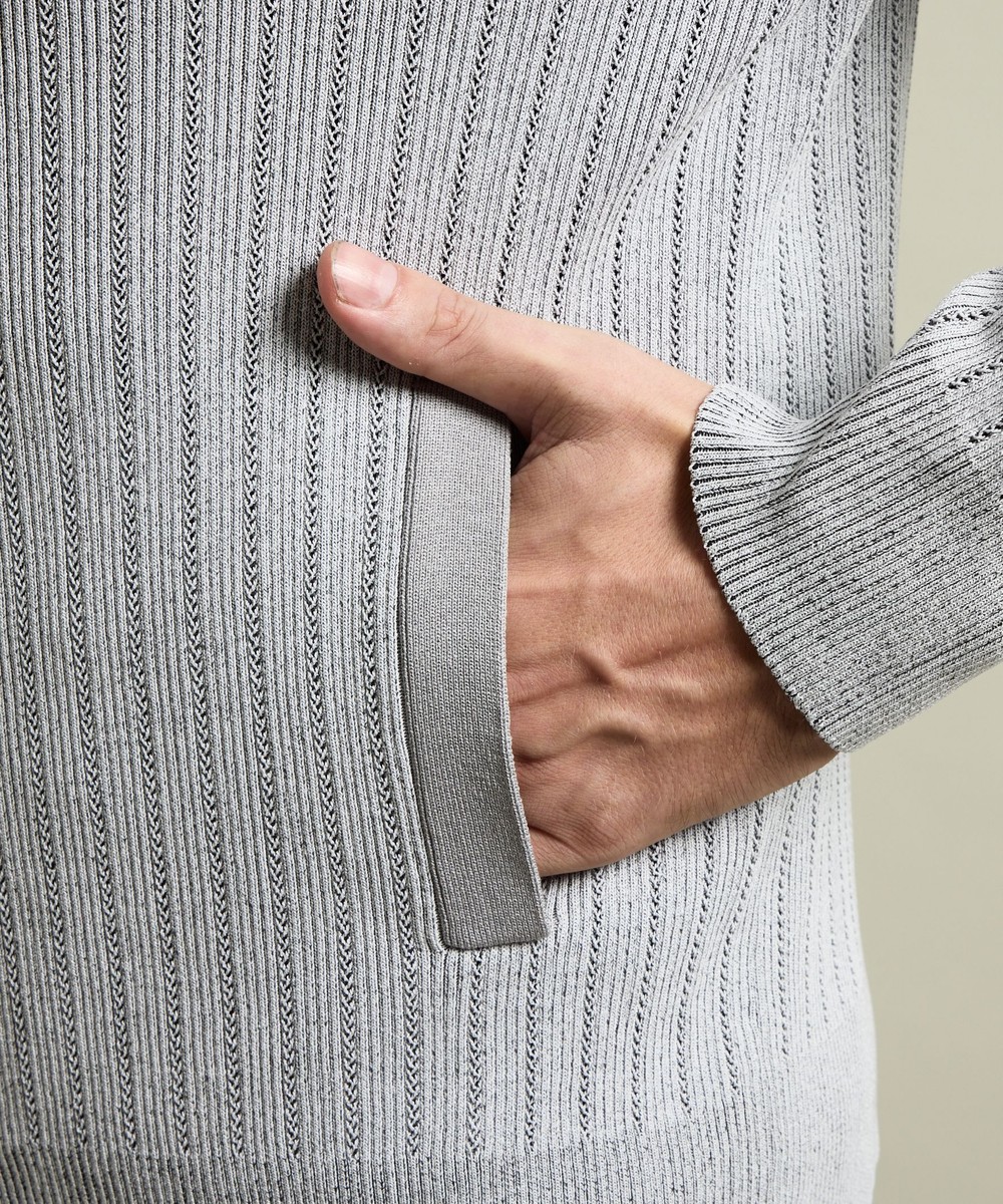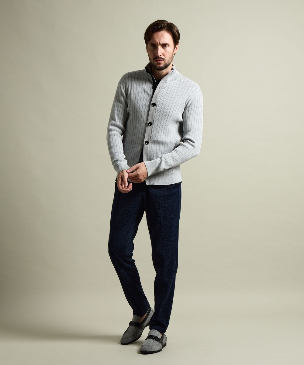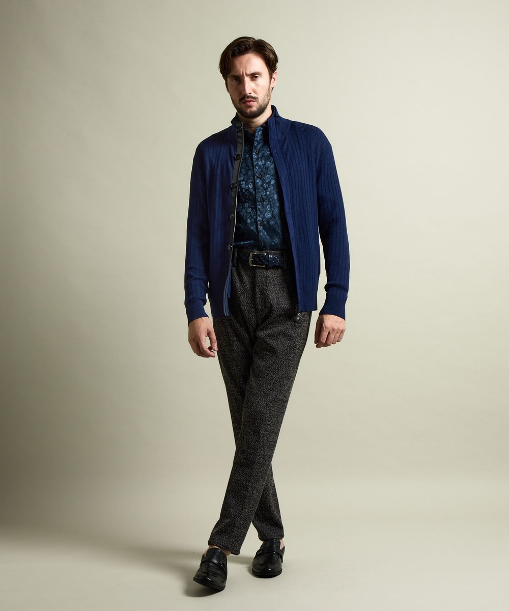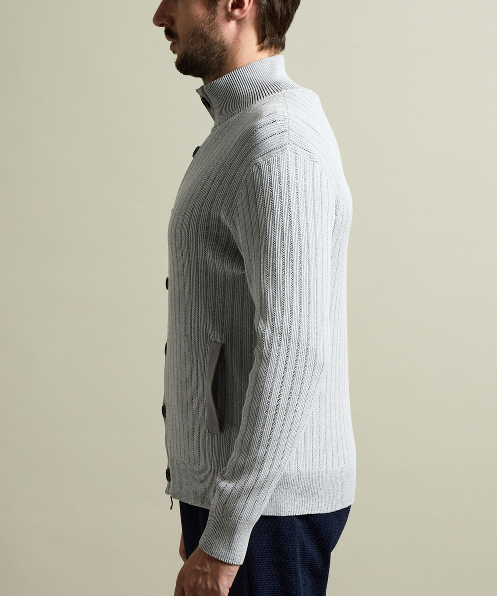 ハイゲ-ジ14GGで編み立てたプレ-ティングリブジャカードのスタンドフルジップアップブルゾンになります。