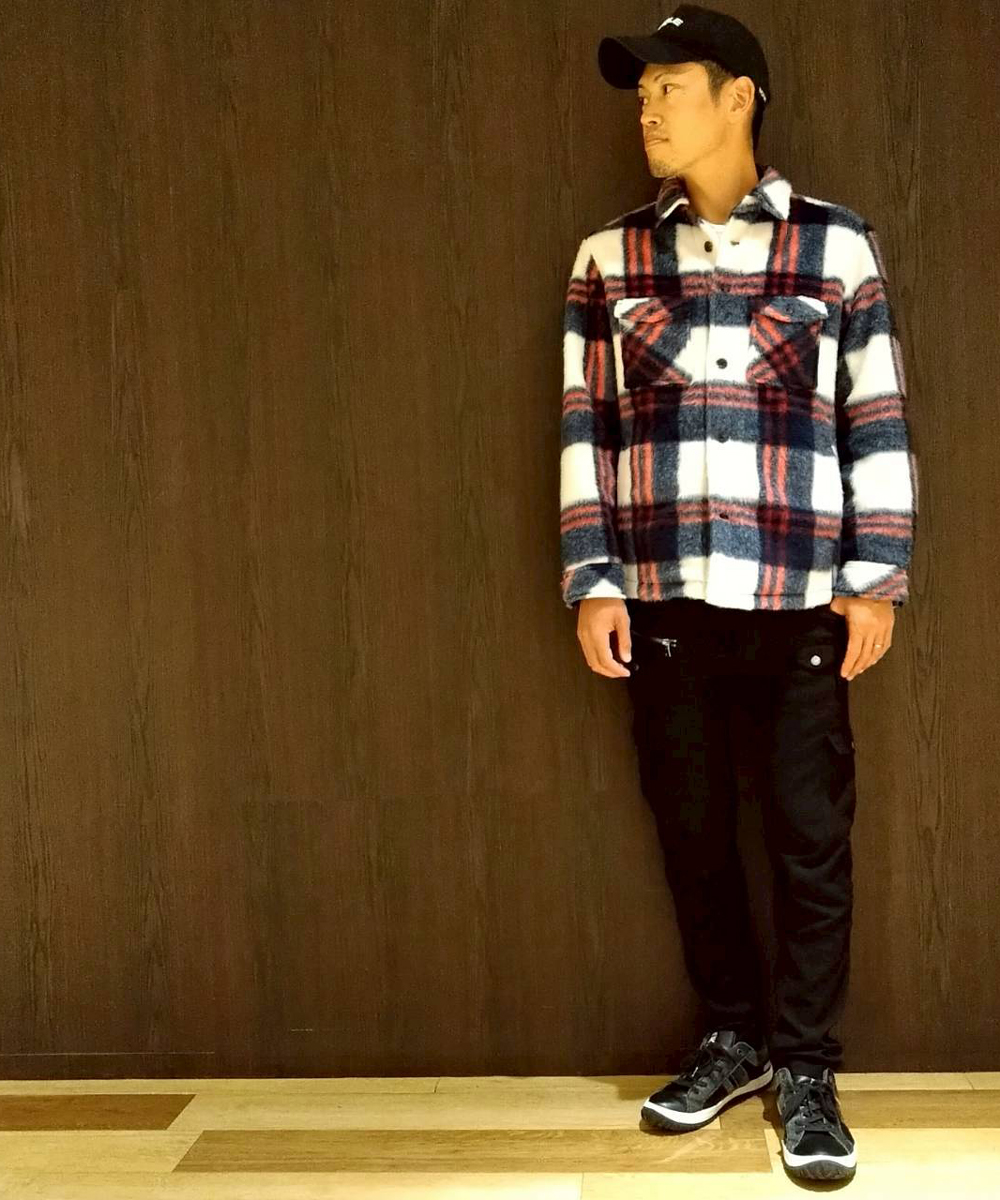 CPO風オーバーサイズシャツブルゾン。Wパッチポケットデザインに大き目のロゴ入り釦を採用し、脇ポケットも設ける事でブルゾンライクに仕上げています。衿先にワイヤ-を仕込み、衿裏やカフス裏などにハニカム調のプリントの入った黒裏地を使っています。前身頃裏にも使用していますが、この裏地が蓄熱・保温性の高い機能裏地になります。ストレッチ裏地を使った総裏仕様で着心地も良く、裾デザインをラウンド型にする事でシャツっぽくしています。