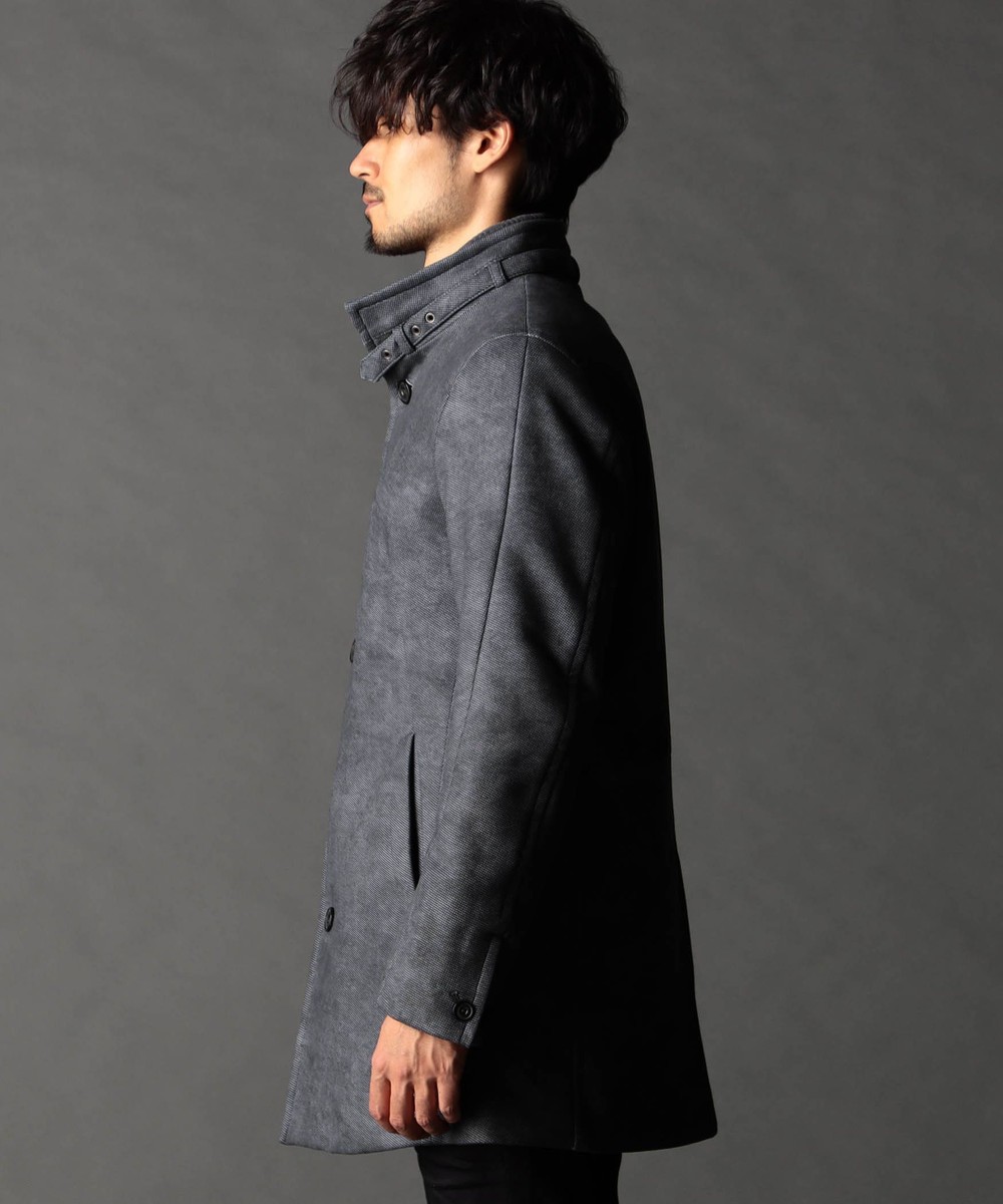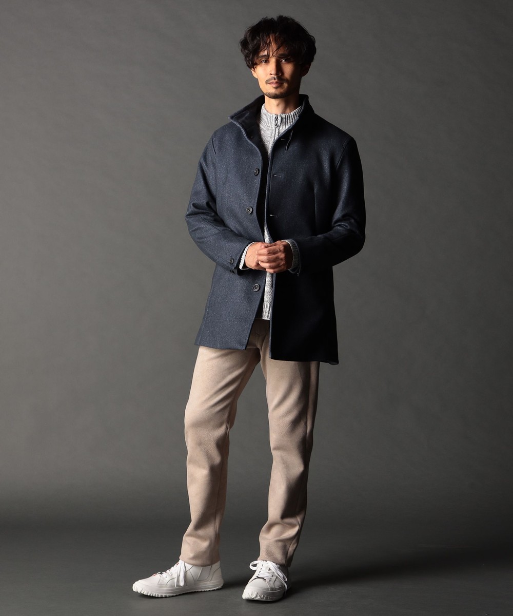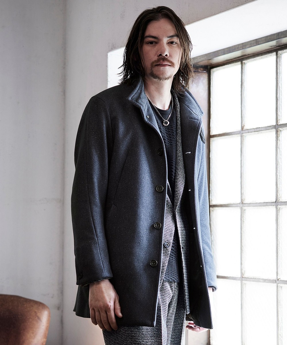 着脱可能な衿ベルトをアクセントにしたスタンドカラーコート。ウエストをシェイプさせた綺麗なシルエットとお尻が隠れる位の程良い着丈でシンプルなデザインに作っています。特徴的な3枚接ぎの立体袖は運動分とハンガールッキングも考慮したオリジナルデザインポイント。袖口は本切羽仕様、身返しは表地を使用していますので折り返して遊べ、アジャスト釦も付けて調整出来る様にしています。裏地は保温効果の高い機能裏地を採用、身頃裏のみに薄い機能中綿を入れたキルティング仕様にして保温性を高めています。衿端にはワイヤーを入れて遊べる様にし、衿ベルト裏の別布や、オリジナルバックル・ロゴ入り手付釦等を使用して付属にもこだわっています。ドレスシーンでもカジュアルでも格好良く着れるコートに仕上げています。