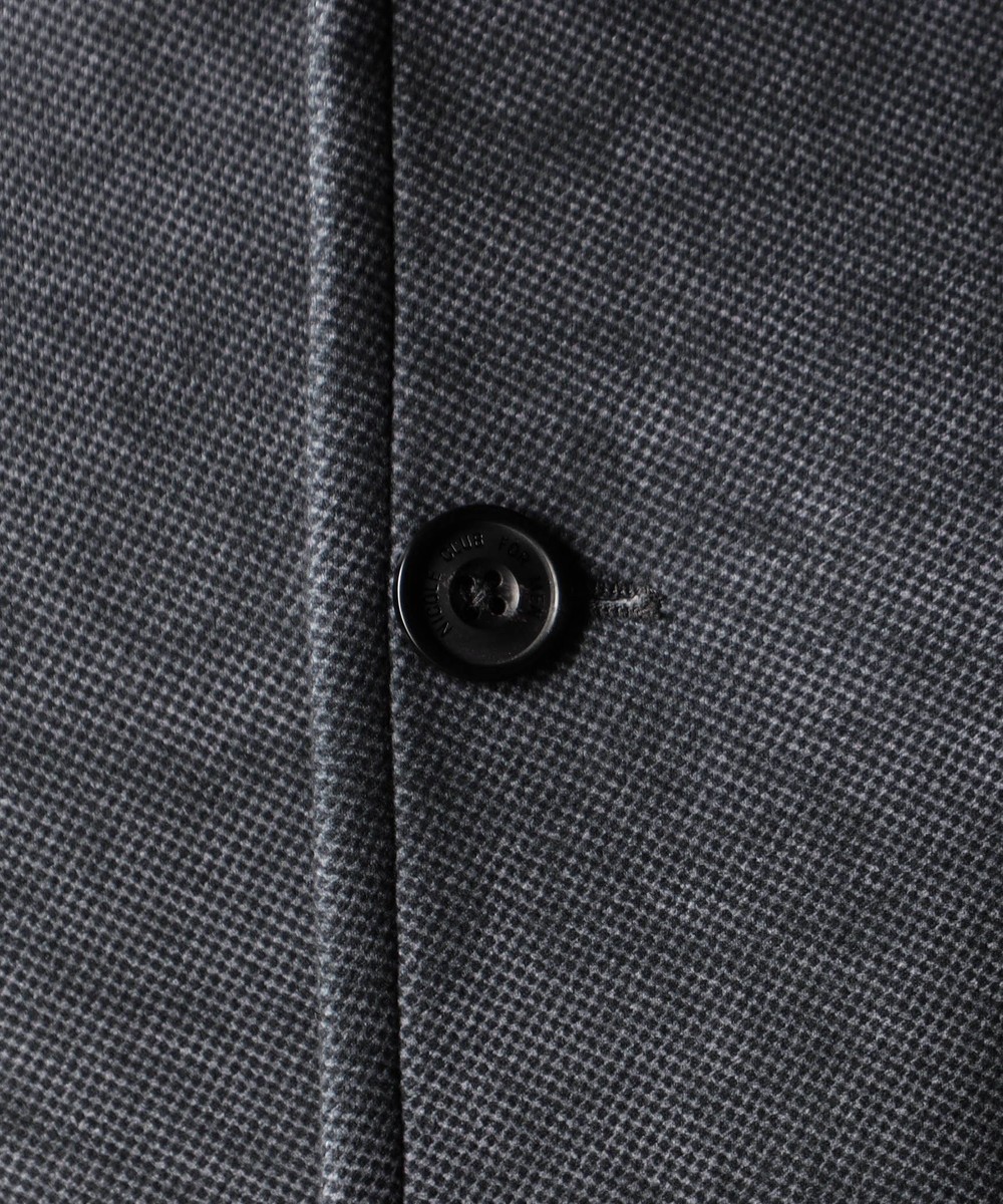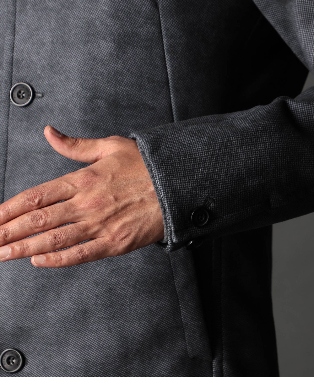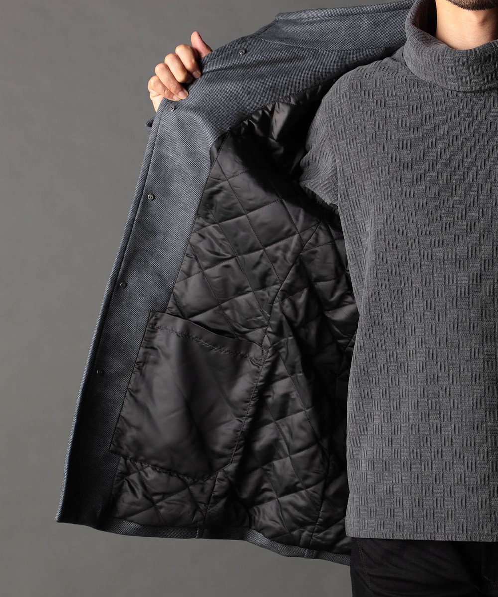 「ダウンファブリック」という特殊素材。3Dプリンターの技術を応用した特殊な加工で、表生地と裏生地の間に、ダウンをラミネートすることで空気層が形成され内部の環境を快適に保つ新素材。特許取得の3層構造生地になります。ダウンならではモコモコ感は皆無、保温性を保ちながら、もたつきにくいのが特徴です。ダウンを挟む層はすっきりした印象の経(タテ)編地で、マルチなストレッチ性で柔らかく温もりを感じられます。更に防風性、吸湿・発熱性と高い機能性を兼備。ダウンを使用していながら家庭で水洗いができるのも便利です。最新技術が生み出したスマートな見た目と暖かなダウン入りの快適な着心地です。