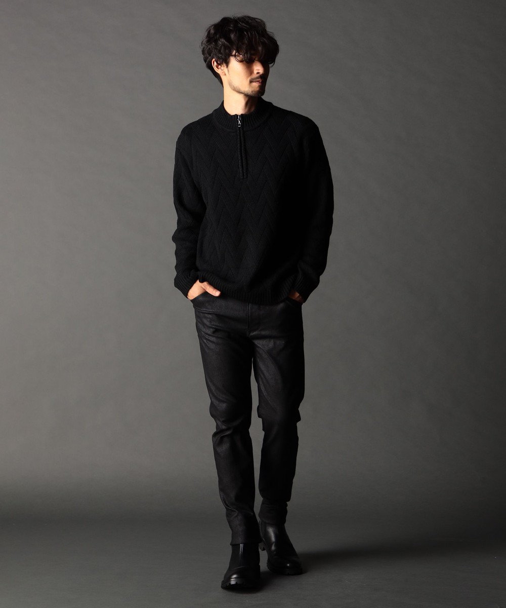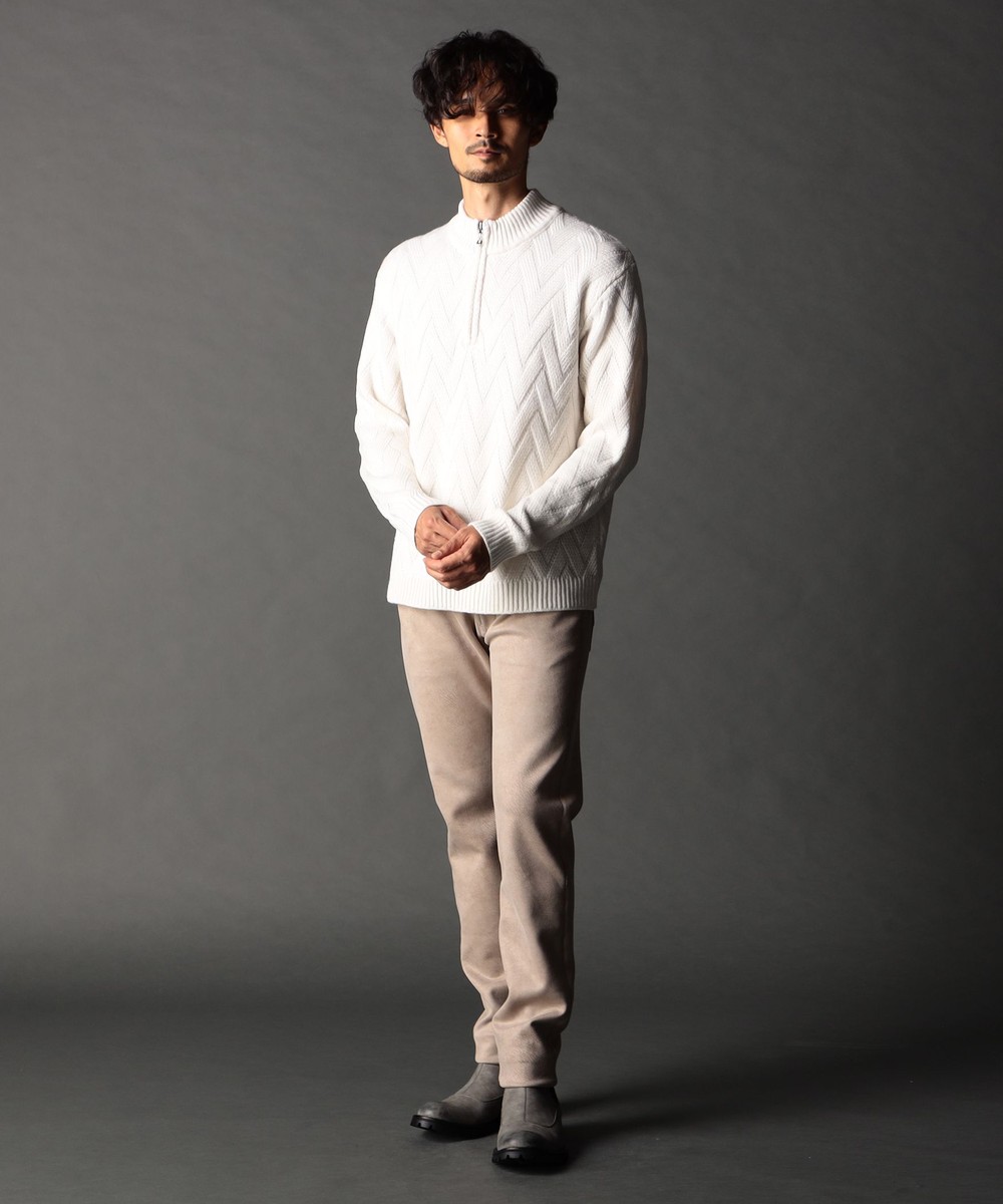上品な編地の交差柄とスッキリとした衿元がアクセントのハーフジップポロニット。軽量で膨らみのあるソフトな風合いがウォーム感のある仕上がりです。