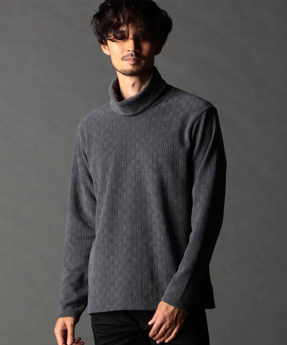 編地の凹凸で奥行きのあるブロックチェック柄をジャカードで表現したオフタートルプルオーバー。衿元の前下がりを深めにとることで首周りの締め付けが気にならず程よい抜け感も演出してくれるデザインです。薄すぎず厚すぎない肉厚感で、一枚でトレーナー感覚でも、冬場のインナーとしても活躍します。裾脇のスリット仕様がアクセントになっています。