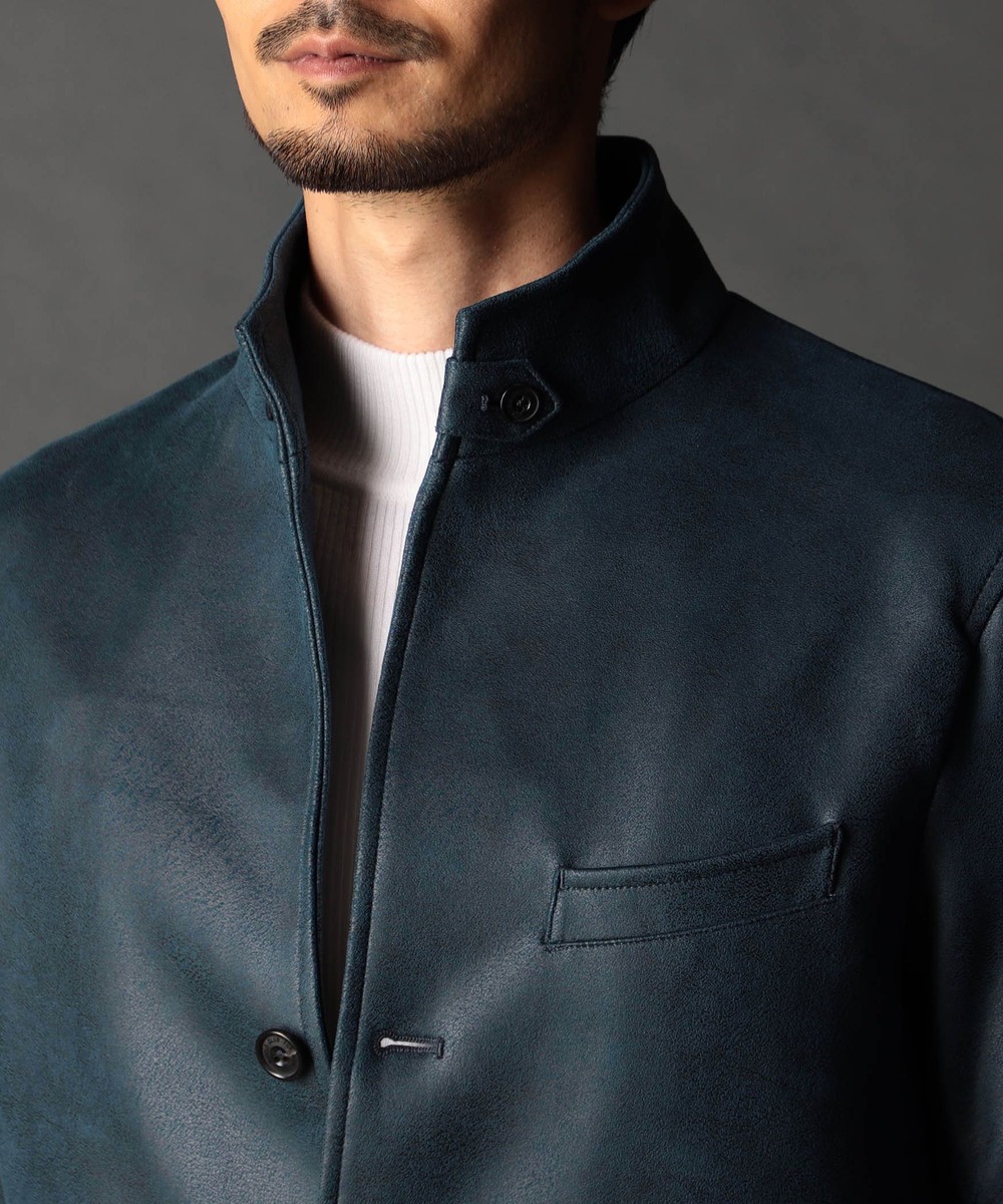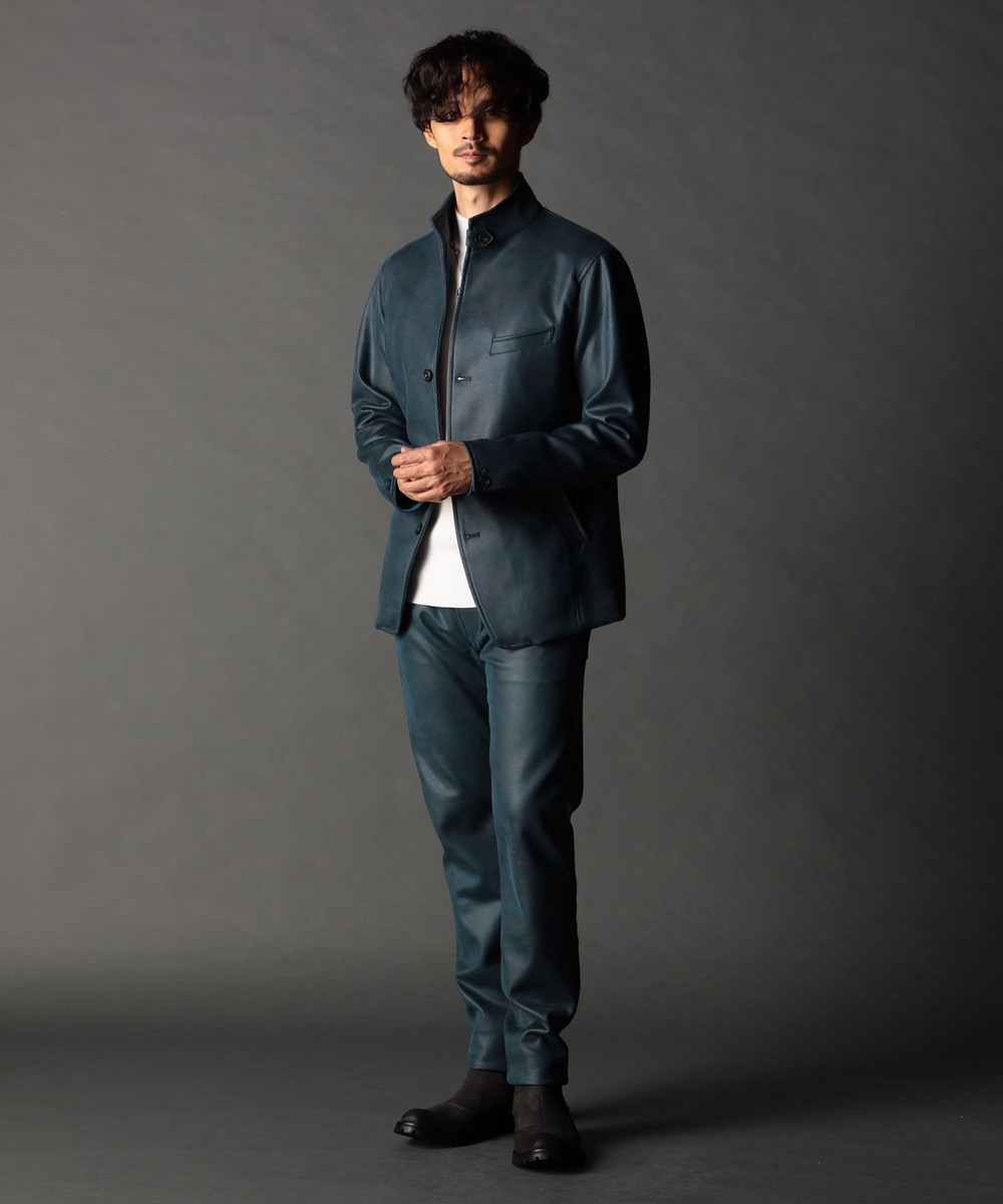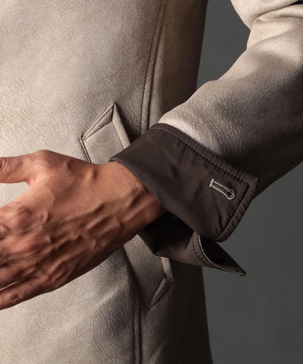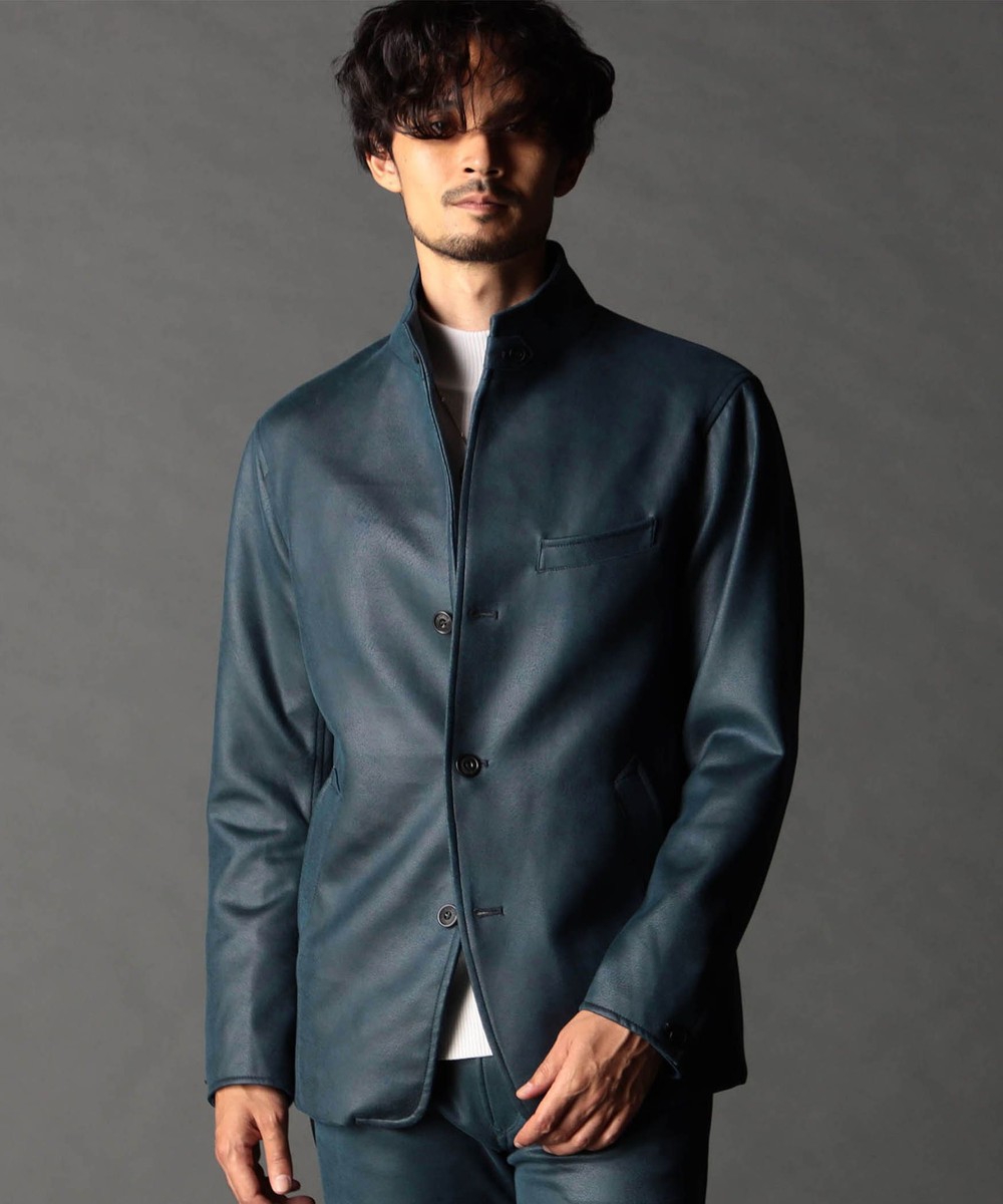 スタンド・イタリアンカラーのカヴァーオールデザインジャケット。衿端にはワイヤーを入れて遊べるようにし、その衿部分は折り返してラペルとしても綺麗に収まる設定です。衿タブで上まで止める事が出来るので防風性もあり、表地に追従する様にストレッチ裏地を採用した総裏仕様なので着心地も抜群です。左胸ポケットはフェイクチーフ仕様、袖口は本切羽、腰ポケットは斜めに作り、使いやすくしています。(一番下の釦は止める設定になっていませんのでご注意ください。)