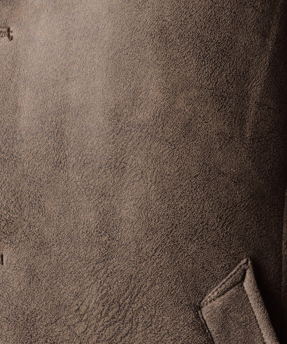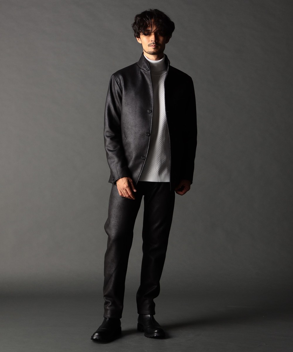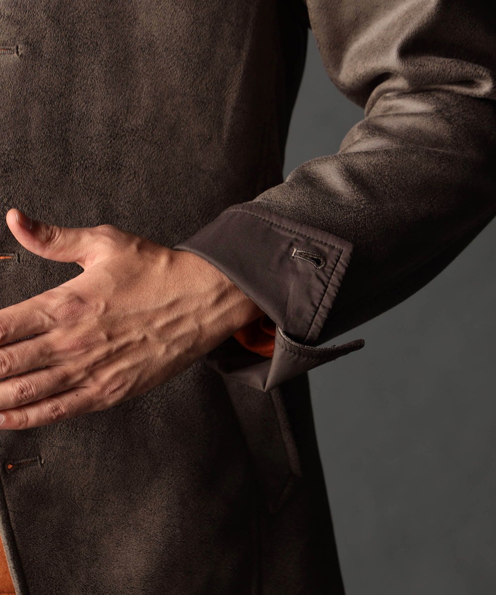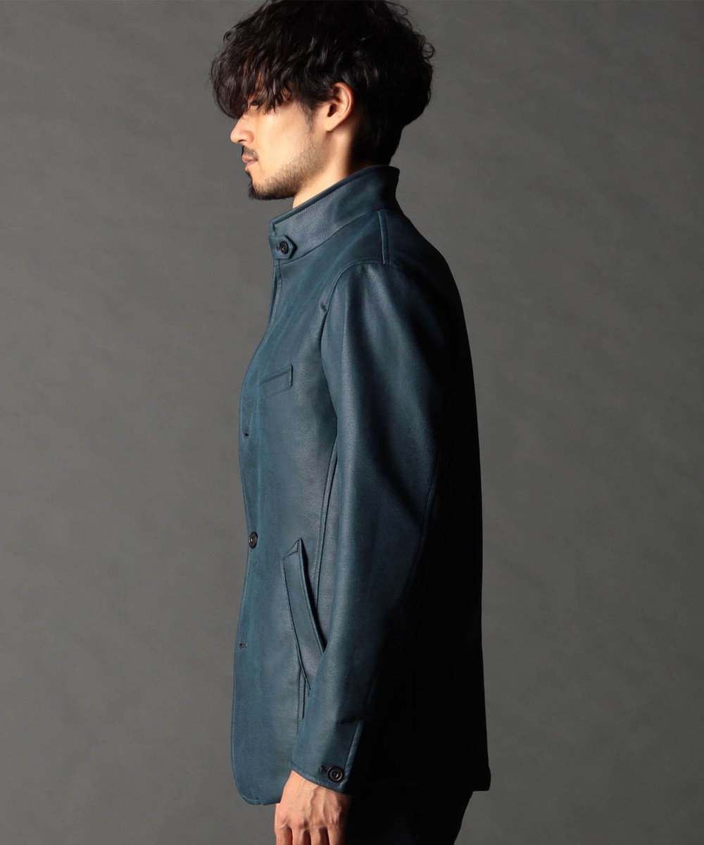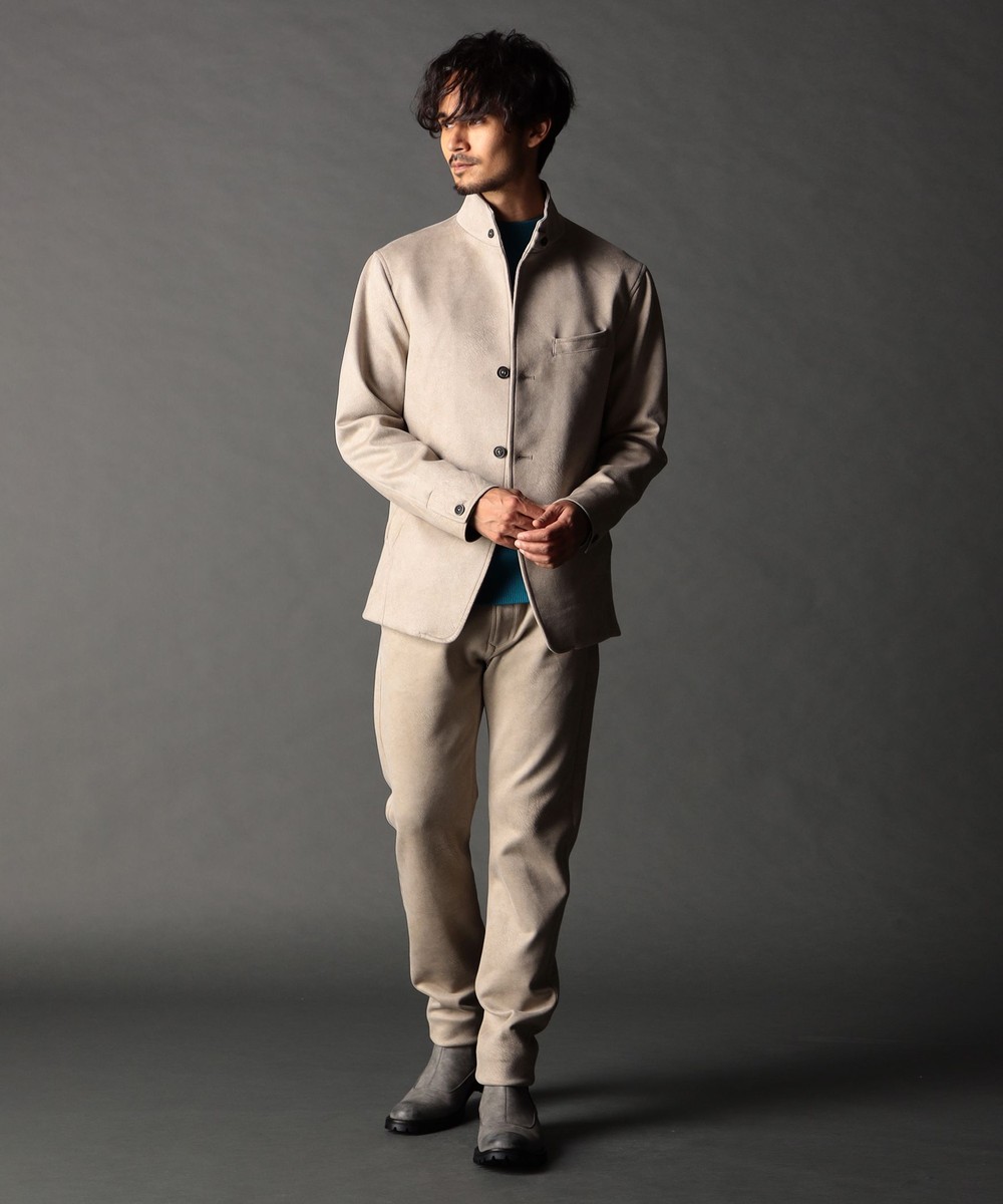 スタンド・イタリアンカラーのカヴァーオールデザインジャケット。衿端にはワイヤーを入れて遊べるようにし、その衿部分は折り返してラペルとしても綺麗に収まる設定です。衿タブで上まで止める事が出来るので防風性もあり、表地に追従する様にストレッチ裏地を採用した総裏仕様なので着心地も抜群です。左胸ポケットはフェイクチーフ仕様、袖口は本切羽、腰ポケットは斜めに作り、使いやすくしています。(一番下の釦は止める設定になっていませんのでご注意ください。)