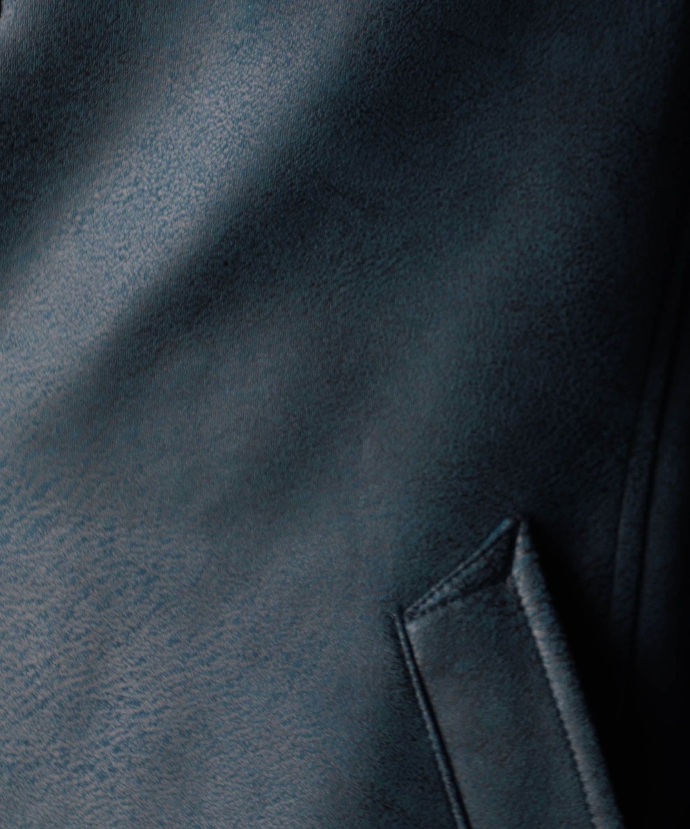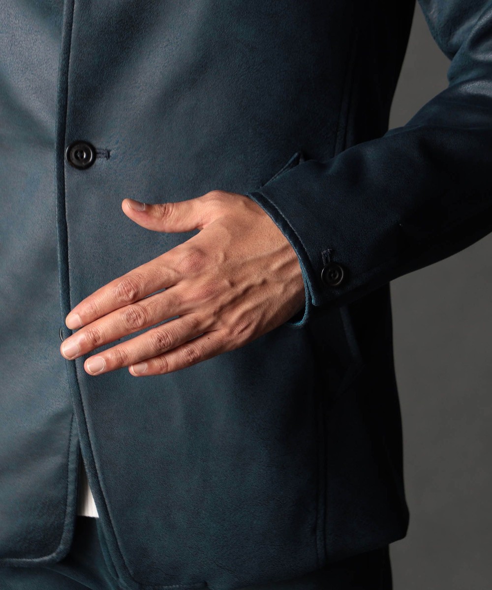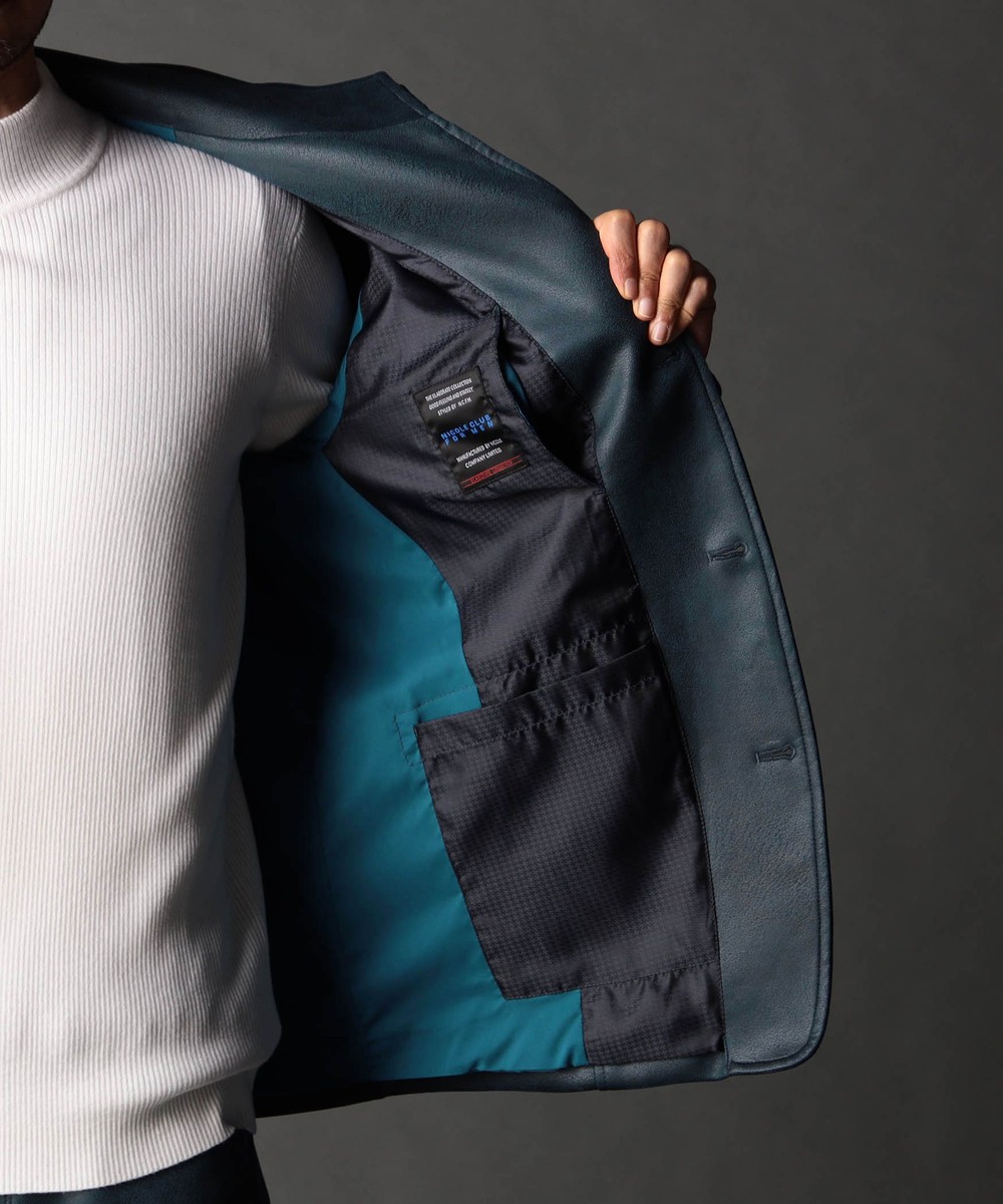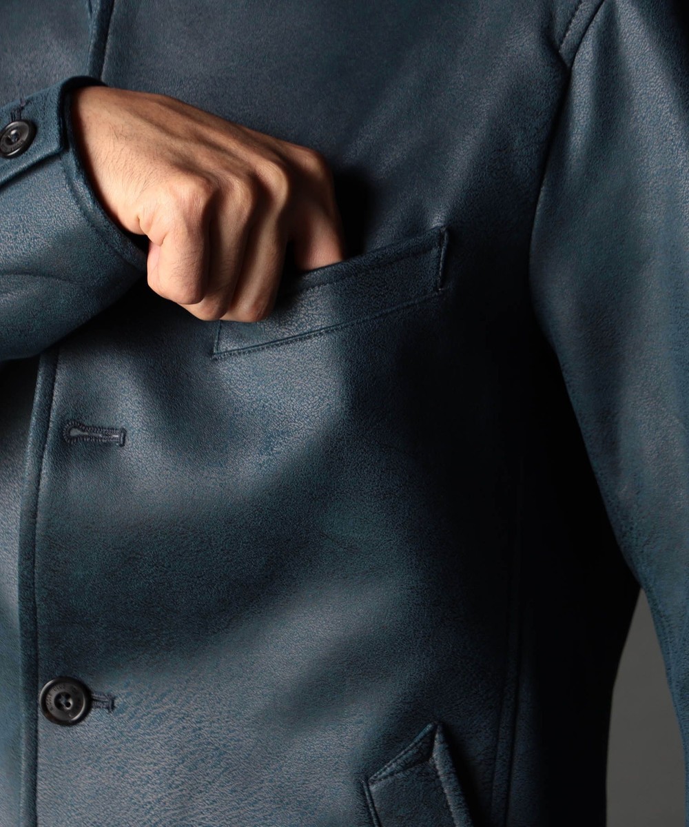 スタンド・イタリアンカラーのカヴァーオールデザインジャケット。衿端にはワイヤーを入れて遊べるようにし、その衿部分は折り返してラペルとしても綺麗に収まる設定です。衿タブで上まで止める事が出来るので防風性もあり、表地に追従する様にストレッチ裏地を採用した総裏仕様なので着心地も抜群です。左胸ポケットはフェイクチーフ仕様、袖口は本切羽、腰ポケットは斜めに作り、使いやすくしています。(一番下の釦は止める設定になっていませんのでご注意ください。)
