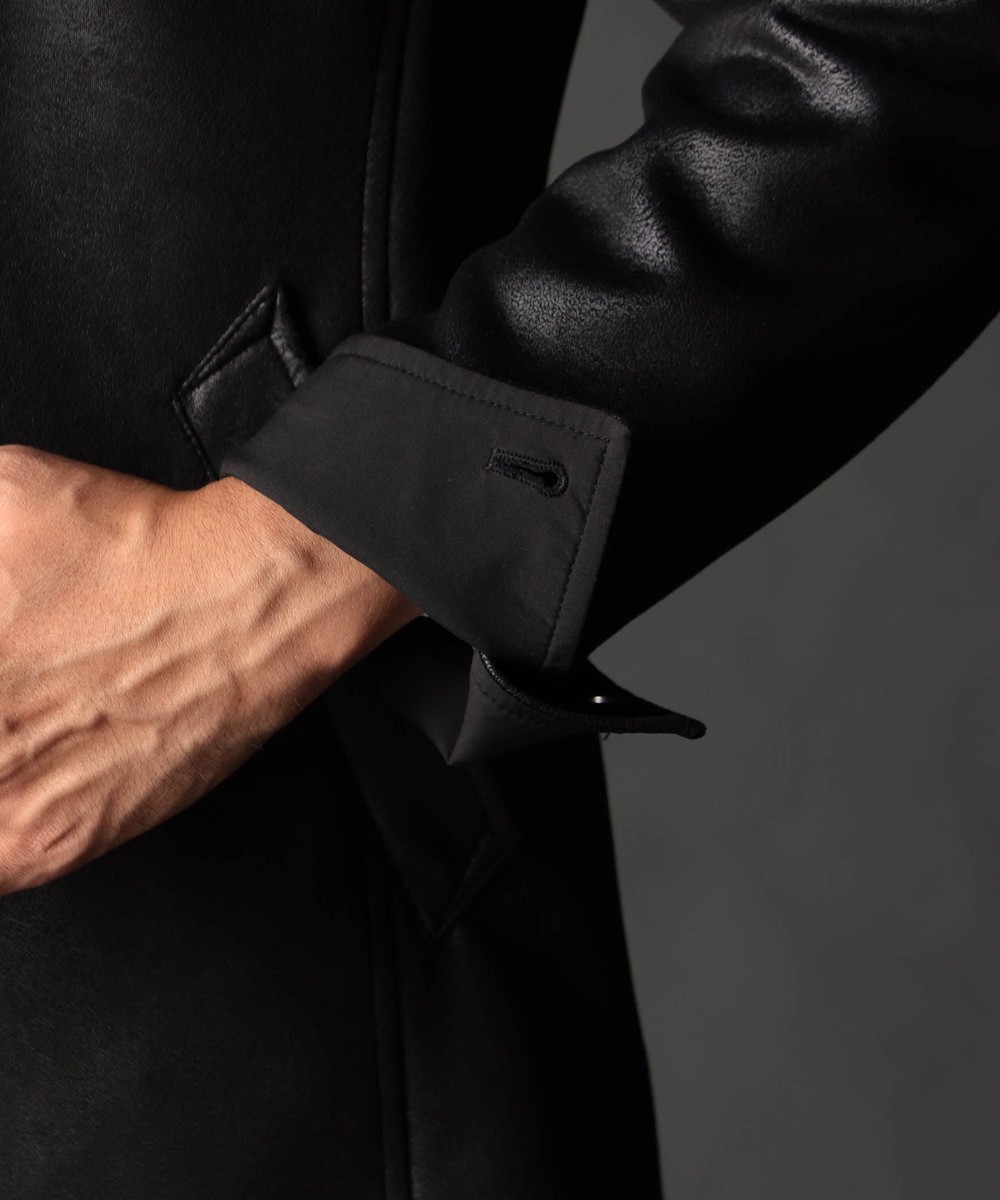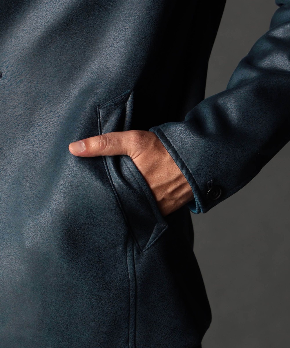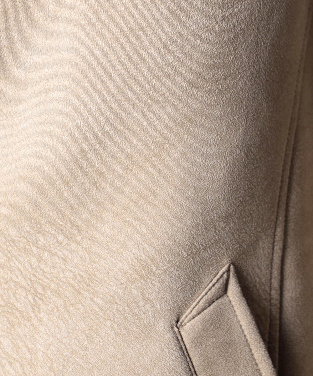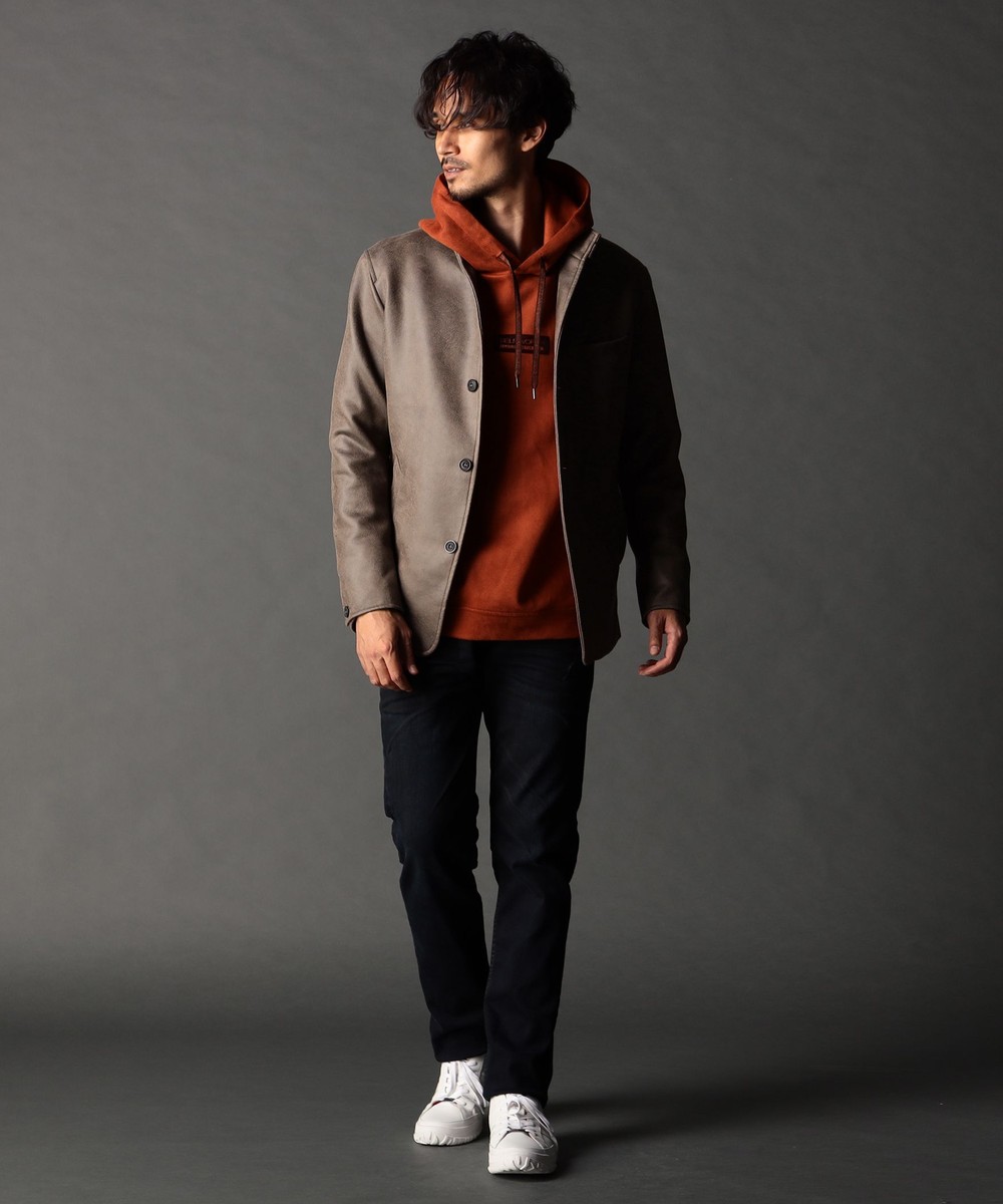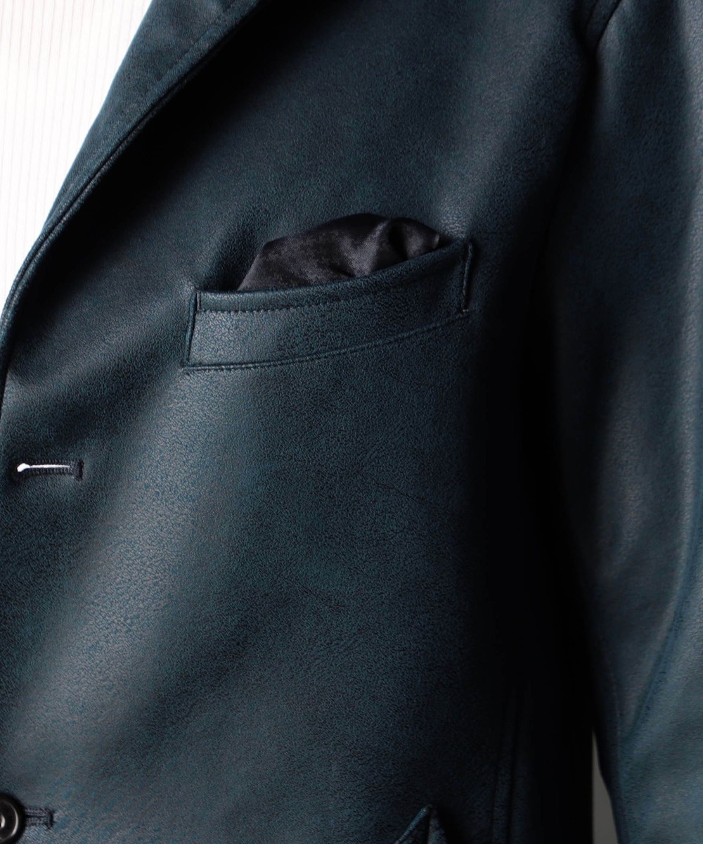 スタンド・イタリアンカラーのカヴァーオールデザインジャケット。衿端にはワイヤーを入れて遊べるようにし、その衿部分は折り返してラペルとしても綺麗に収まる設定です。衿タブで上まで止める事が出来るので防風性もあり、表地に追従する様にストレッチ裏地を採用した総裏仕様なので着心地も抜群です。左胸ポケットはフェイクチーフ仕様、袖口は本切羽、腰ポケットは斜めに作り、使いやすくしています。(一番下の釦は止める設定になっていませんのでご注意ください。)