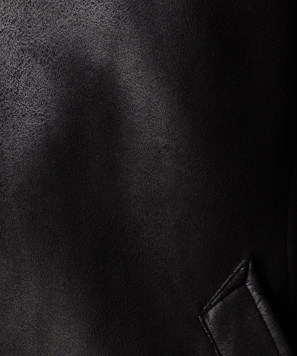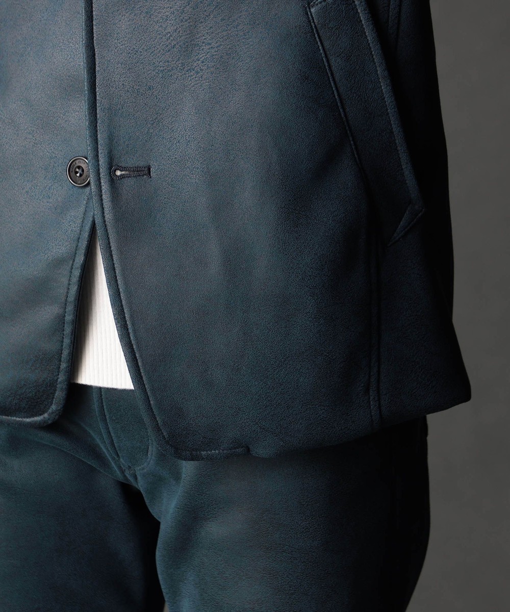 ポリエステルのマイクロファイバーで編まれたポンチ素材の表面をスウェード起毛、滑らかなタッチとソフト風合いを特徴にしたカットソー素材です。トーン違いの同色系ムラプリントを施して革パンの様なレザーライクな見え方に作っています。マルチなストレッチ性、ジャージ素材なのではのプリッとした横張り感もあり、シルエットを綺麗に作ります。更に生地加工で撥水効果をプラス、防汚効果を高めています。今季新色の60ピーコックブルーを展開します。