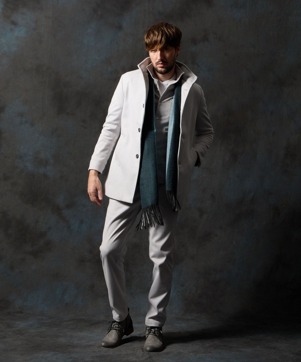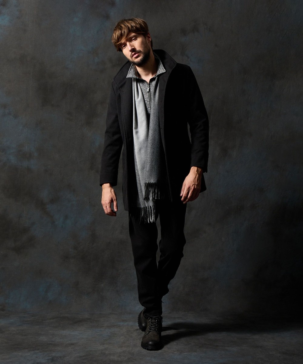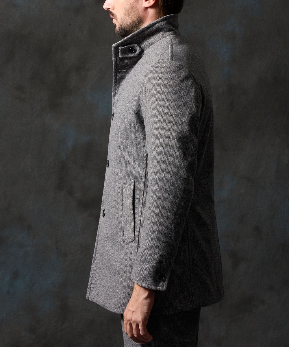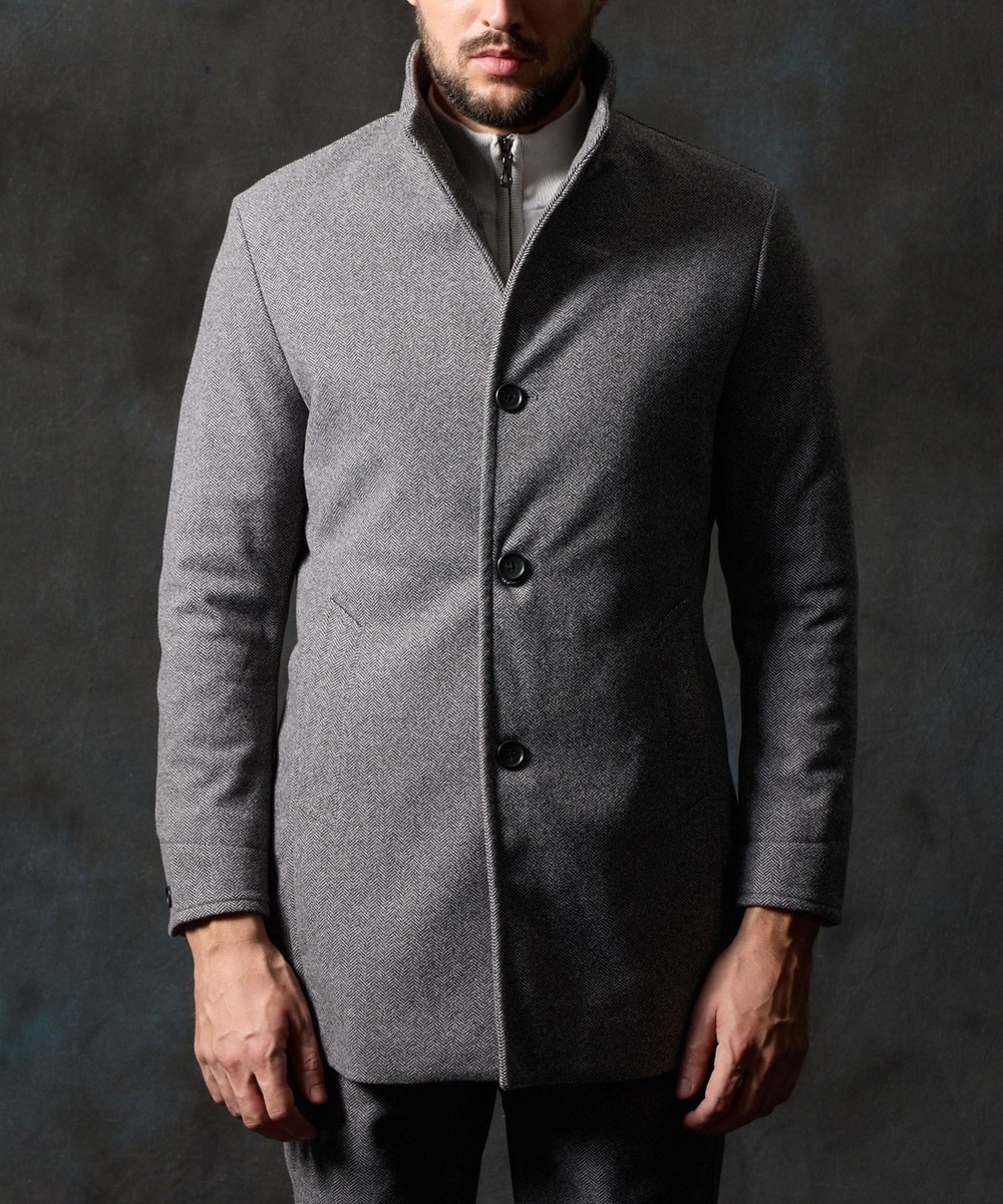 シンプルなデザインのミドル丈スタンドコート(48サイズで着丈80cm)。