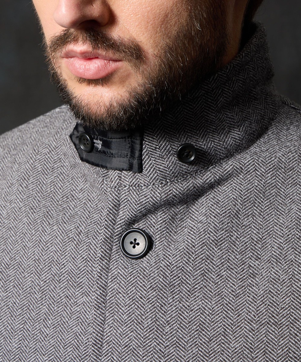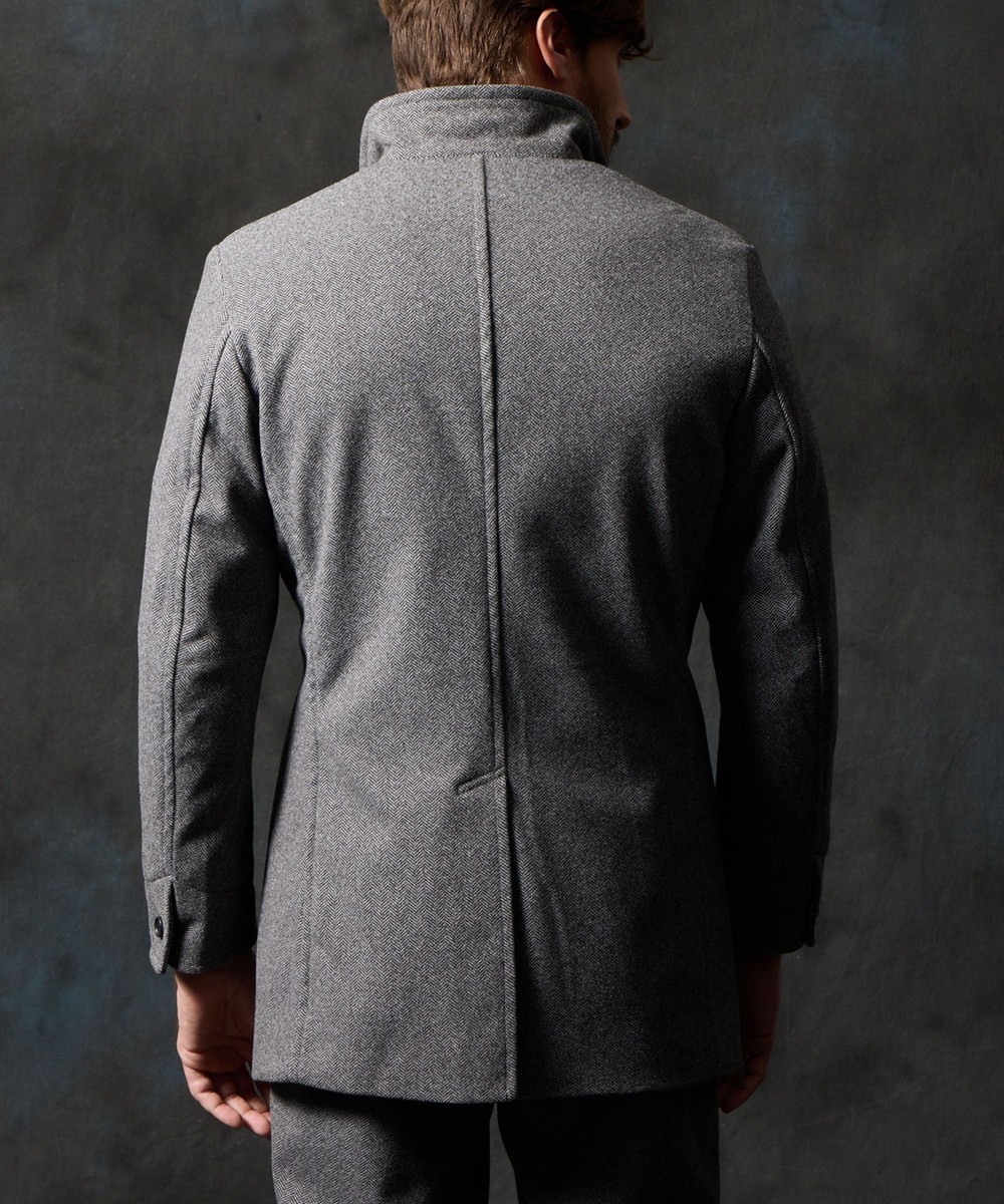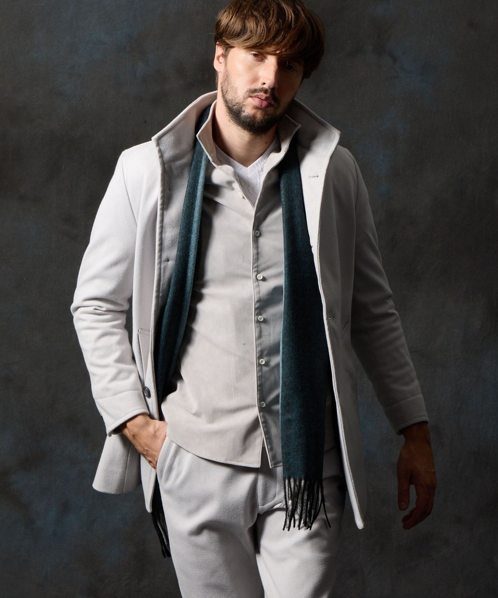 シンプルなデザインのミドル丈スタンドコート(48サイズで着丈80cm)。