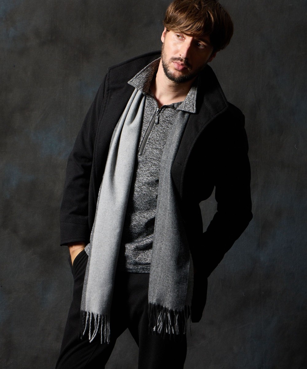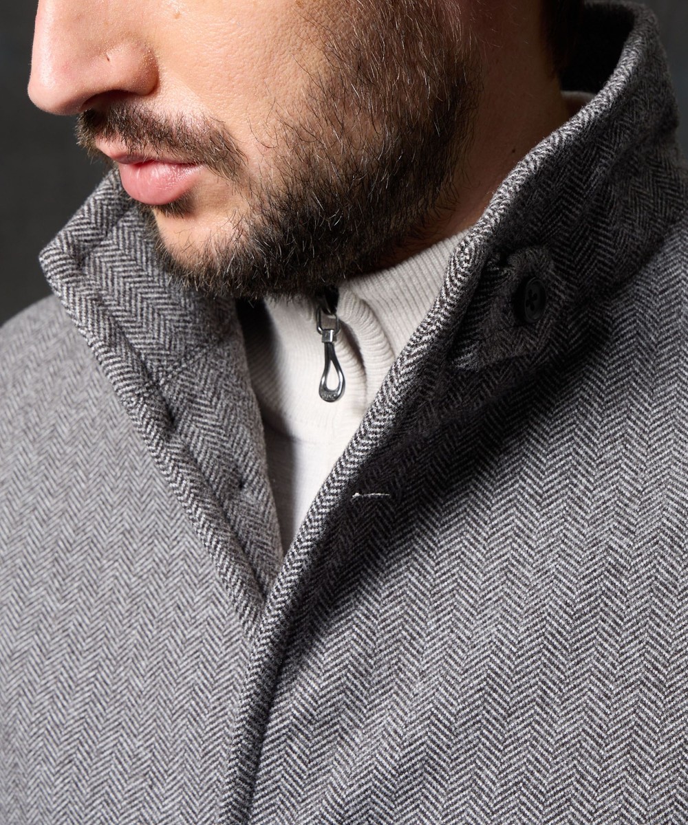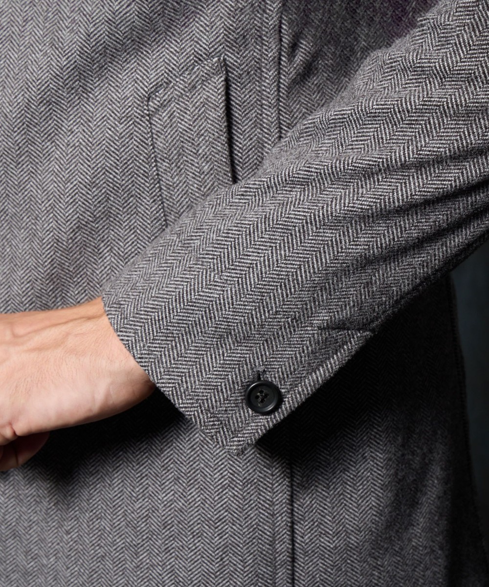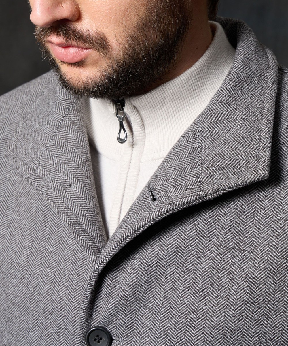 シンプルなデザインのミドル丈スタンドコート(48サイズで着丈80cm)。