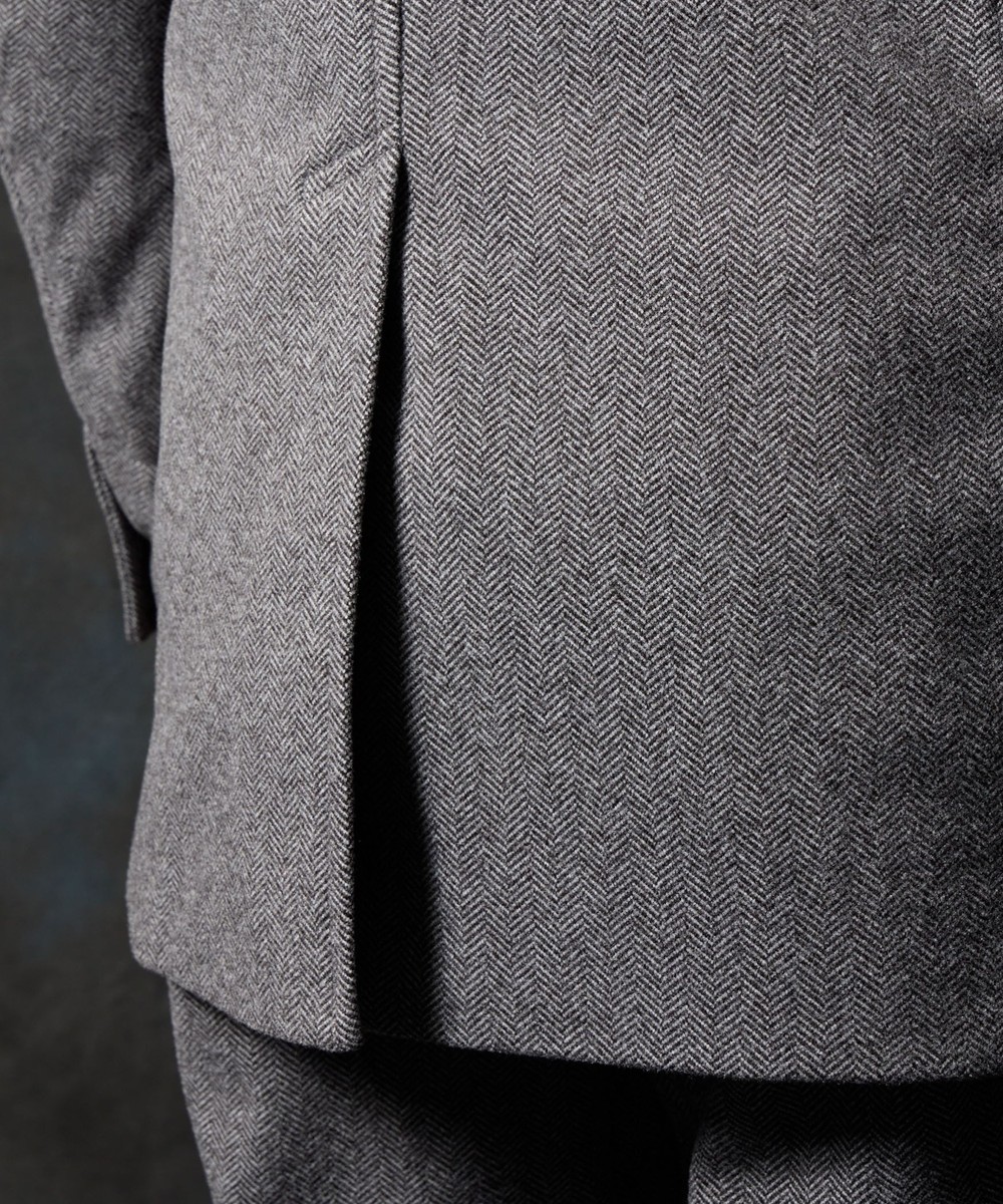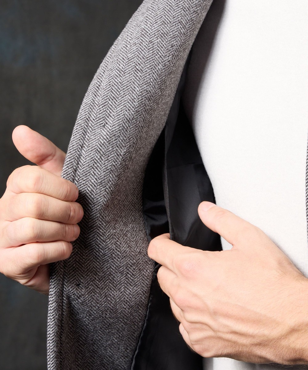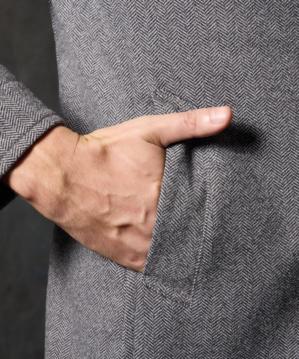 しっかりした厚みがありながら軽い着心地で、ポリエステルの張り感が仕立て映えする素材です。