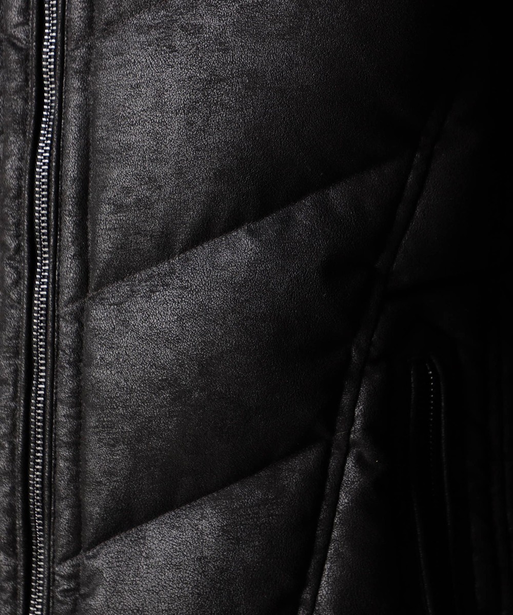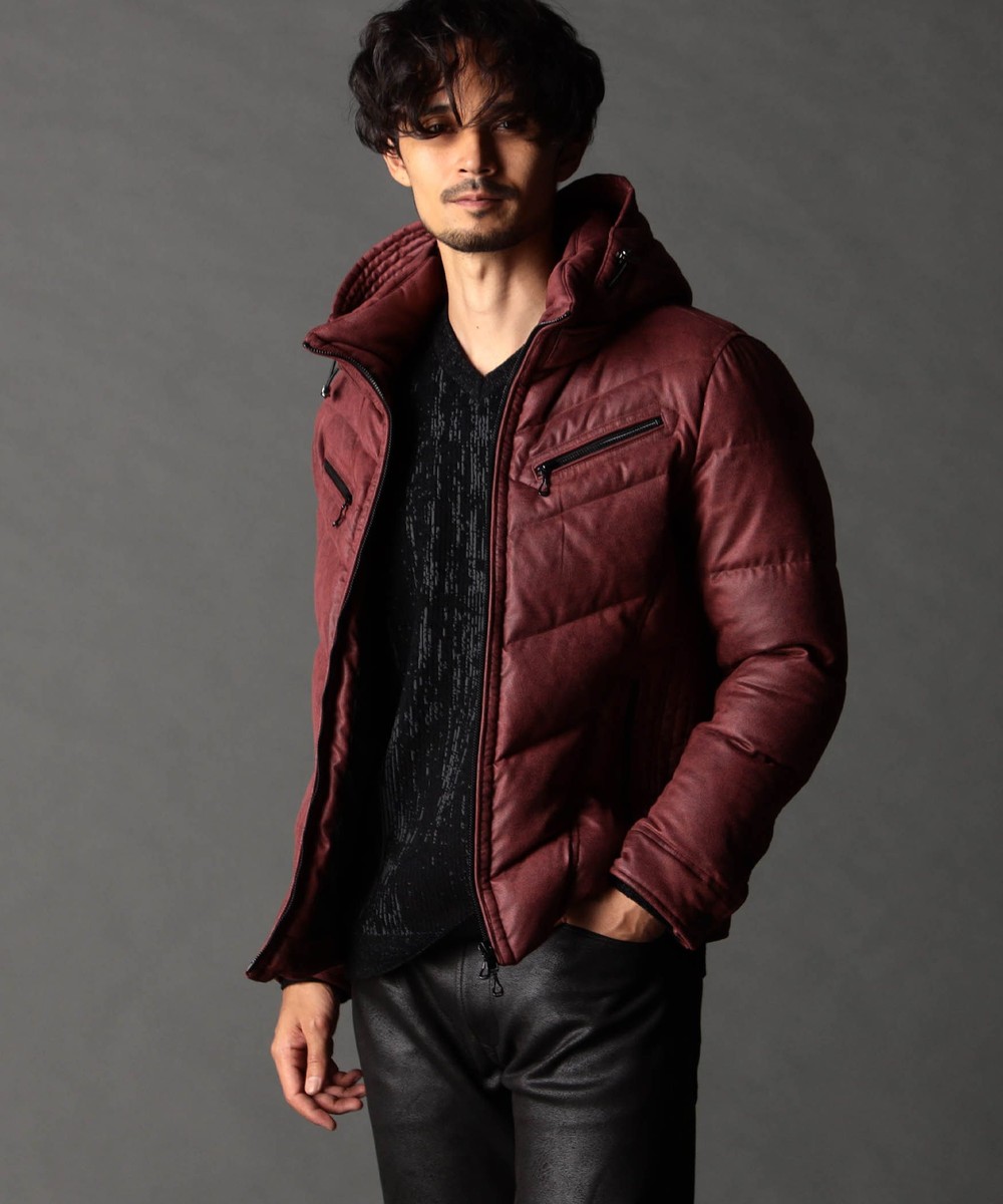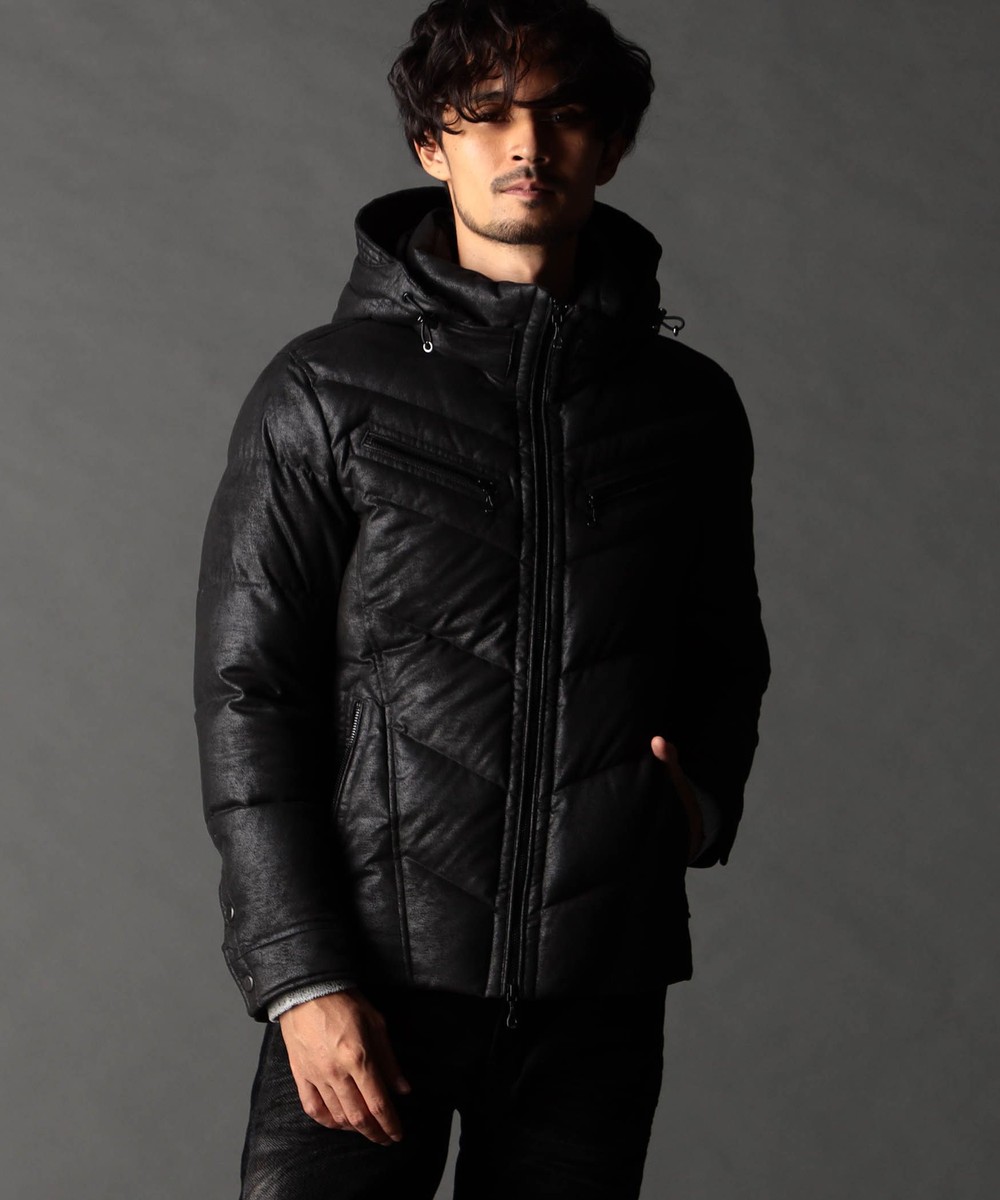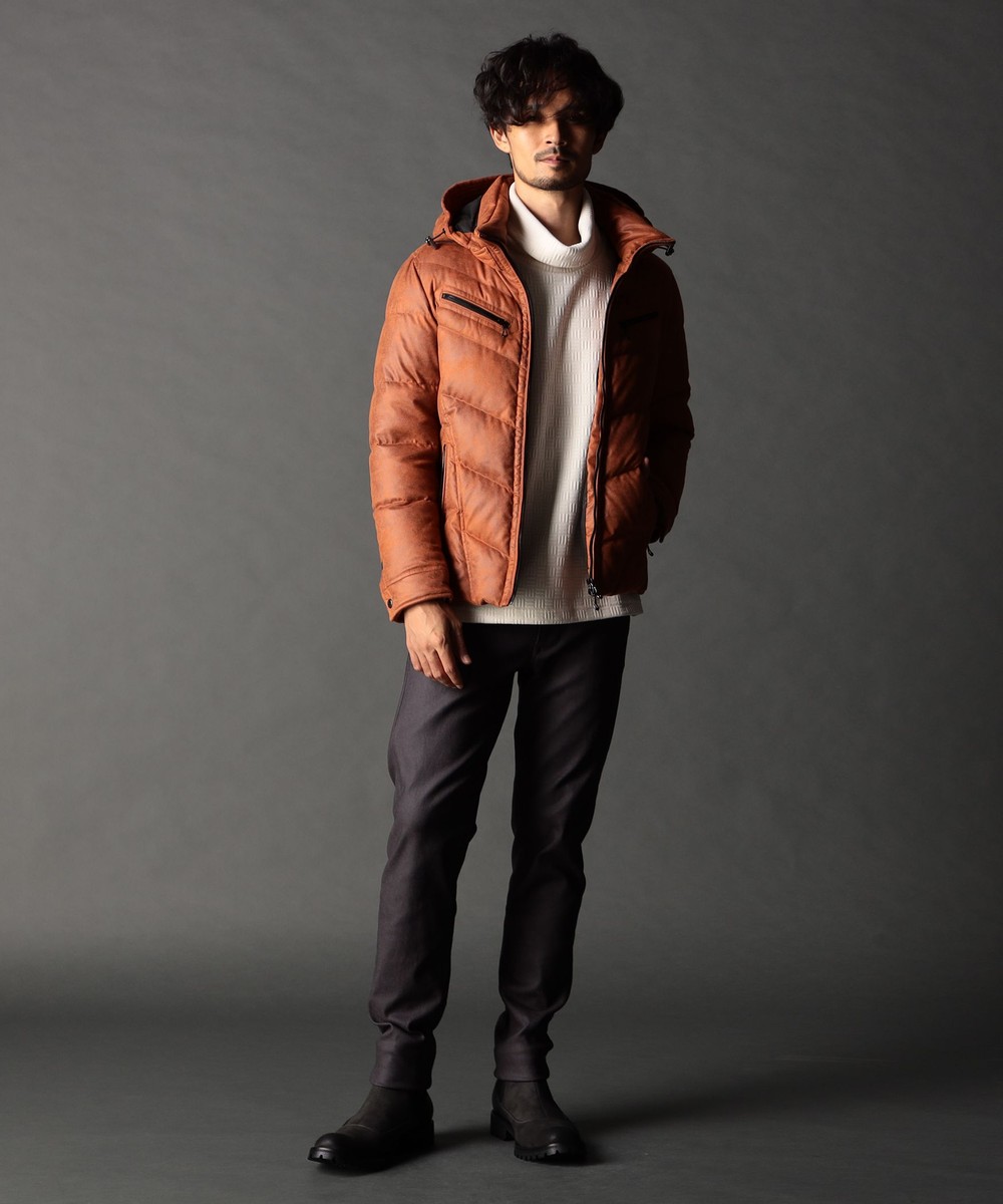 ウエストシェイプが綺麗なシャープなシルエットのライダースダウンブルゾン。逆三角形に見える切り替えデザインとダウンステッチ、細腹のタテステッチで綺麗なシルエットを強調。特徴的な前振りのライダース袖は脇下部分のダウンを抜く事で落ち着きを良くし、更にマチ布を作って動きやすさと見栄えを良くしています。背中の裏地と袖の裏地をバイアス裁断して表地のストレッチ性、腕の動きに追従するようにしています。YKK別注のブラックエナメルファスナーやブランドロゴのエンボスプリントを入れた裏地、オリジナルドット釦、着脱出来るフード仕様、蓄熱機能裏地を部分的に使い、衿吊りの帯電防止用テープなど細かいディテールまで拘って作っています。内ポケットはパッチポケットと、胸辺りに身返しとの切り替えを利用したスラッシュポケットを両身に配置しています。トップメゾンも取り扱うベトナムのダウン専門工場で作っていますので、細かい縫製仕様も仕上がりも良く出来ています。今季は衿の後ろ下の所にメタル調ネームを付けています。