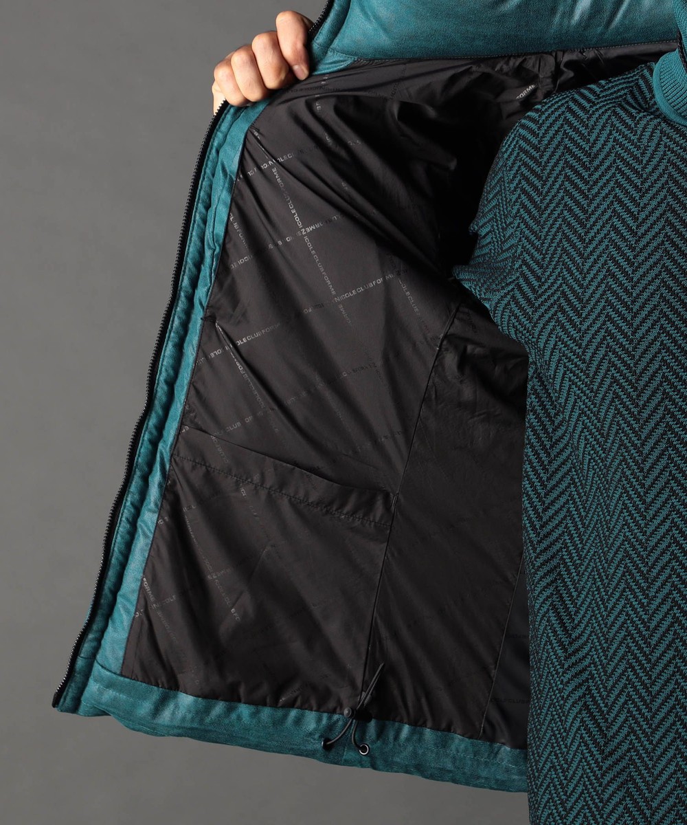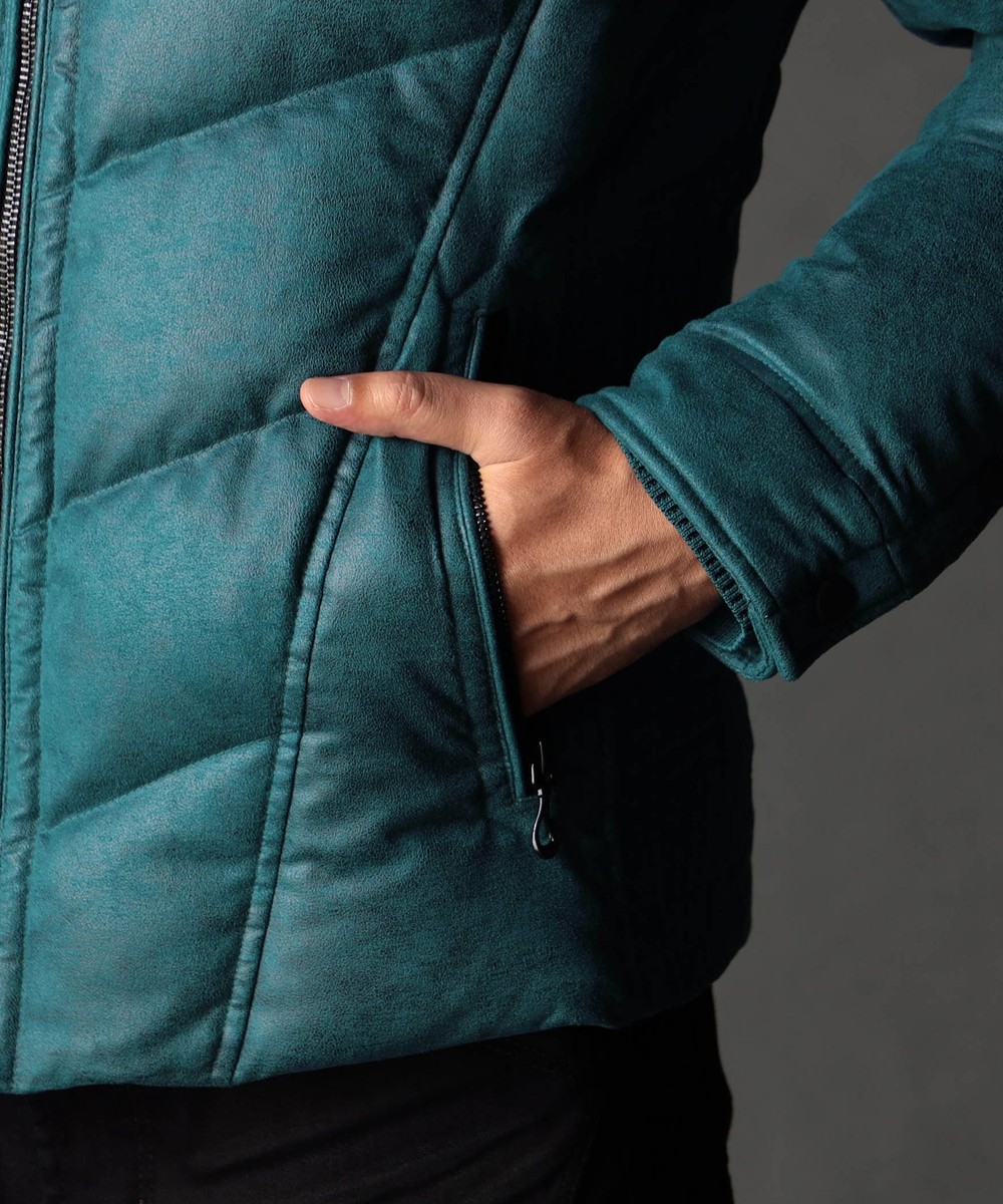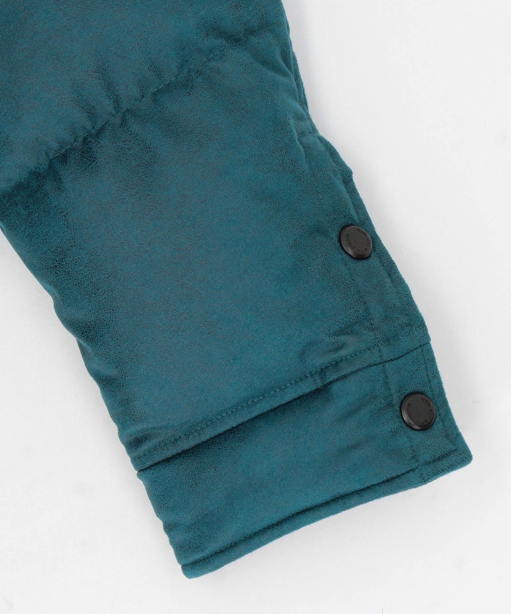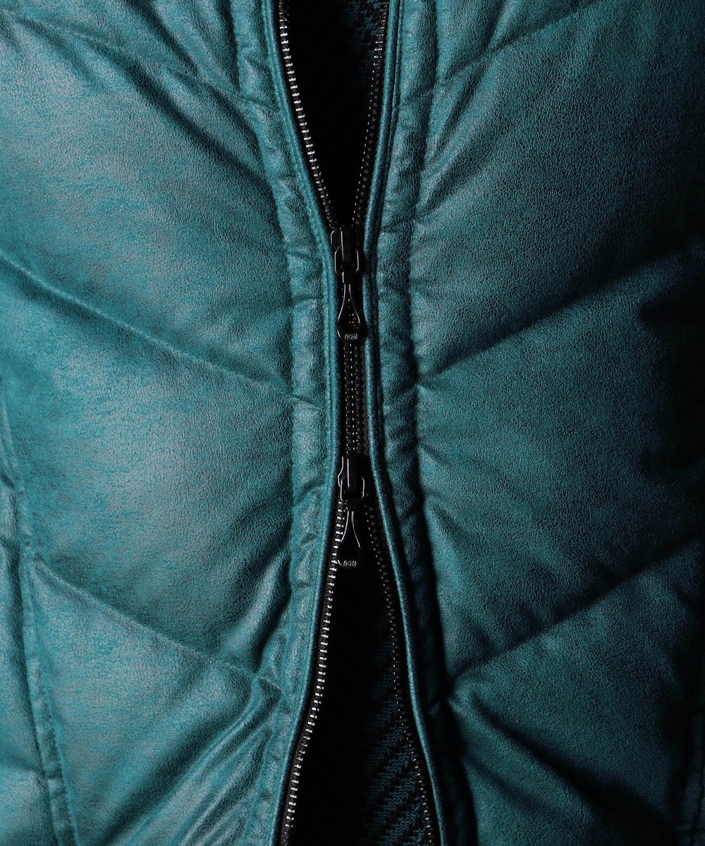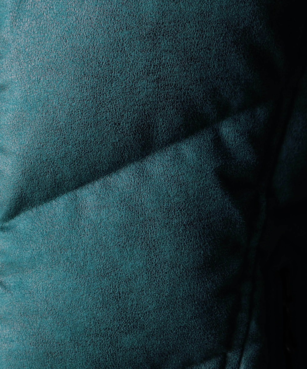 マイクロファイバーで織られた薄手のポリエステル生地を起毛加工したのスウェード素材をベースに、微光沢の同色系ムラプリントを施しています。奥行きのある見え方に、マイクロスウェードの滑らかなタッチ感と上品な光沢感が特徴です。ストレッチ性もあるので、程良いダウン分量でも適度な張り感とフィット感を高めます。生地加工で撥水効果を高め、中身のダウンには撥水加工を施したシルバー(グレー)ダックダウンを採用する事で家庭洗濯を可能にしています。衿や細腹、小パーツにはシートタイプの中わたを採用して型崩れしにくくしています。今季新色60ピーコックブルーを展開します。