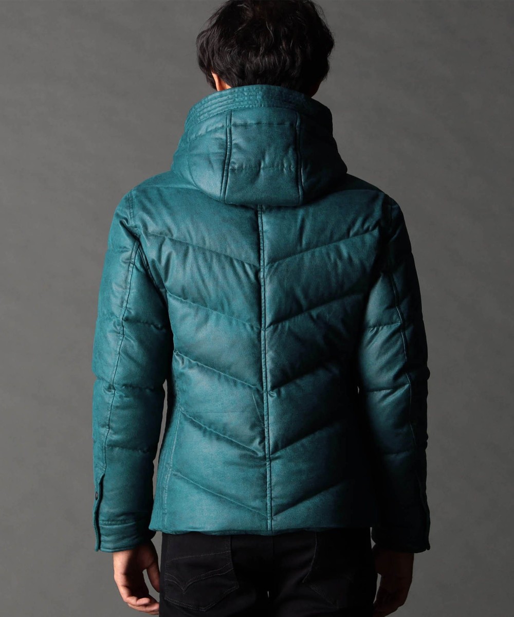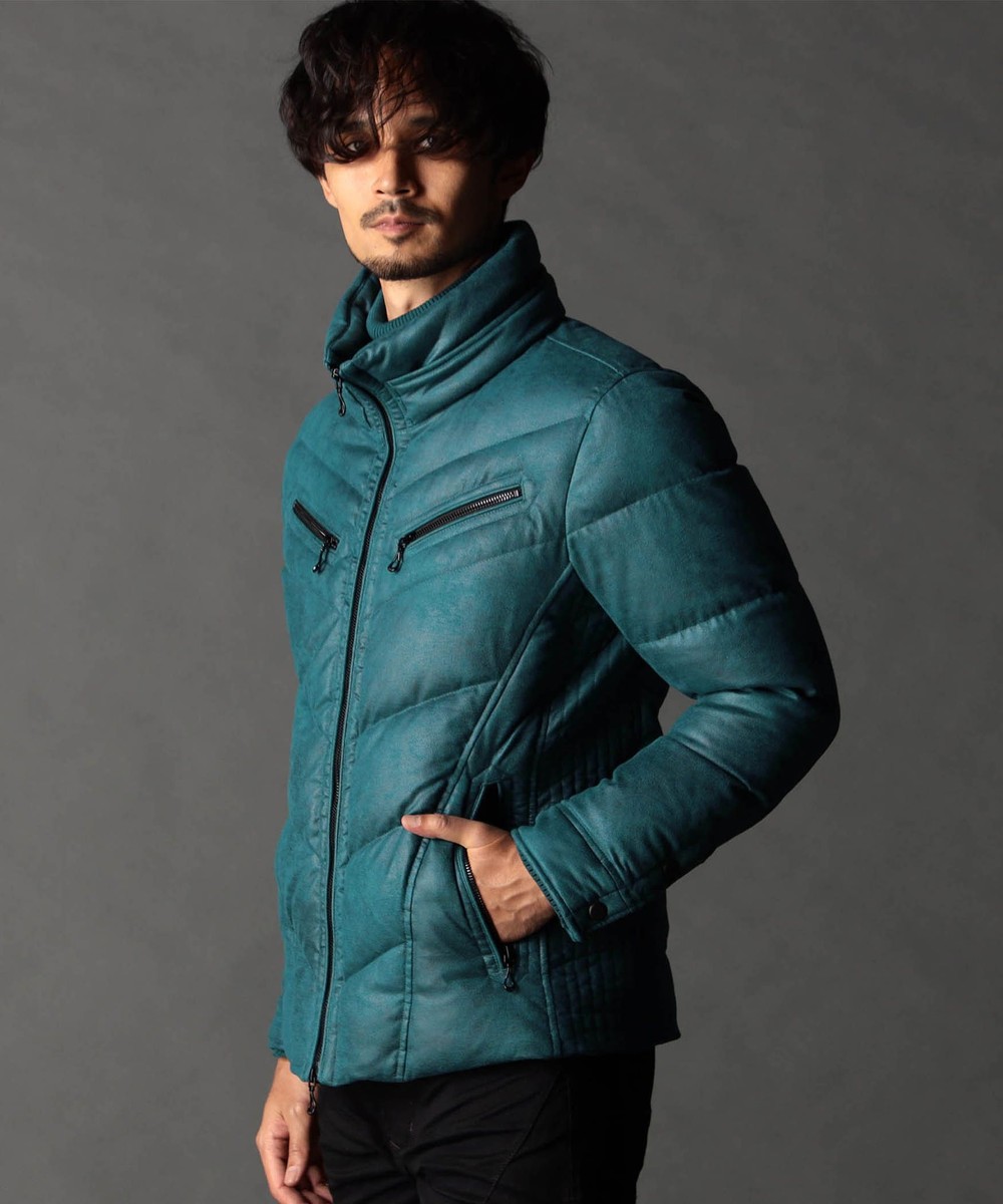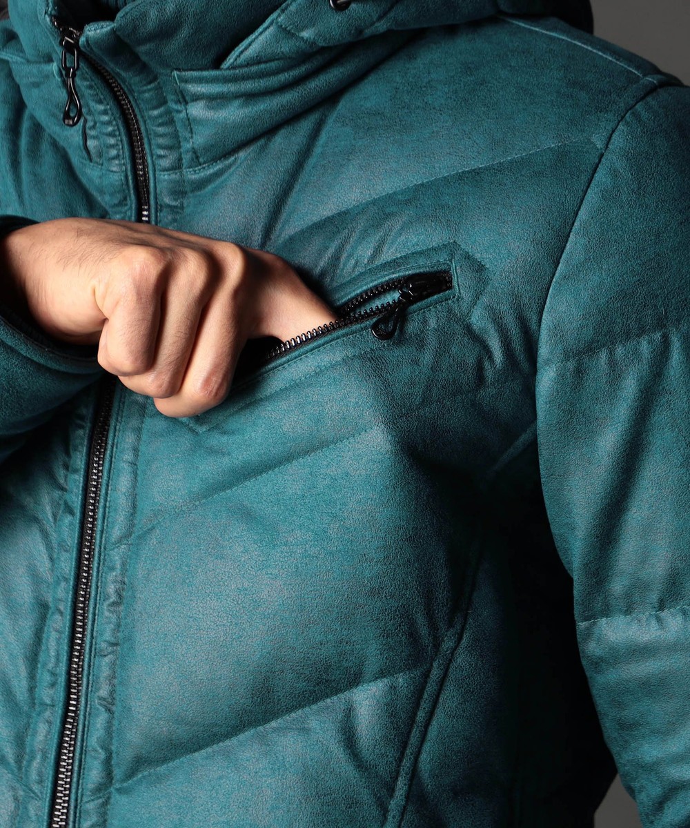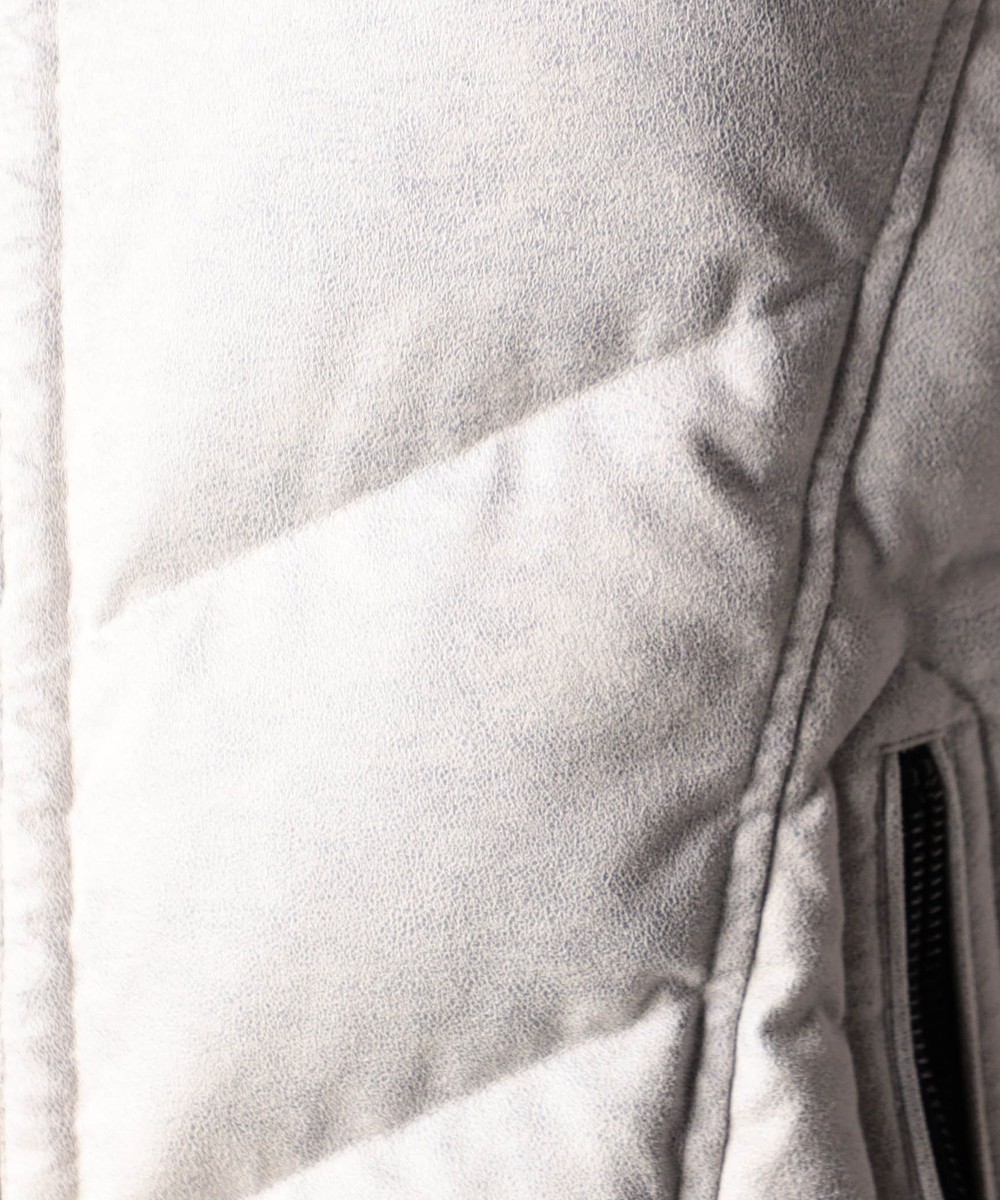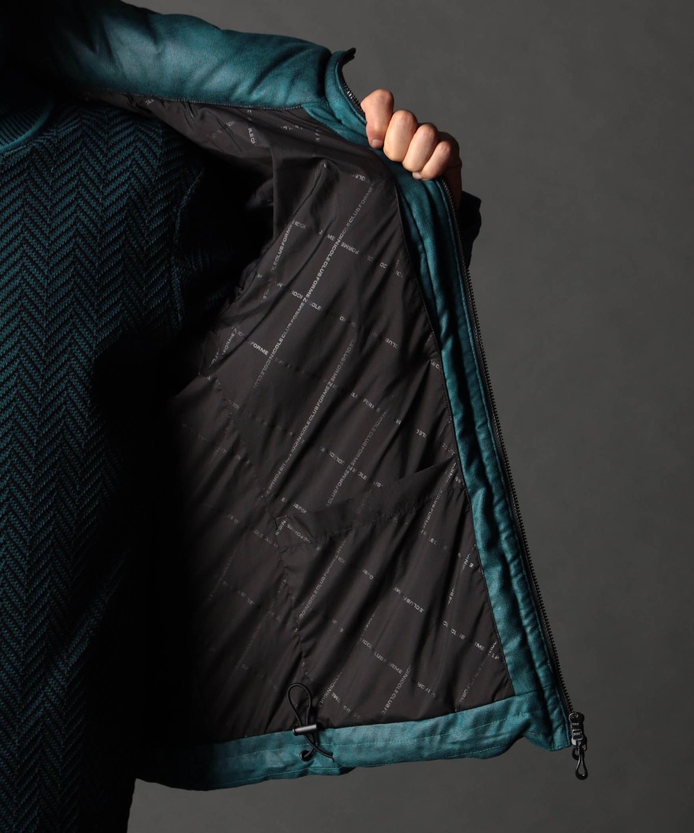 マイクロファイバーで織られた薄手のポリエステル生地を起毛加工したのスウェード素材をベースに、微光沢の同色系ムラプリントを施しています。奥行きのある見え方に、マイクロスウェードの滑らかなタッチ感と上品な光沢感が特徴です。ストレッチ性もあるので、程良いダウン分量でも適度な張り感とフィット感を高めます。生地加工で撥水効果を高め、中身のダウンには撥水加工を施したシルバー(グレー)ダックダウンを採用する事で家庭洗濯を可能にしています。衿や細腹、小パーツにはシートタイプの中わたを採用して型崩れしにくくしています。今季新色60ピーコックブルーを展開します。