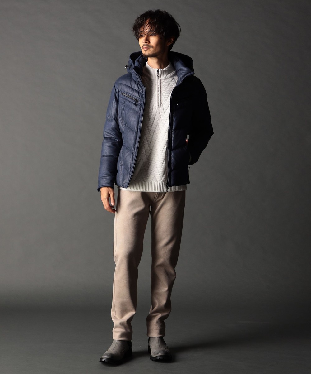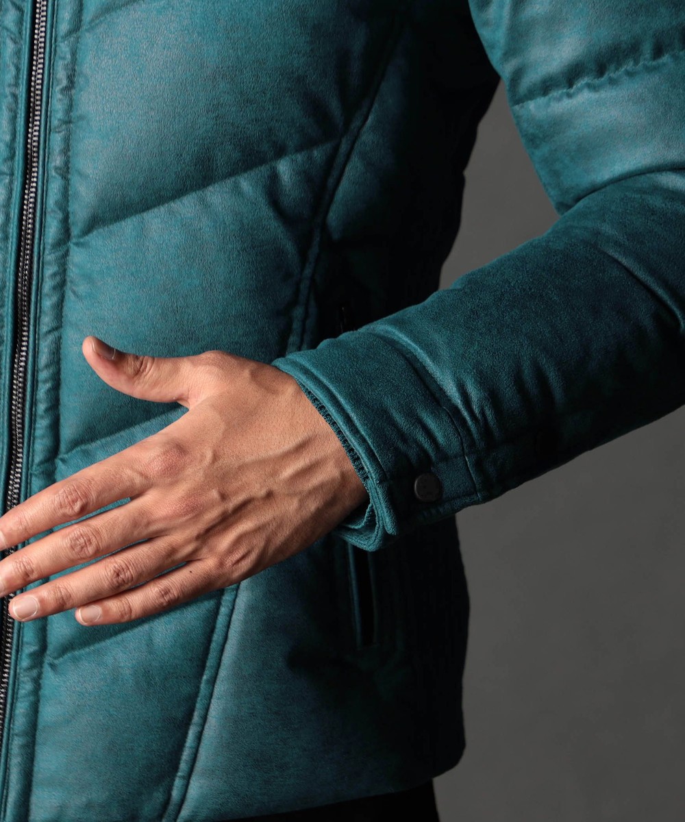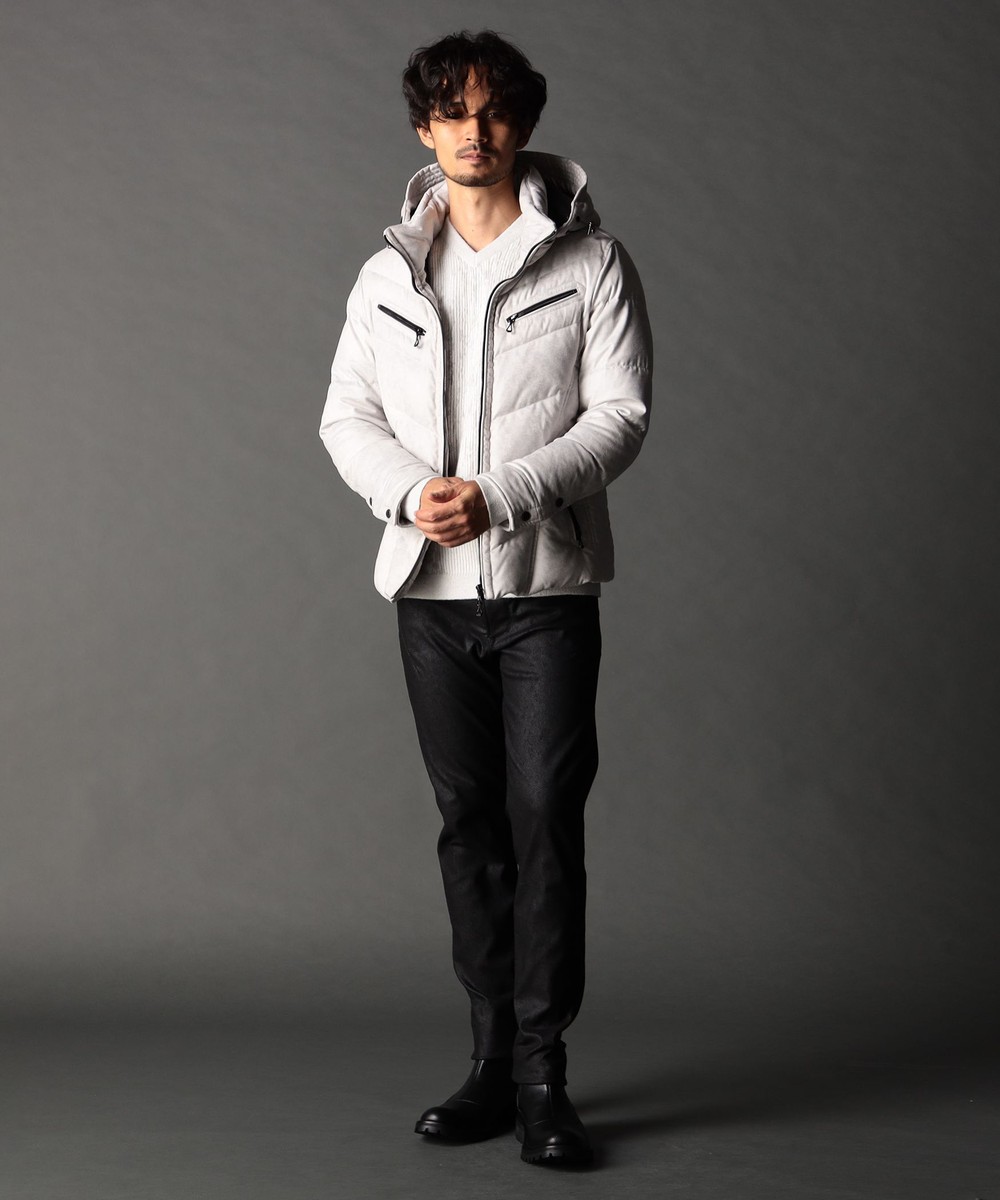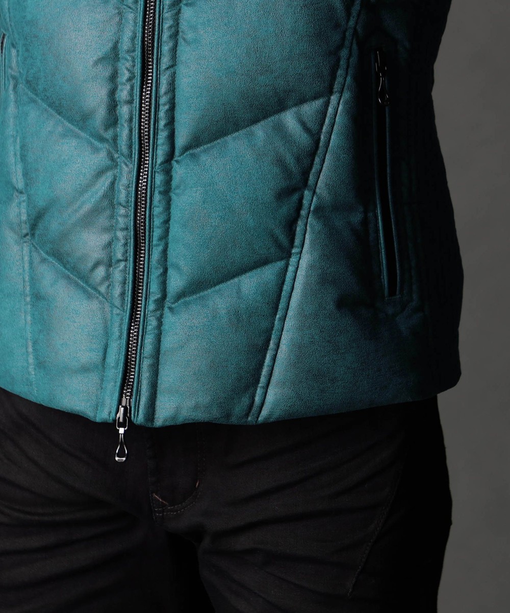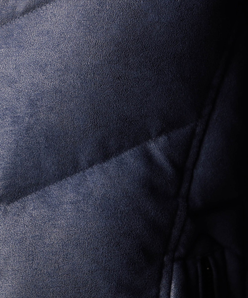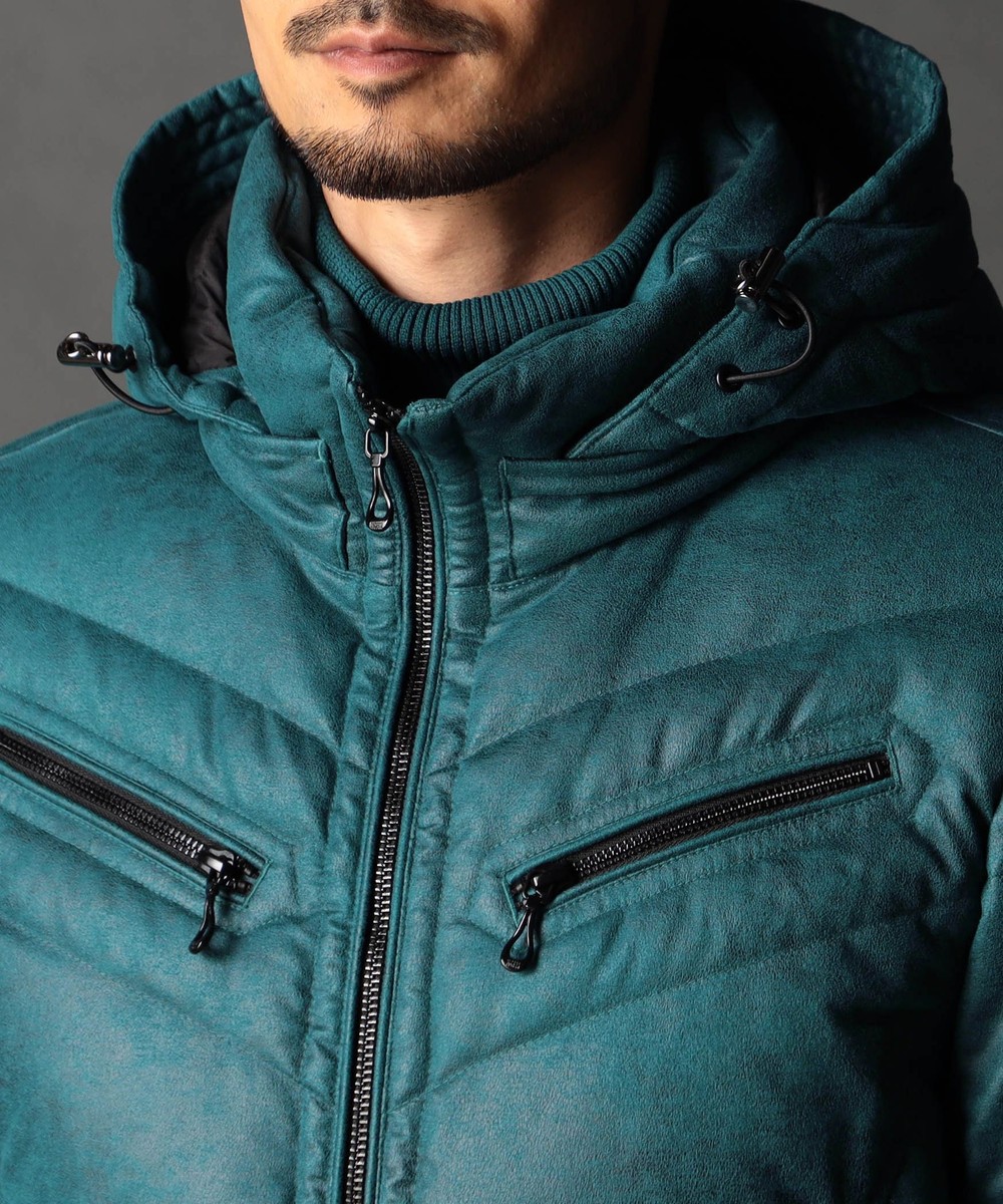 マイクロファイバーで織られた薄手のポリエステル生地を起毛加工したのスウェード素材をベースに、微光沢の同色系ムラプリントを施しています。奥行きのある見え方に、マイクロスウェードの滑らかなタッチ感と上品な光沢感が特徴です。ストレッチ性もあるので、程良いダウン分量でも適度な張り感とフィット感を高めます。生地加工で撥水効果を高め、中身のダウンには撥水加工を施したシルバー(グレー)ダックダウンを採用する事で家庭洗濯を可能にしています。衿や細腹、小パーツにはシートタイプの中わたを採用して型崩れしにくくしています。今季新色60ピーコックブルーを展開します。