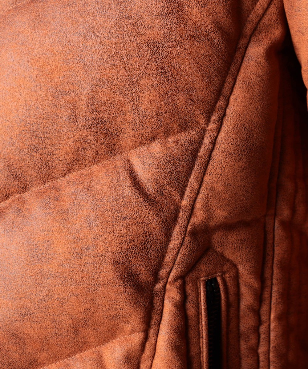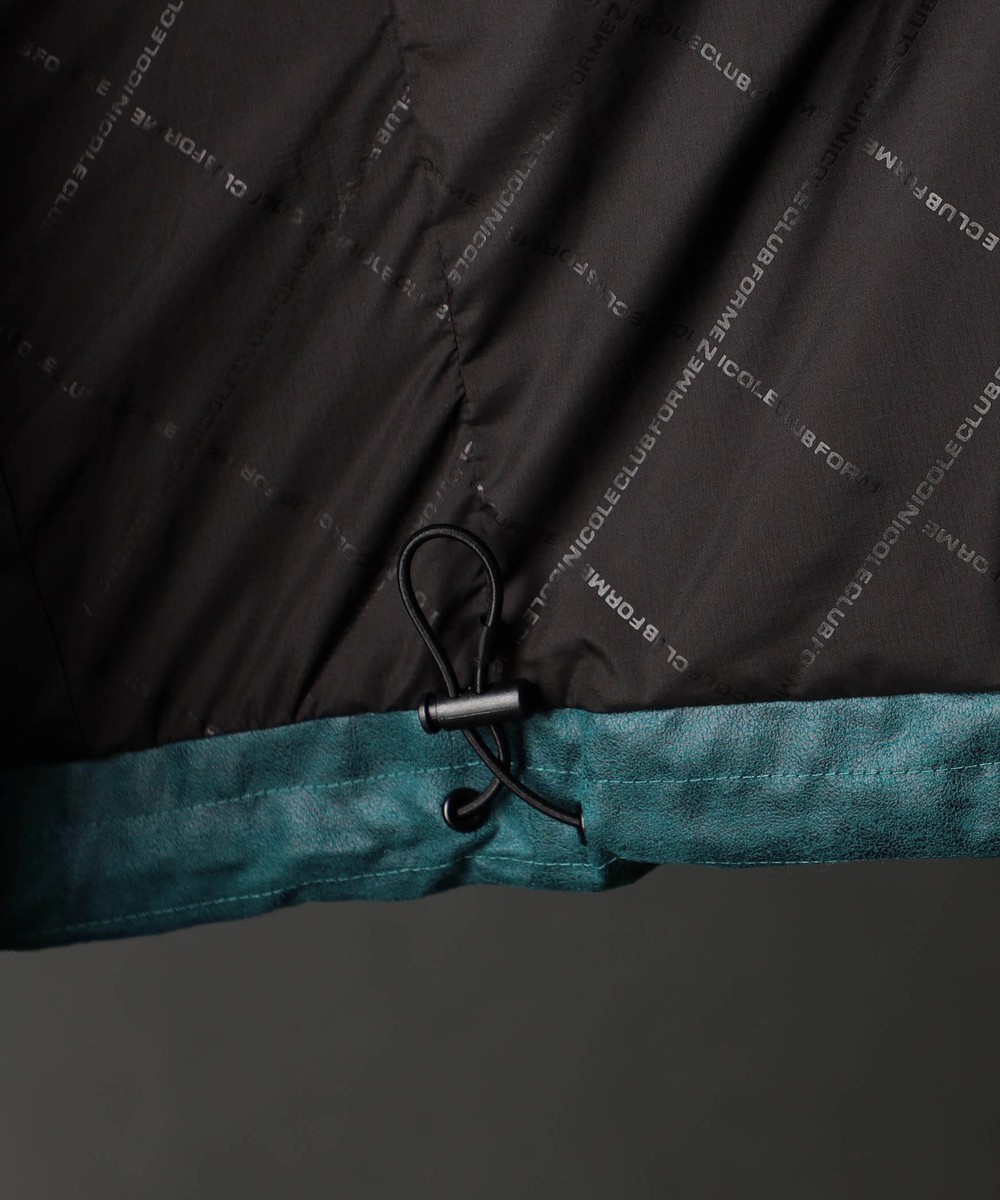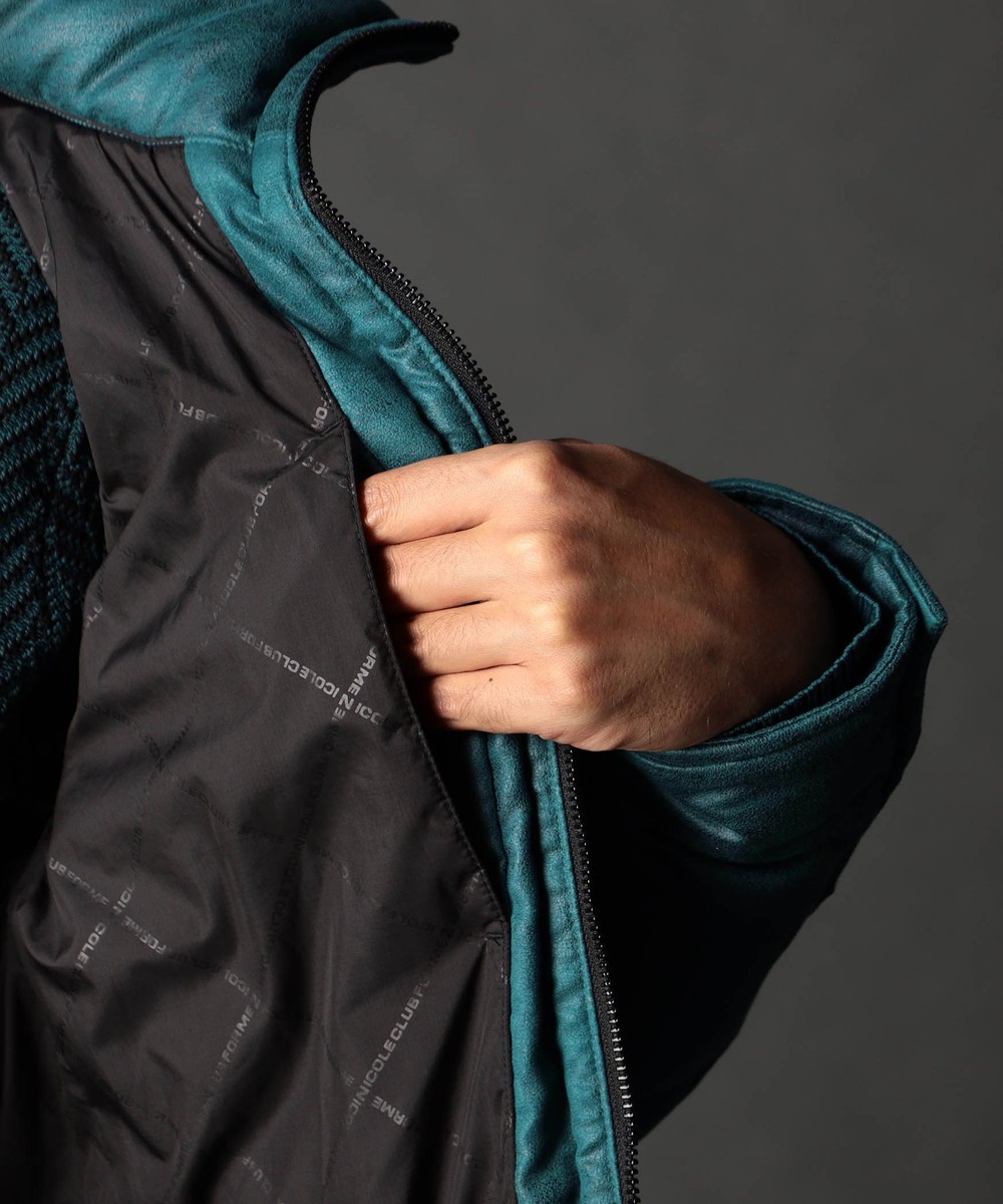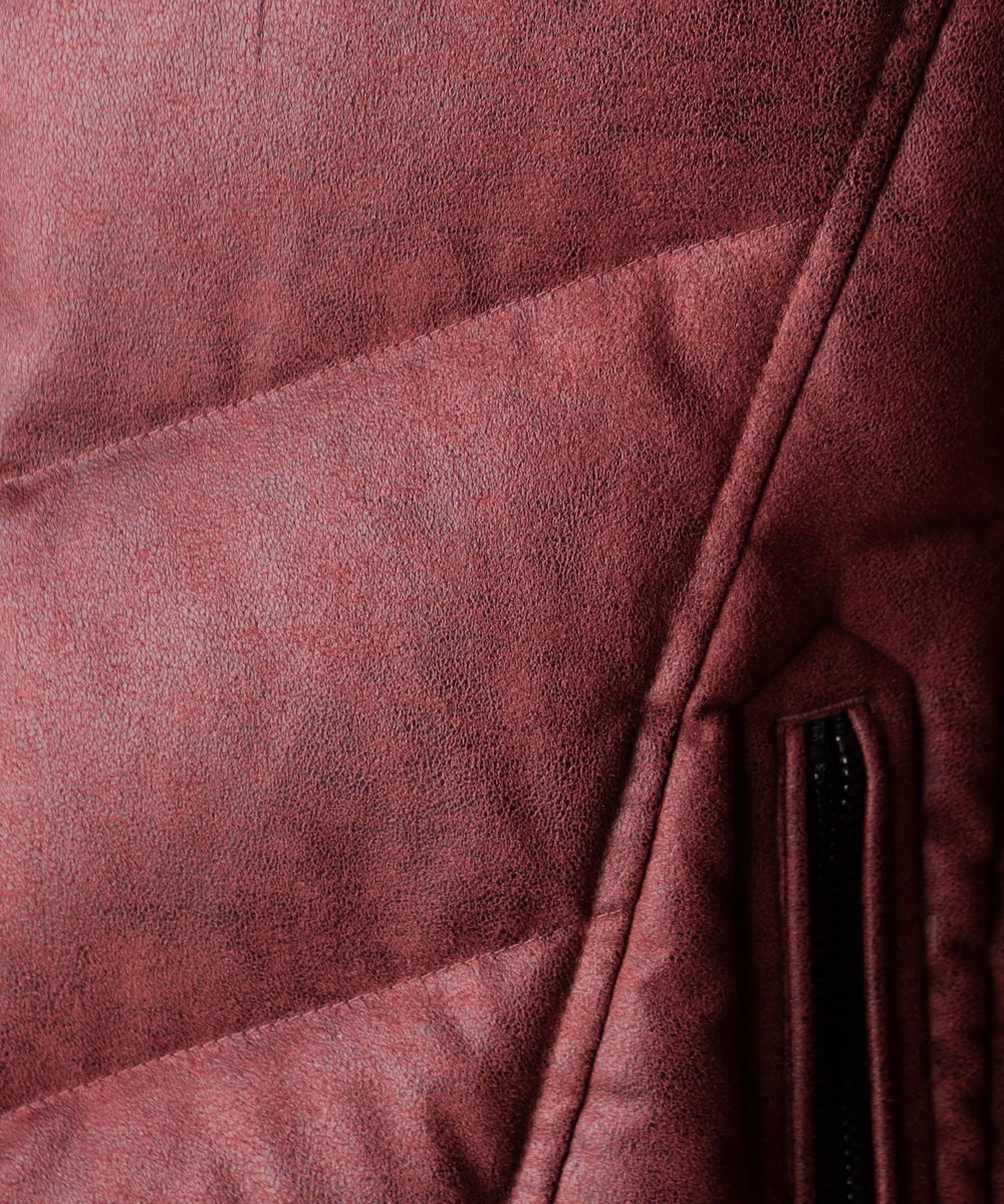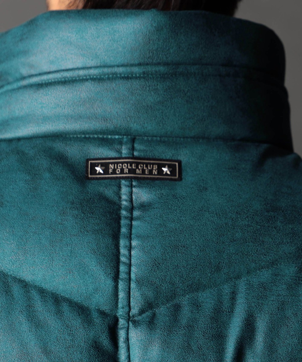 マイクロファイバーで織られた薄手のポリエステル生地を起毛加工したのスウェード素材をベースに、微光沢の同色系ムラプリントを施しています。奥行きのある見え方に、マイクロスウェードの滑らかなタッチ感と上品な光沢感が特徴です。ストレッチ性もあるので、程良いダウン分量でも適度な張り感とフィット感を高めます。生地加工で撥水効果を高め、中身のダウンには撥水加工を施したシルバー(グレー)ダックダウンを採用する事で家庭洗濯を可能にしています。衿や細腹、小パーツにはシートタイプの中わたを採用して型崩れしにくくしています。今季新色60ピーコックブルーを展開します。
