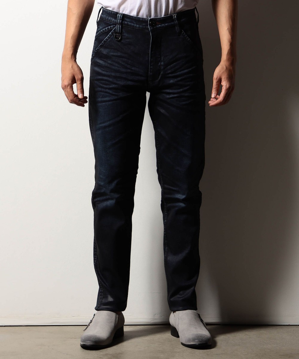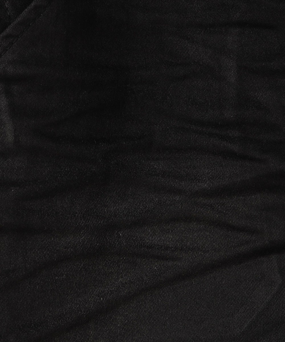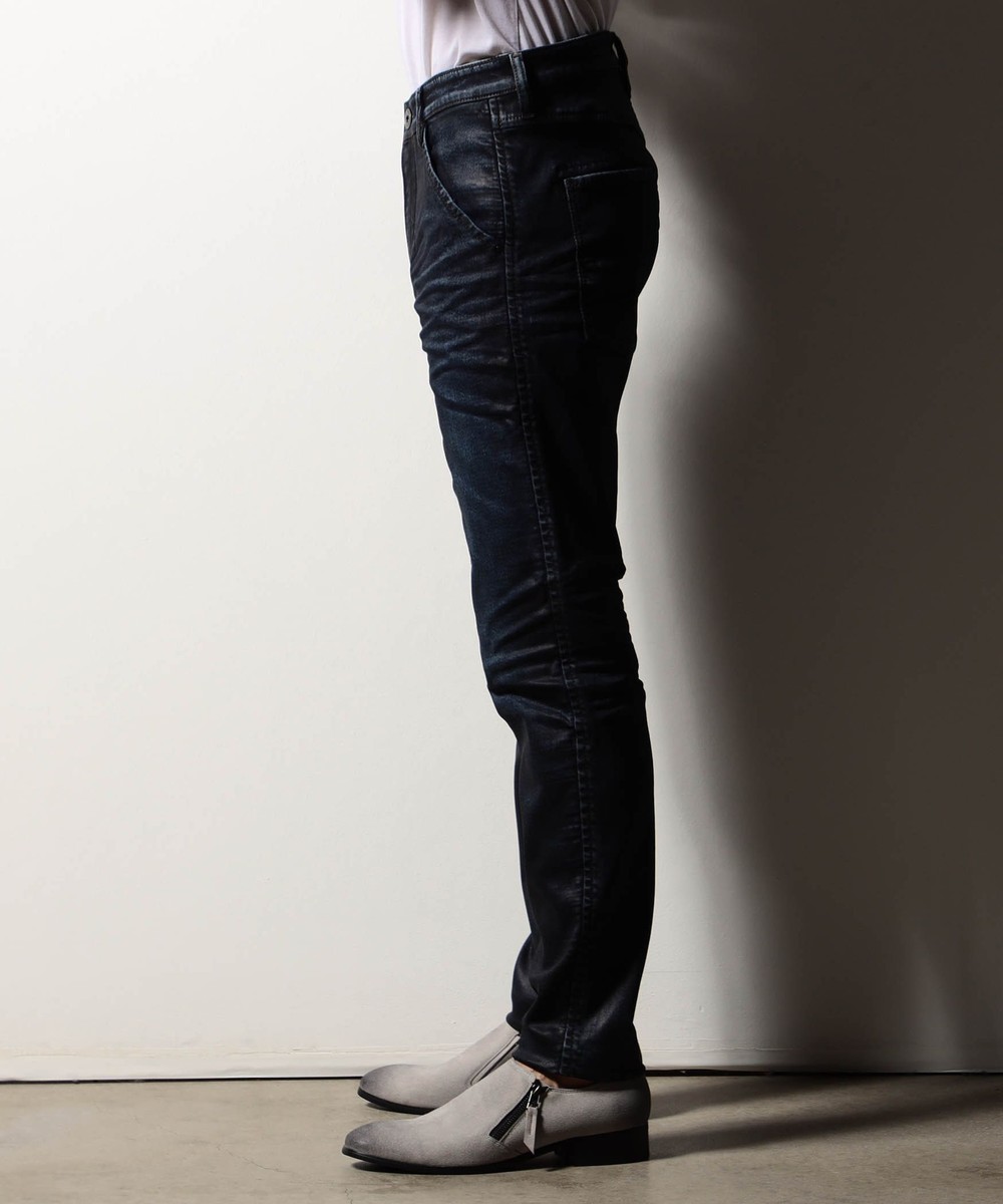 最終の製品加工を岡山のデニム専門の加工所(Wellsウェルズ)に依頼。中国でベースのユーズド加工を施し、全体のサイズ感を縮率調整してから国内にて最終加工を施しています。冬企画なので、黒顔料を混ぜた樹脂コーティング剤を全体的に吹き付け、濃いめに仕上げています。所々アイロンでしっかり抑える事で縫い代の厚みがある部分や平たい部分に光沢を出して革パンの様な深い色味に仕上げます。最後に立体的でリアルな3Dシワ加工を施しています。