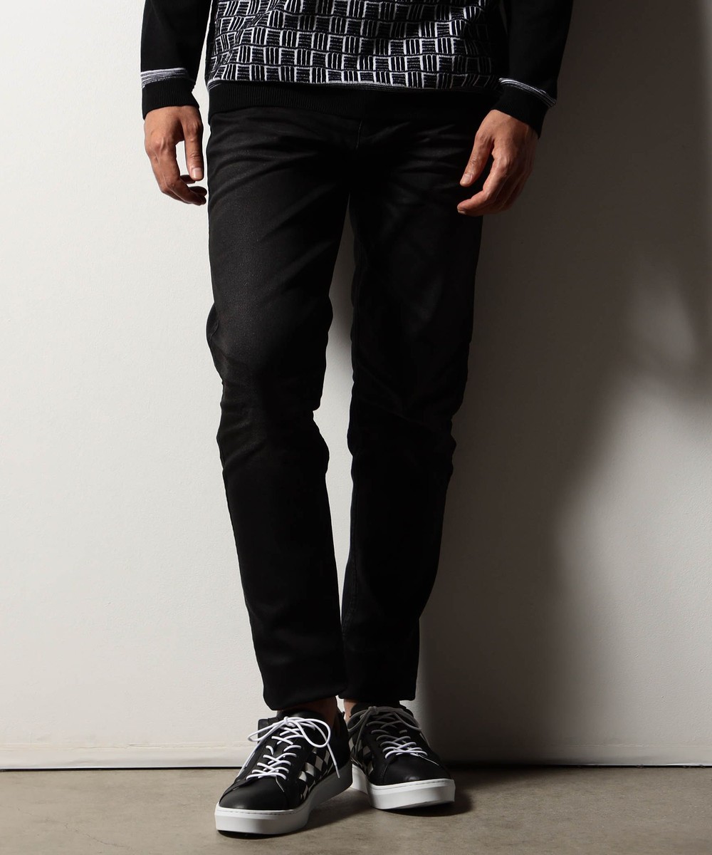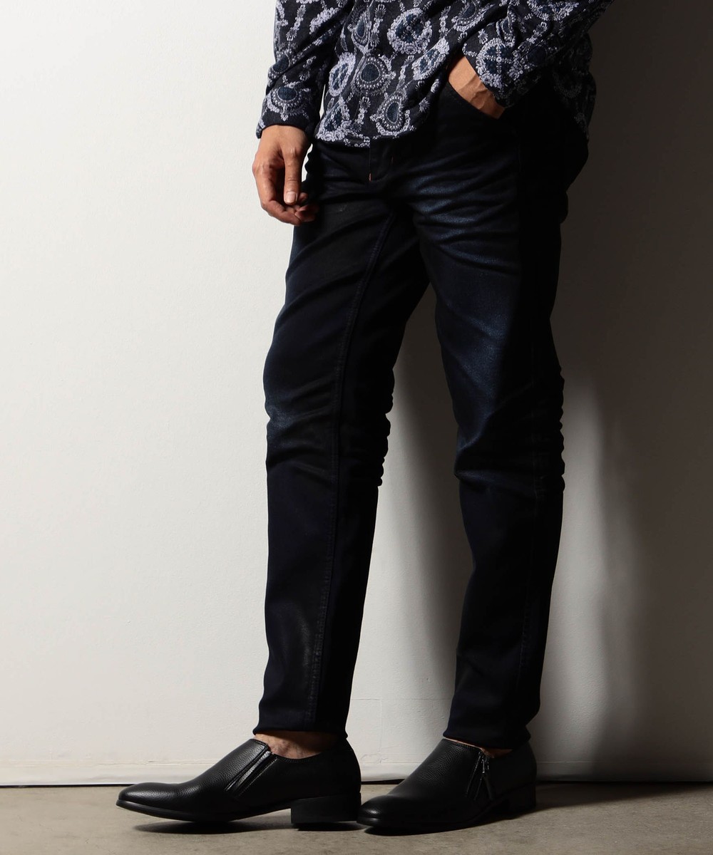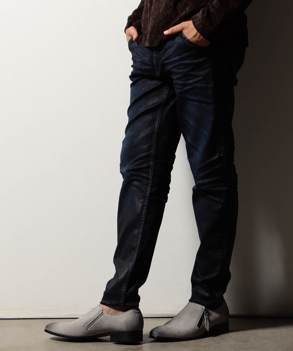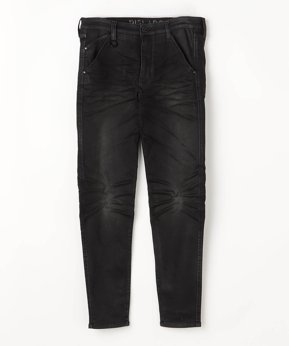 最終の製品加工を岡山のデニム専門の加工所(Wellsウェルズ)に依頼。中国でベースのユーズド加工を施し、全体のサイズ感を縮率調整してから国内にて最終加工を施しています。冬企画なので、黒顔料を混ぜた樹脂コーティング剤を全体的に吹き付け、濃いめに仕上げています。所々アイロンでしっかり抑える事で縫い代の厚みがある部分や平たい部分に光沢を出して革パンの様な深い色味に仕上げます。最後に立体的でリアルな3Dシワ加工を施しています。