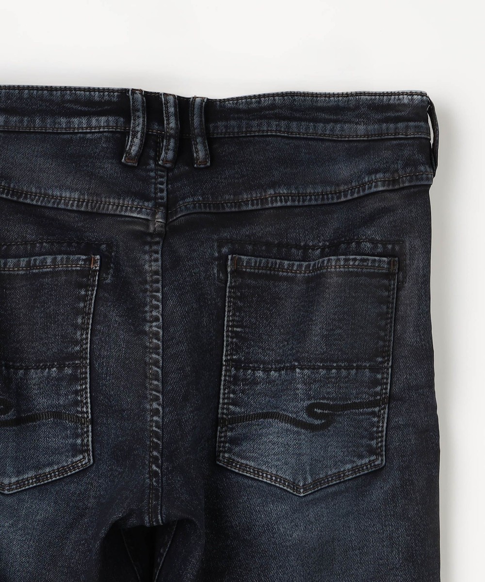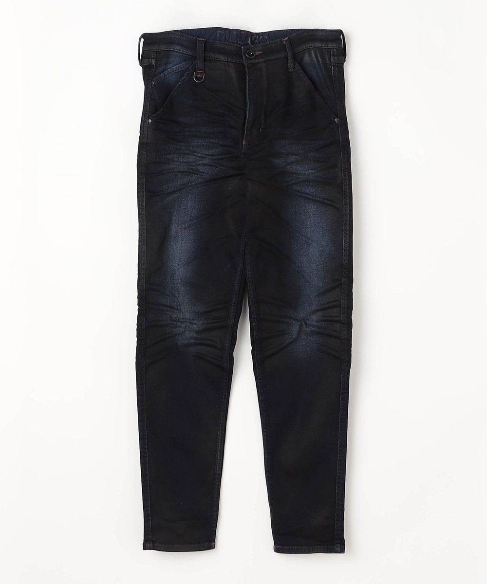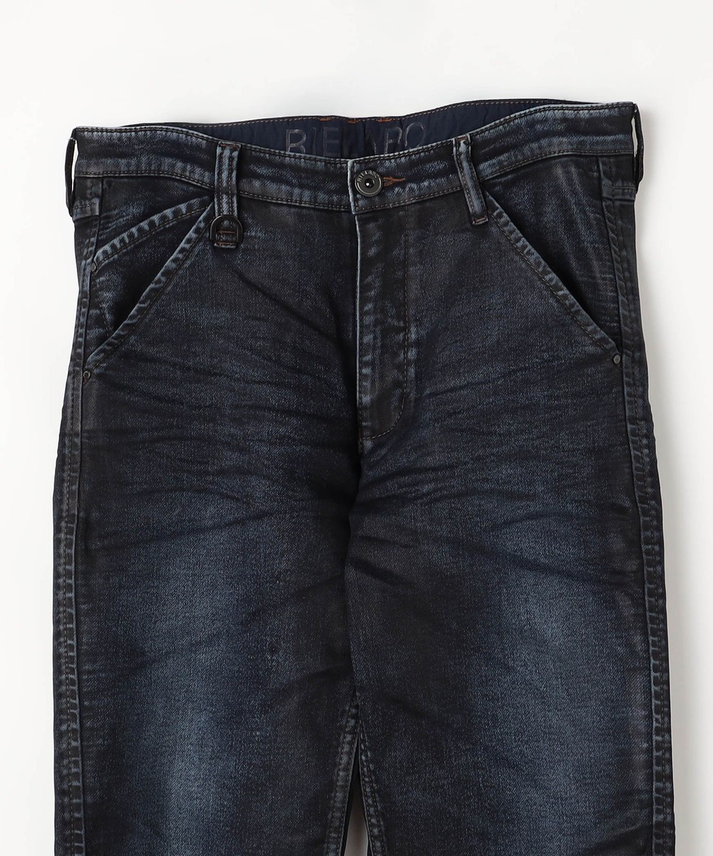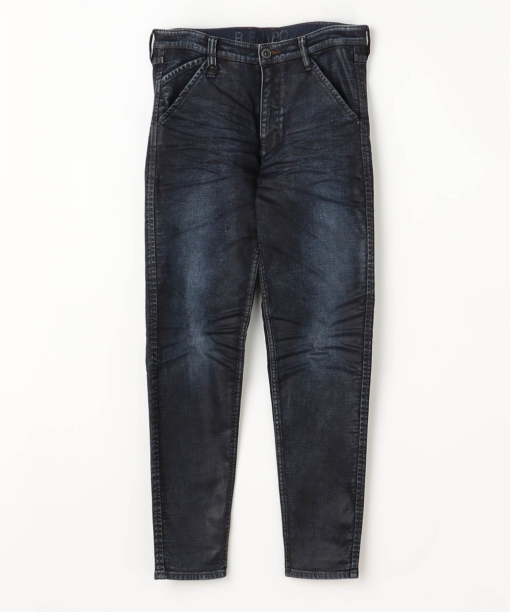 11オンス位のハイストレッチジャージ素材。49ブラックは硫化染めのブラックジャージデニム、60ブルーと67ネイビーは、濃色のインディゴ染めのジャージデニム素材。マルチなストレッチ性がありながら、張り感・コシのあるしっかりした風合いなので加工栄えするが特徴です。