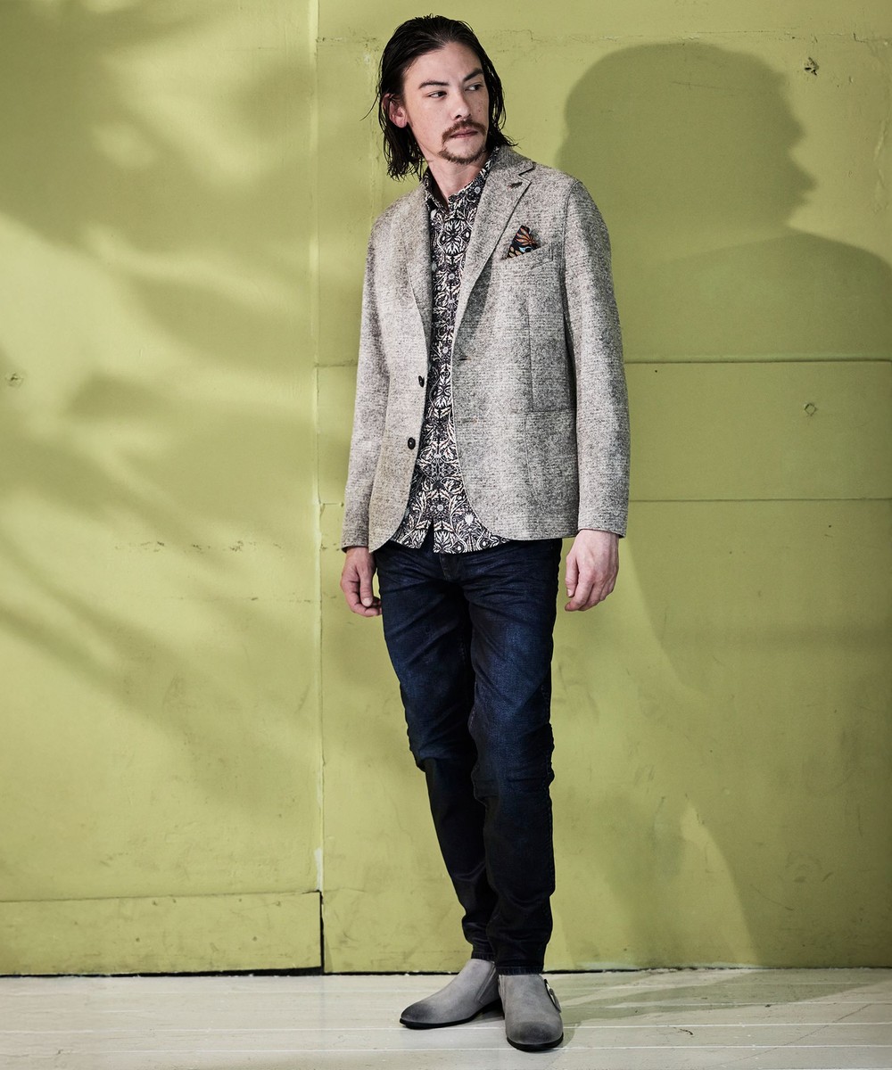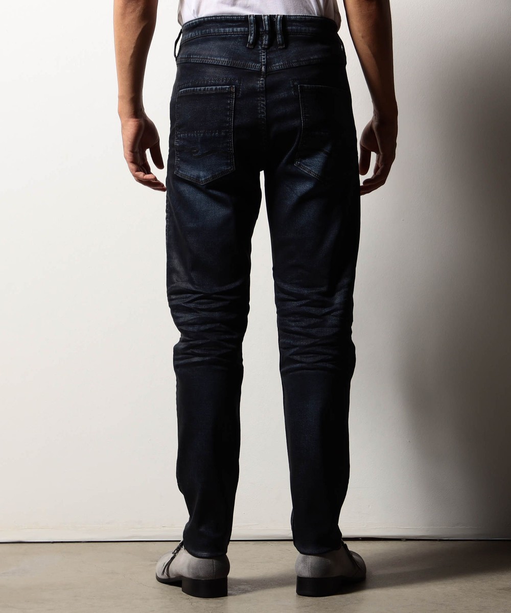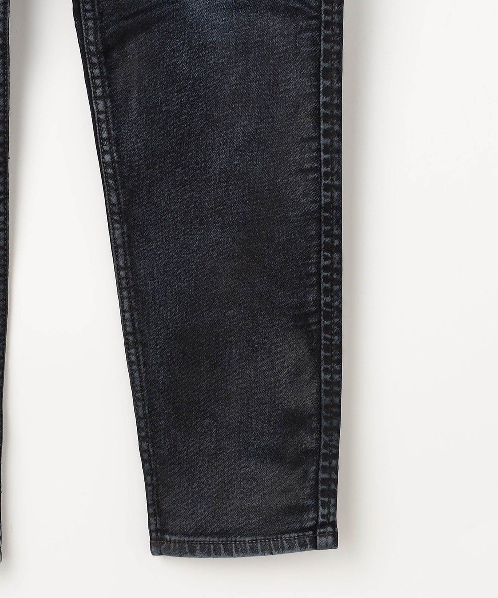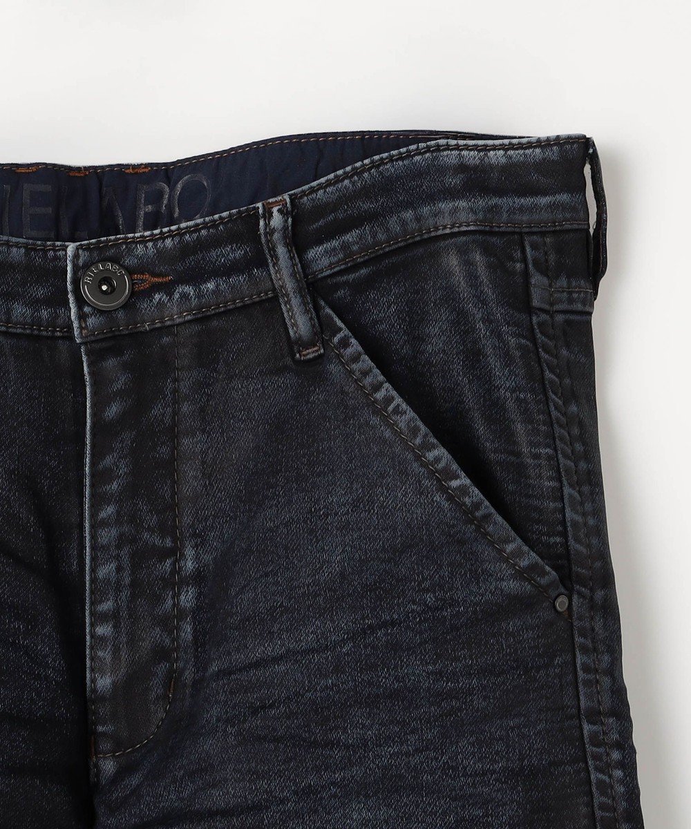 11オンス位のハイストレッチジャージ素材。49ブラックは硫化染めのブラックジャージデニム、60ブルーと67ネイビーは、濃色のインディゴ染めのジャージデニム素材。マルチなストレッチ性がありながら、張り感・コシのあるしっかりした風合いなので加工栄えするが特徴です。