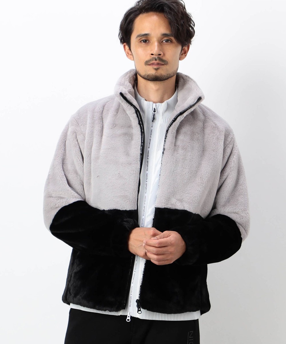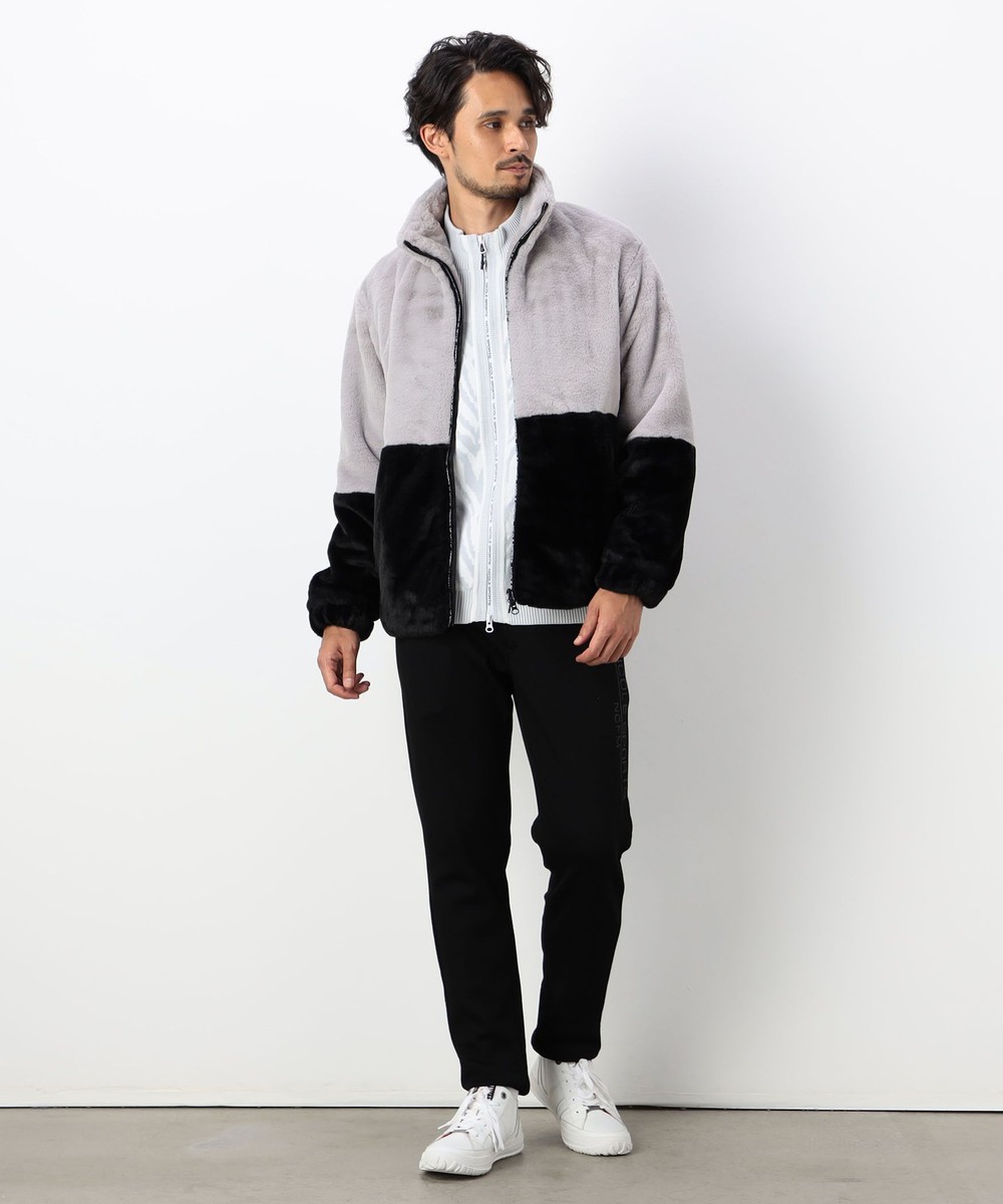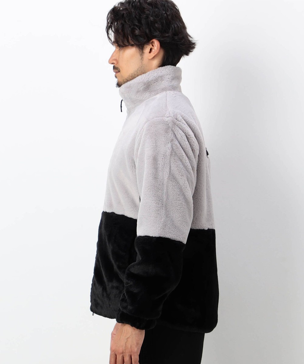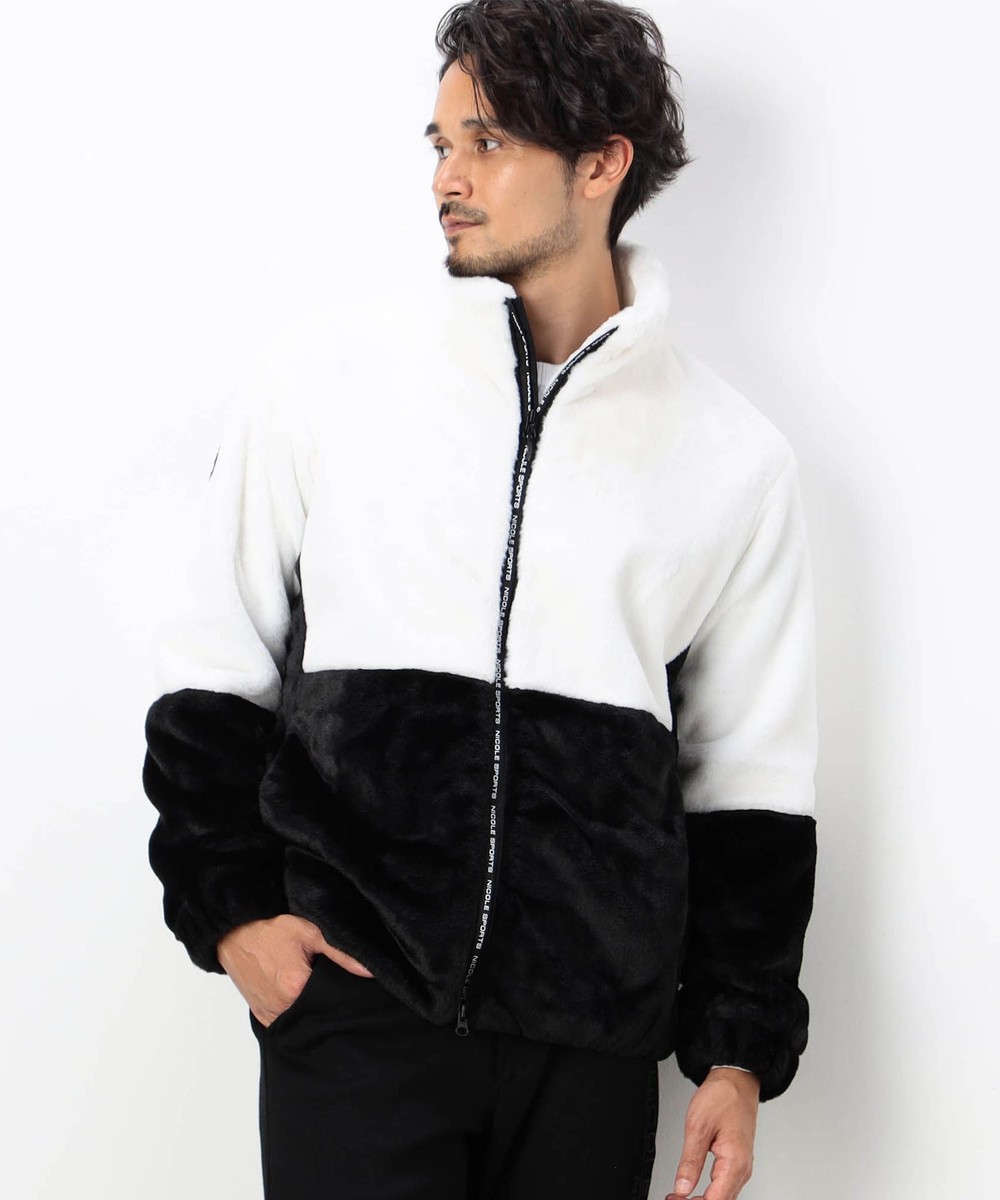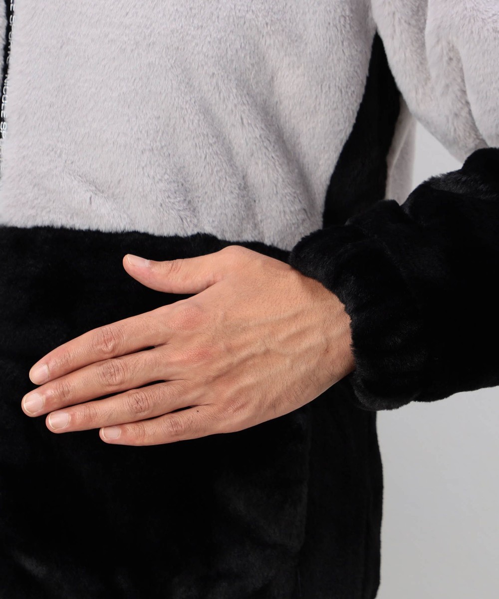 スタンドカラーのファーブルゾン。袖のバランスとウエスト~裾廻りを少しシェイプさせ、野暮ったいシルエットにならない様に調整しています。切り替えを利用した配色デザインと、その切り替えを利用してシルエットを作っています。後身から右袖にまたがせたパッチワークロゴ刺繍をアクセントにしています。裾裏にはしっかりとした不織布タイプの芯地を貼った別生地仕様、袖口には平ゴムを仕込み防風性を高めています。厚手のポリエステル別布を使用して厚み解消やファスナー噛みの防止の持ち出しを作っています。